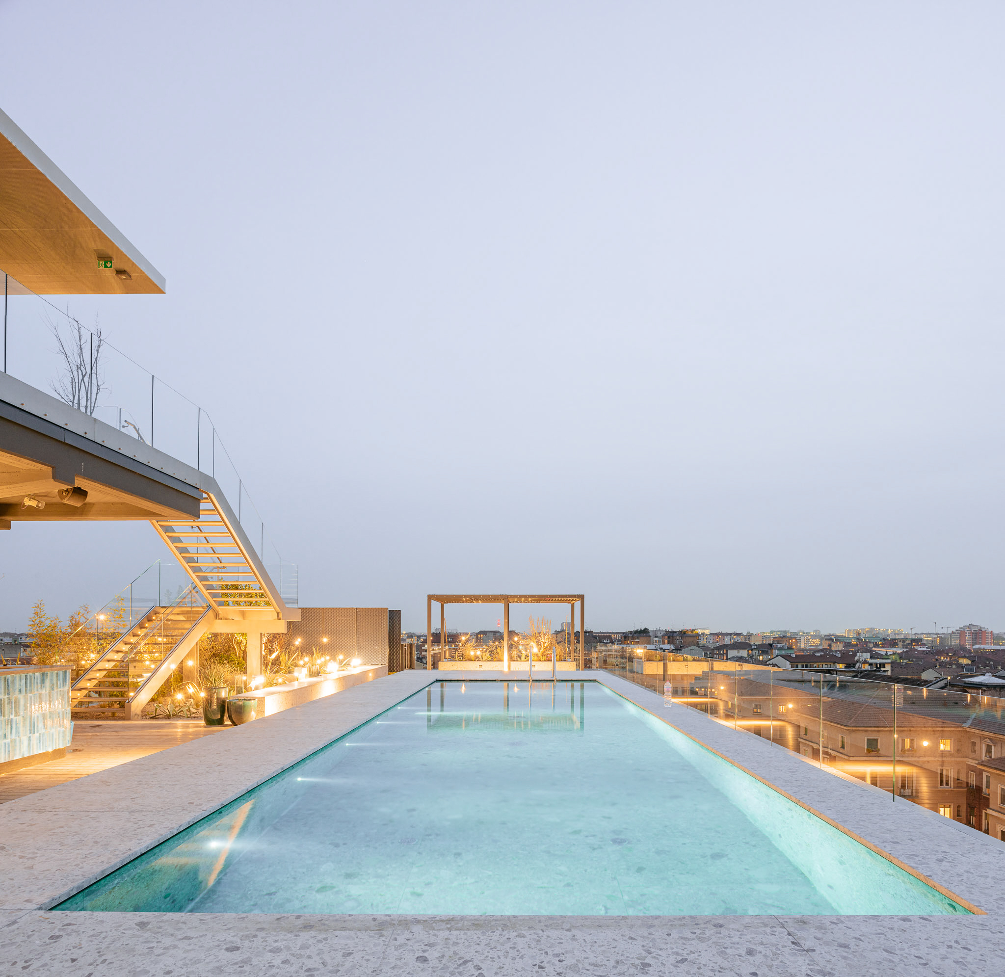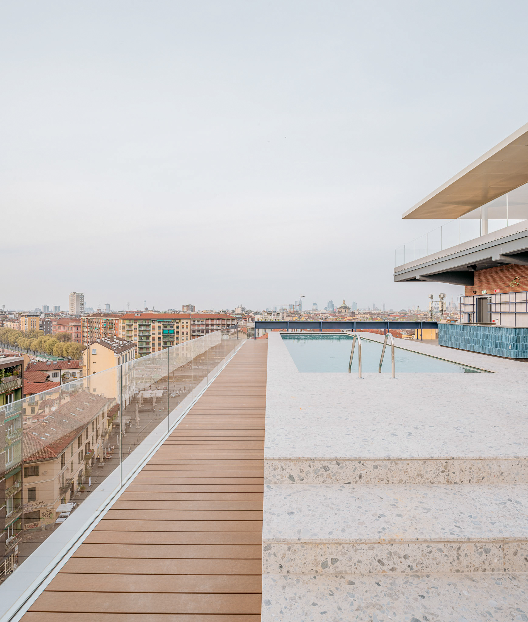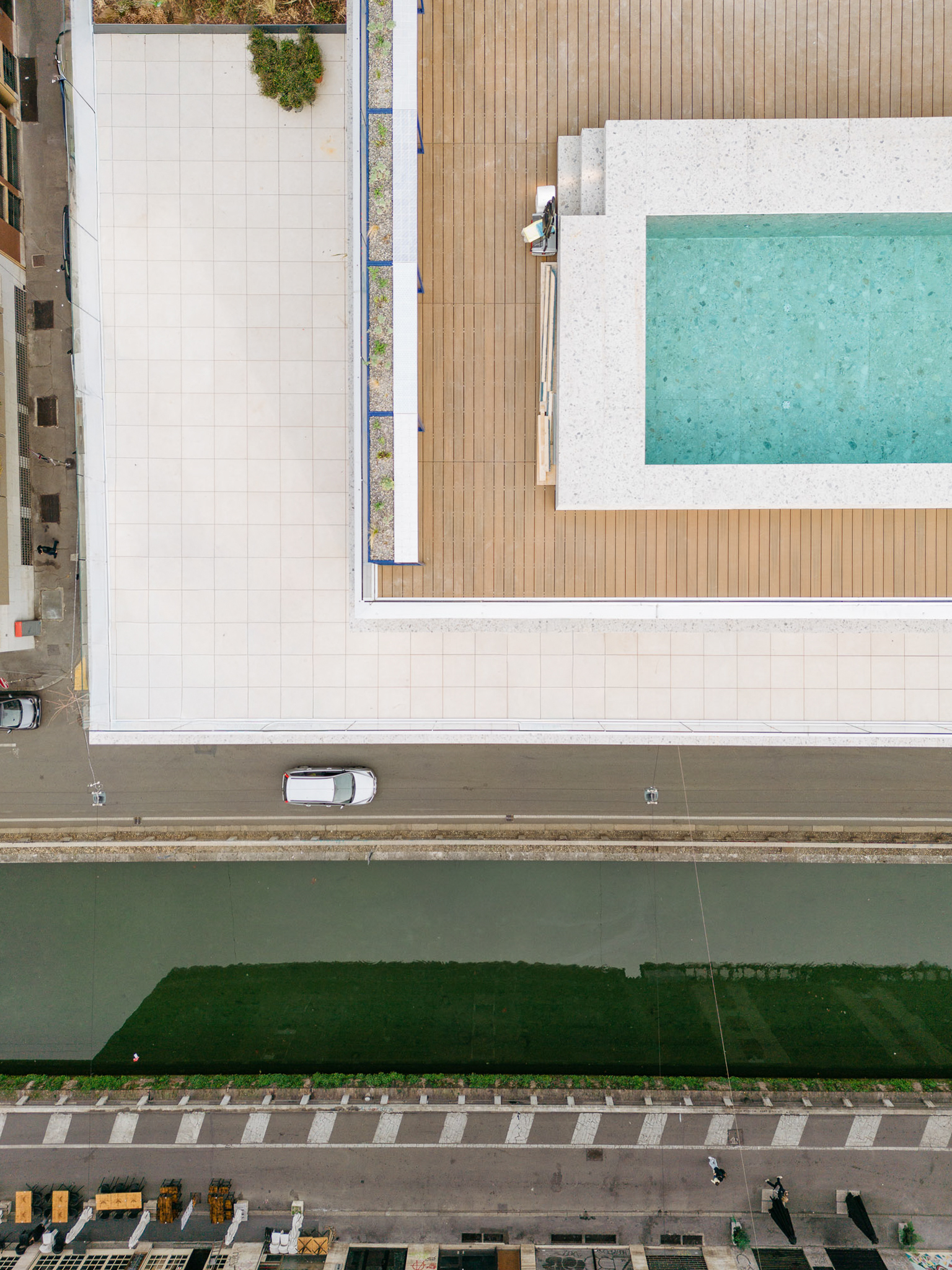 21 House of Stories, hotel moderno nel quartiere Navigli di Milano, unisce ospitalità, creatività, lavoro e convivialità. Il terrazzo di Agglotech è stato utilizzato per rivestire e impreziosire la struttura, creando continuità tra l’interno e l’esterno, tra movimento e quiete. Ai piani alti del complesso, si trova la piscina, una meravigliosa oasi sospesa tra il cielo e le linee architettoniche. Qui, il terrazzo ne definisce il perimetro con raffinatezza e personalità, creando un gioco di riflessi che trasforma un momento di relax in una vera e propria esperienza sensoriale. Anche le facciate esterne sono state rivestite da Agglotech con tonalità eleganti e naturali che conferiscono profondità e armonia. La luce del giorno mette in risalto le sfumature, mentre alla sera la superficie diventa parte della vita luminosa della città.