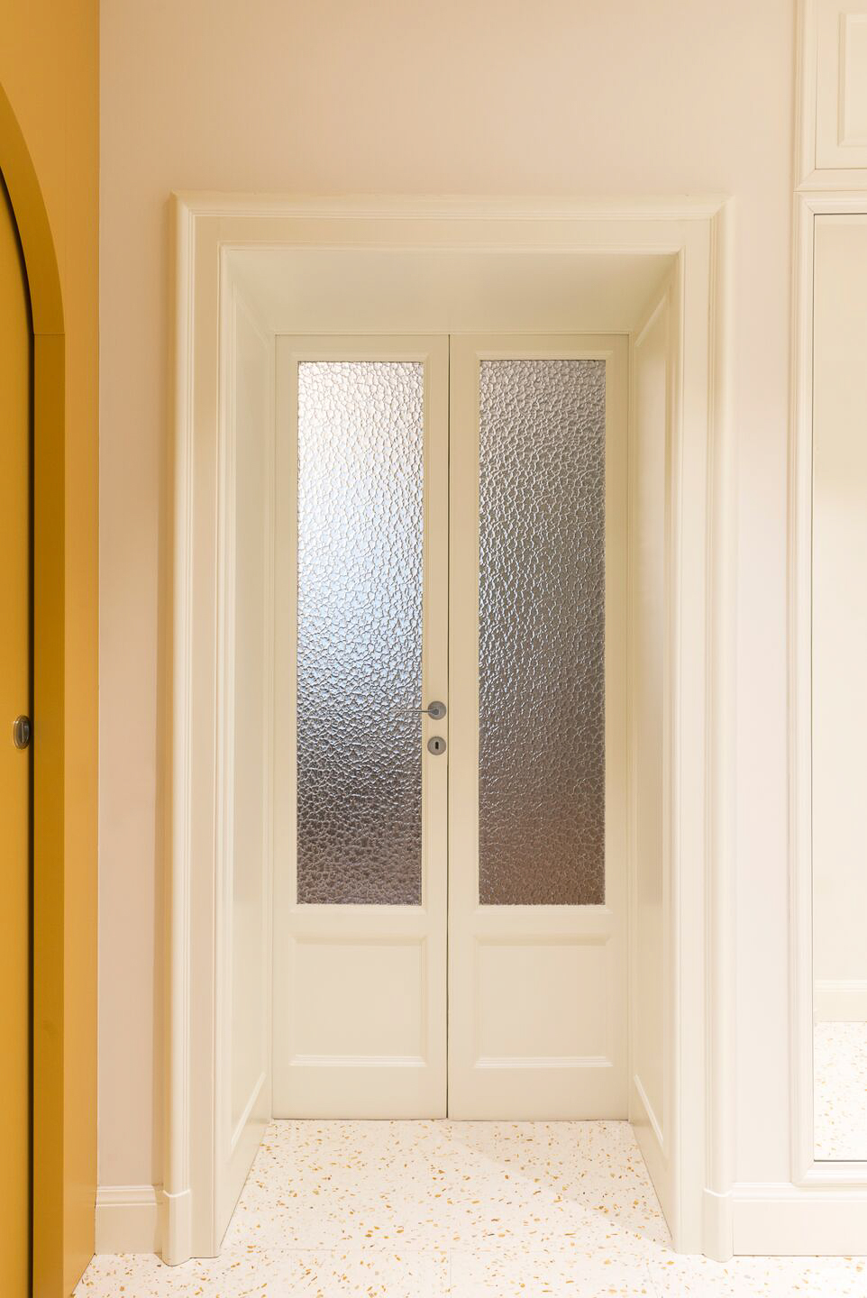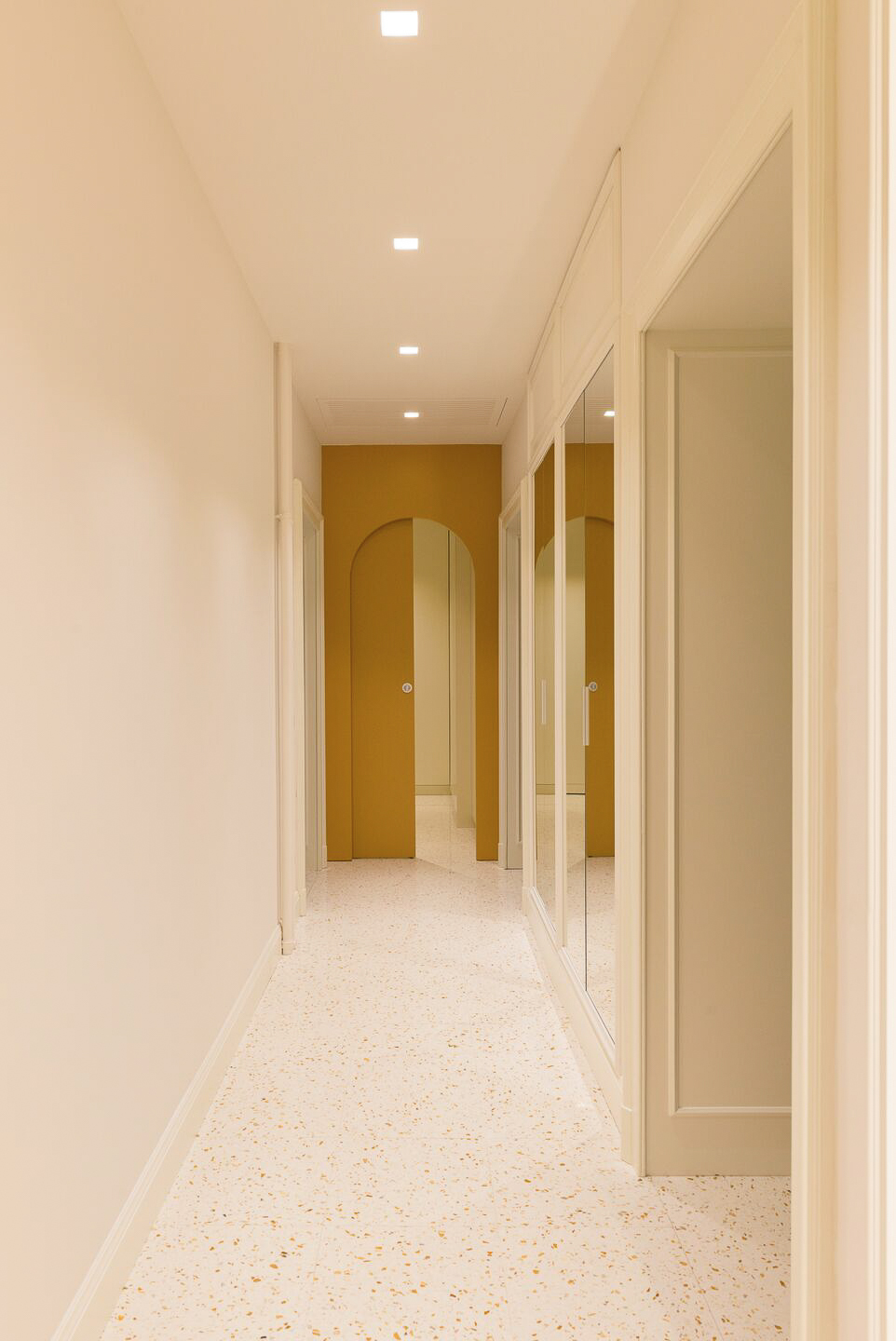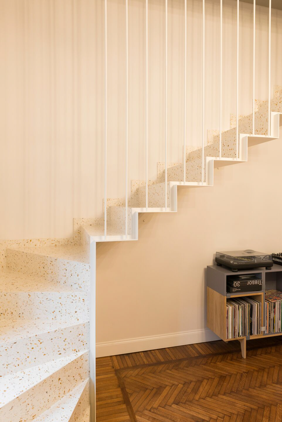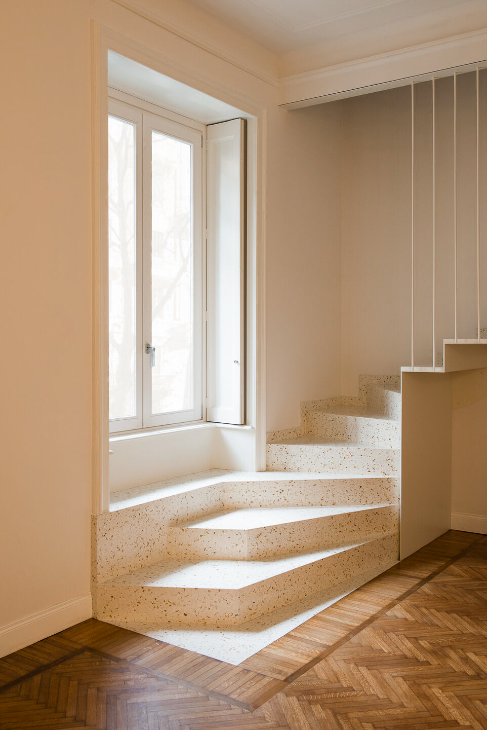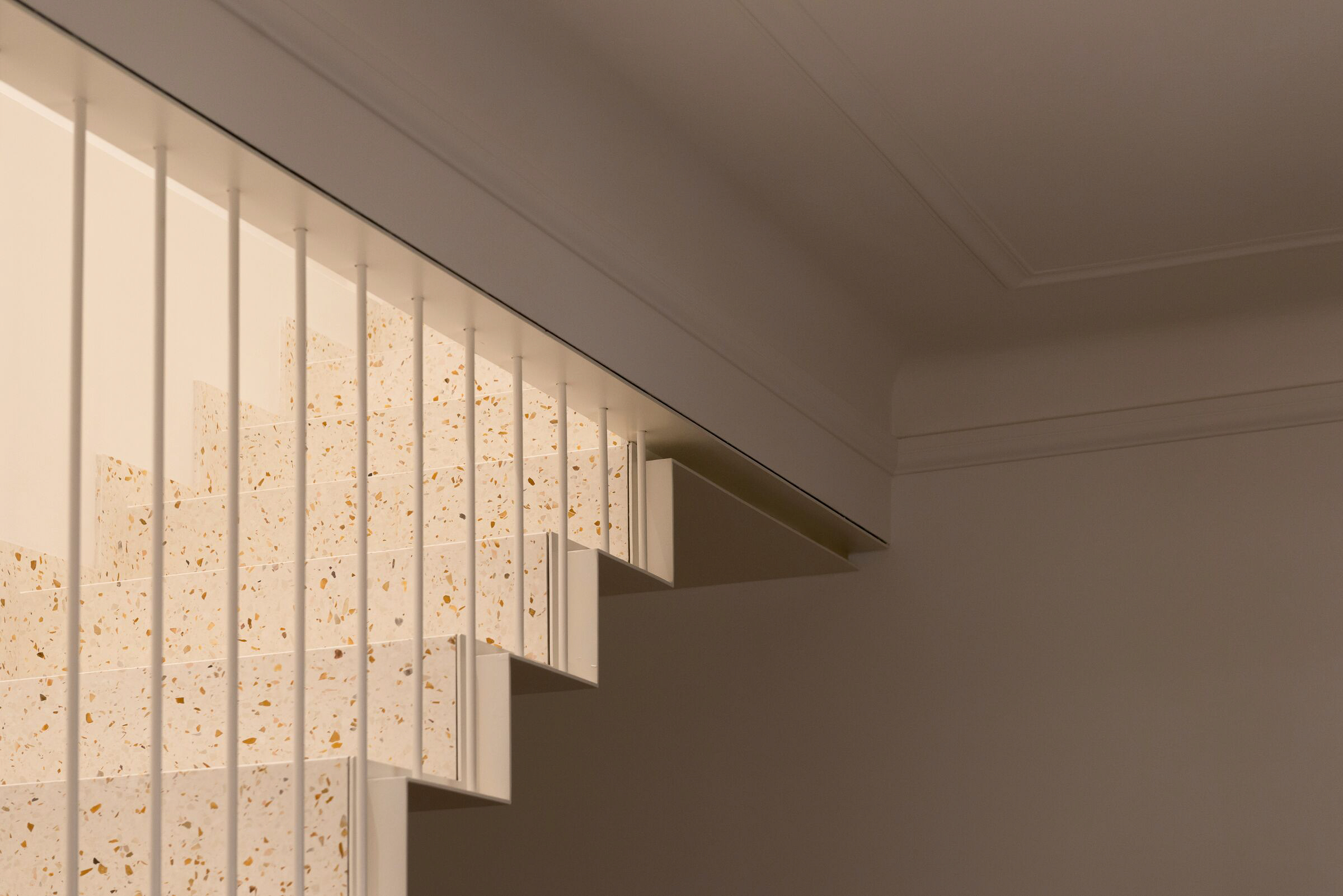 La scelta del colore SB 140 Ca’d’Oro per la scala interna dona un tono caldo e naturale agli ambienti, esaltando la luce e la continuità delle superfici. La graniglia di marmo di medie dimensioni crea un disegno sinuoso e luminoso, rendendo la scala un elemento architettonico di spicco: un cuore scenografico che collega i piani con leggerezza e armonia visiva.