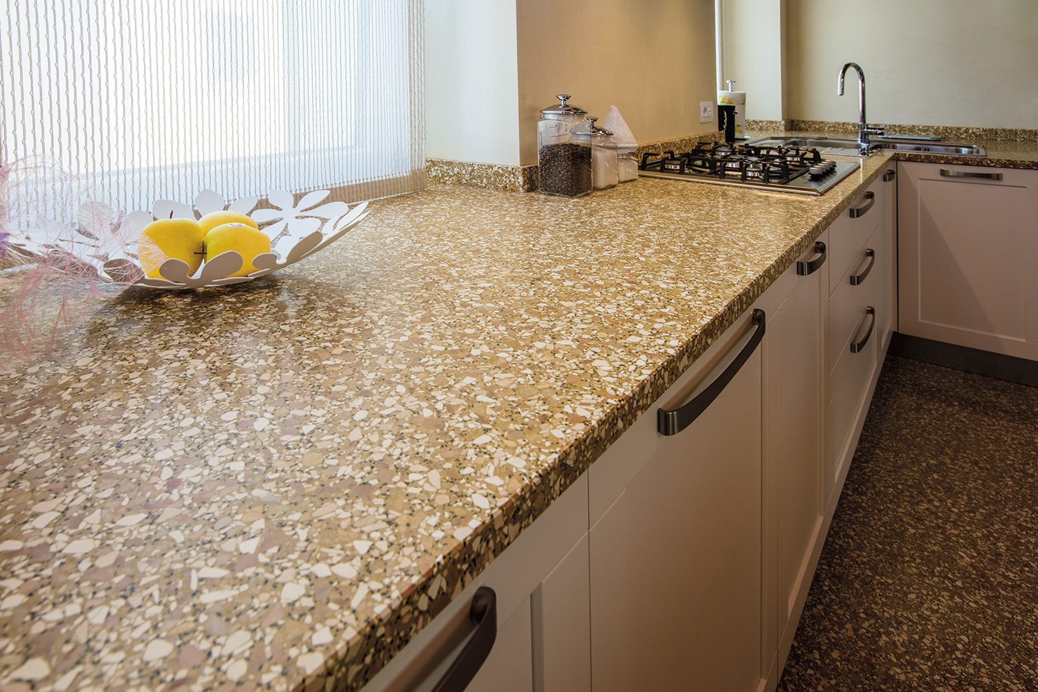 Per pavimenti, rivestimenti e top cucina è stato scelto il terrazzo SB 141 Multicolor Verona. La graniglia di marmo rosso di Verona su base cementizia color ocra conferisce calore e personalità agli interni, creando un equilibrio perfetto con gli arredi dal gusto tradizionale e moderno.
