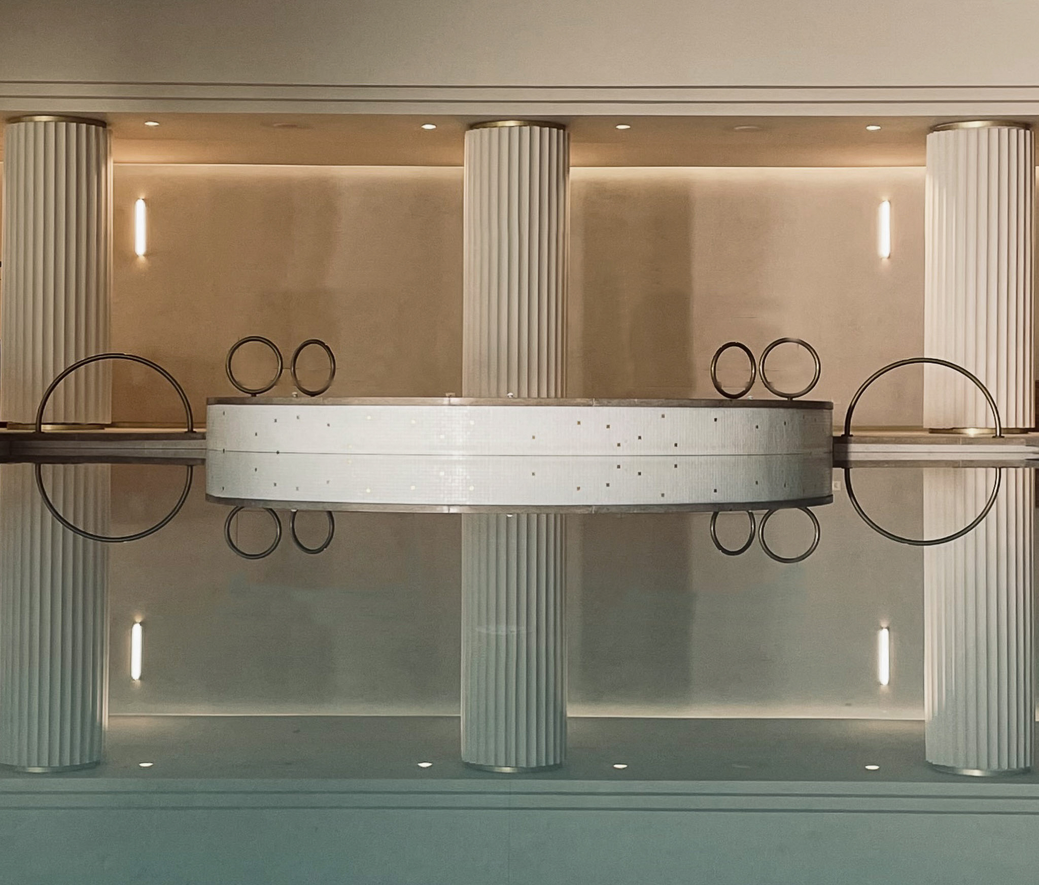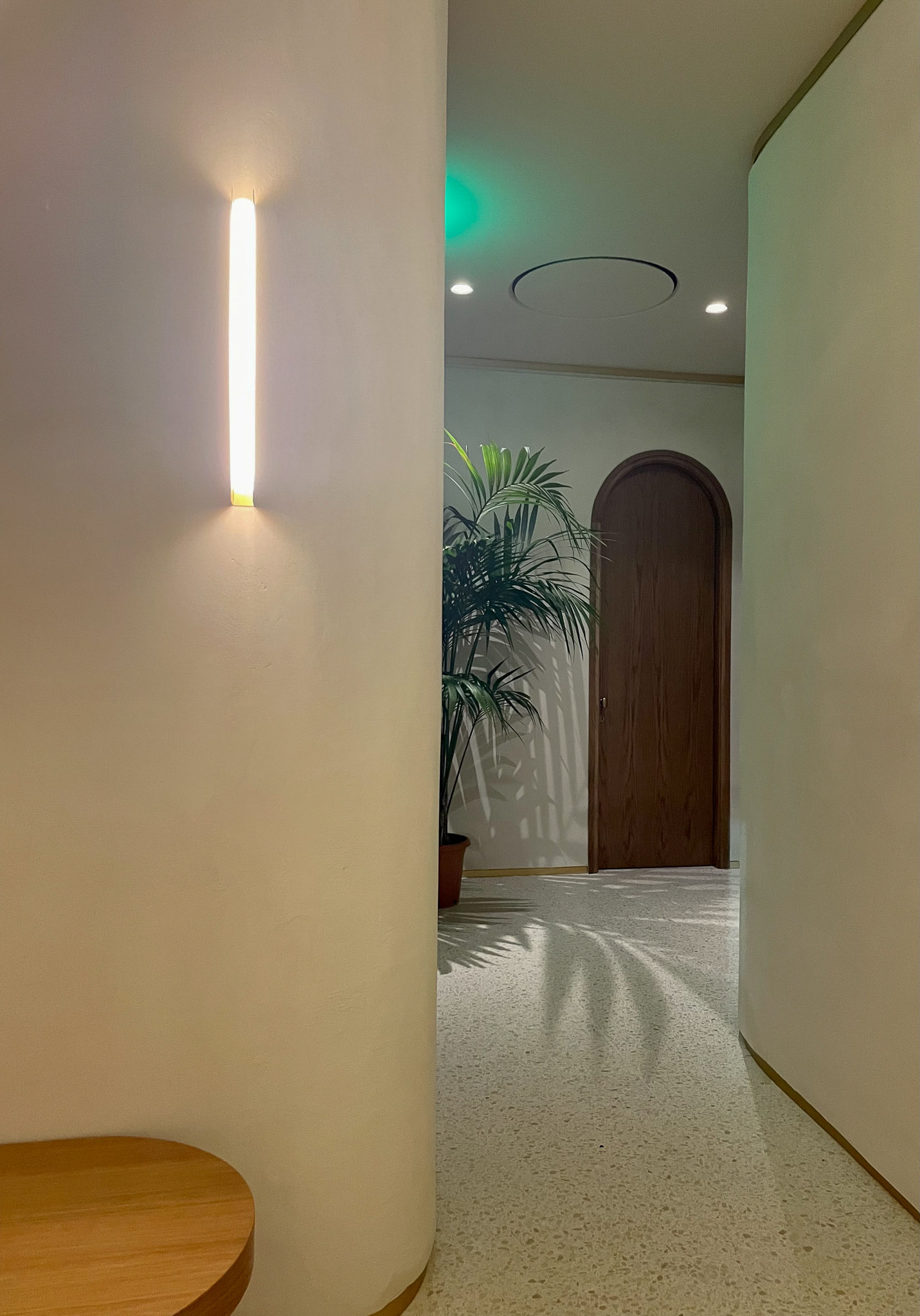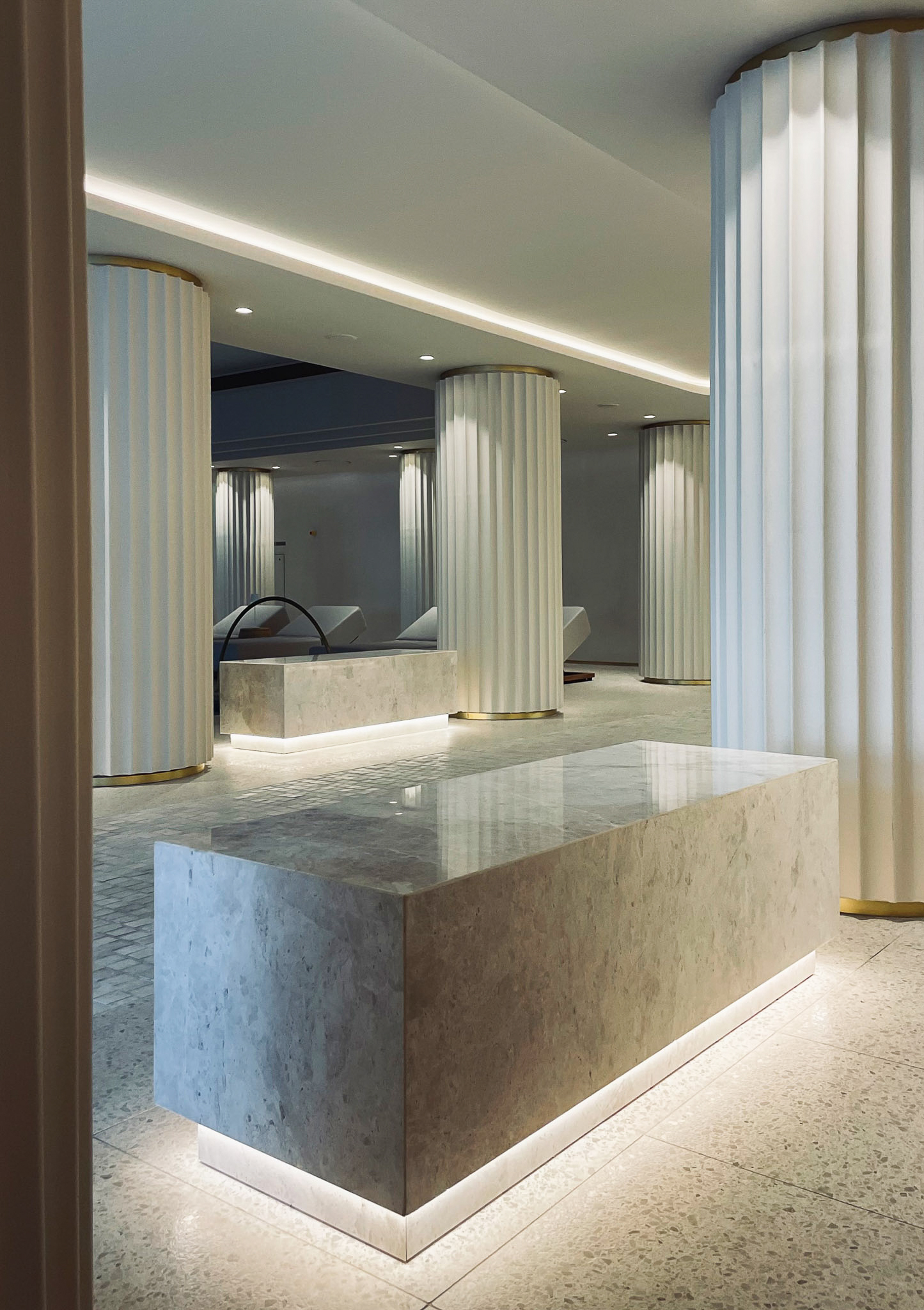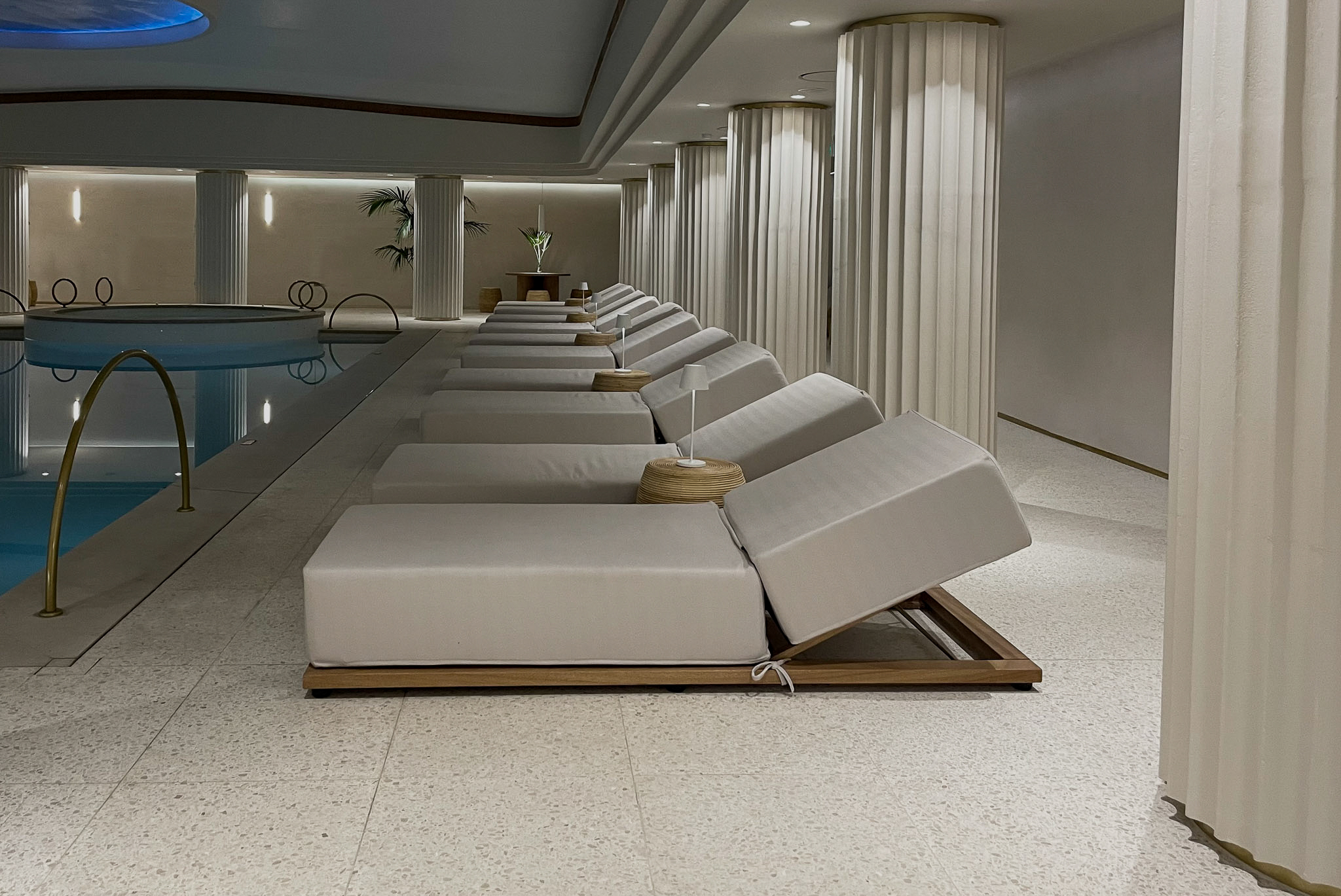 Pavimenti, rivestimenti e zona piscina vengono coordinati attraverso un uso coerente del terrazzo, conferendo carattere, luminosità e precisione geometrica agli spazi. Il risultato è un insieme armonico, in cui la materia interpreta la luce naturale e accompagna gli ospiti in un percorso continuo tra ambienti interni ed esterni.