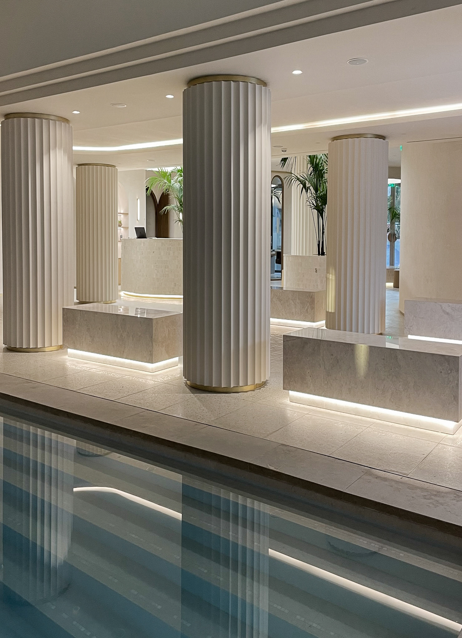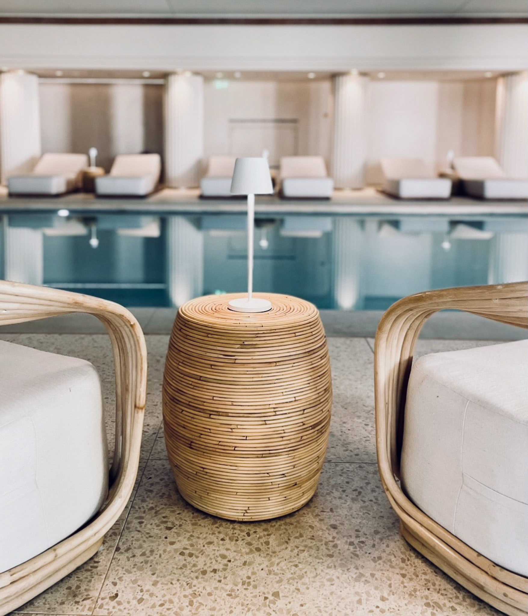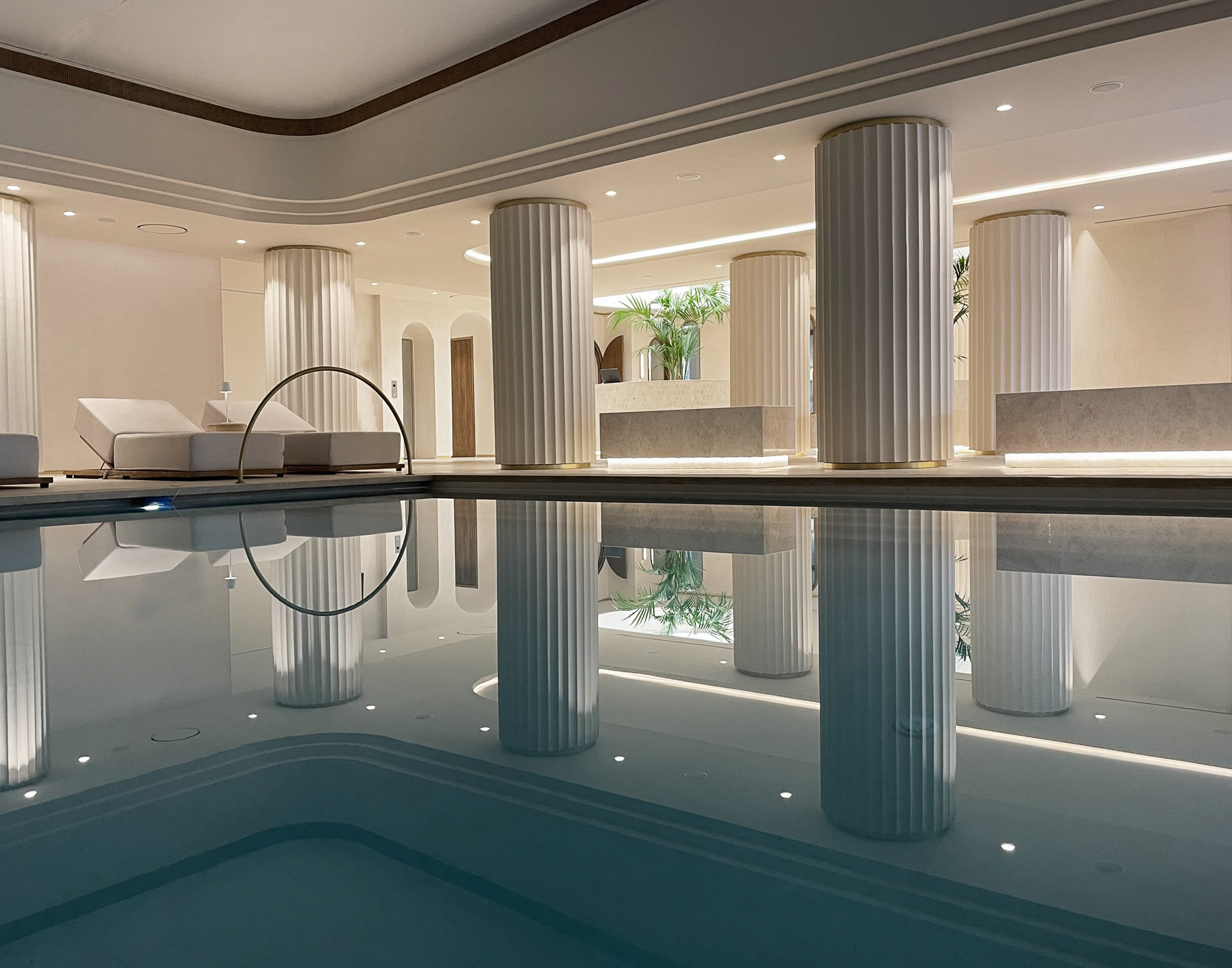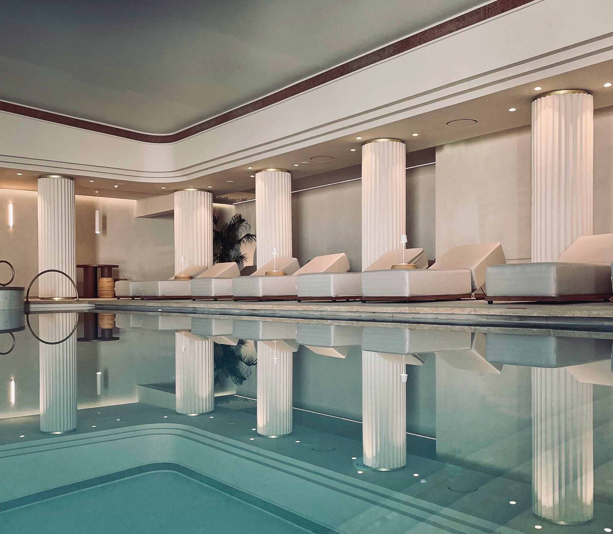 Pavimenti, rivestimenti e zona piscina vengono coordinati attraverso un uso coerente del terrazzo, conferendo carattere, luminosità e precisione geometrica agli spazi. Il risultato è un insieme armonico, in cui la materia interpreta la luce naturale e accompagna gli ospiti in un percorso continuo tra ambienti interni ed esterni.