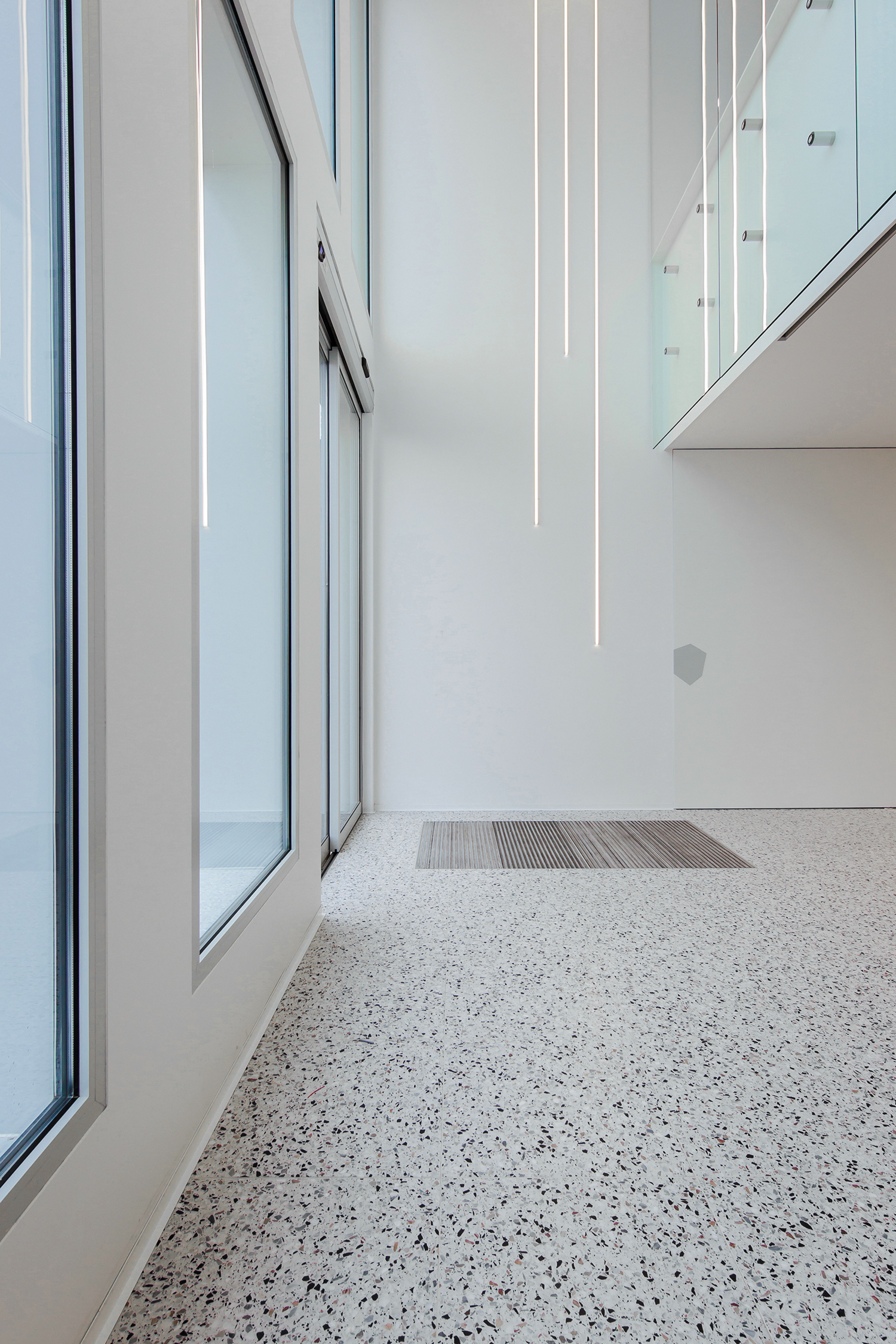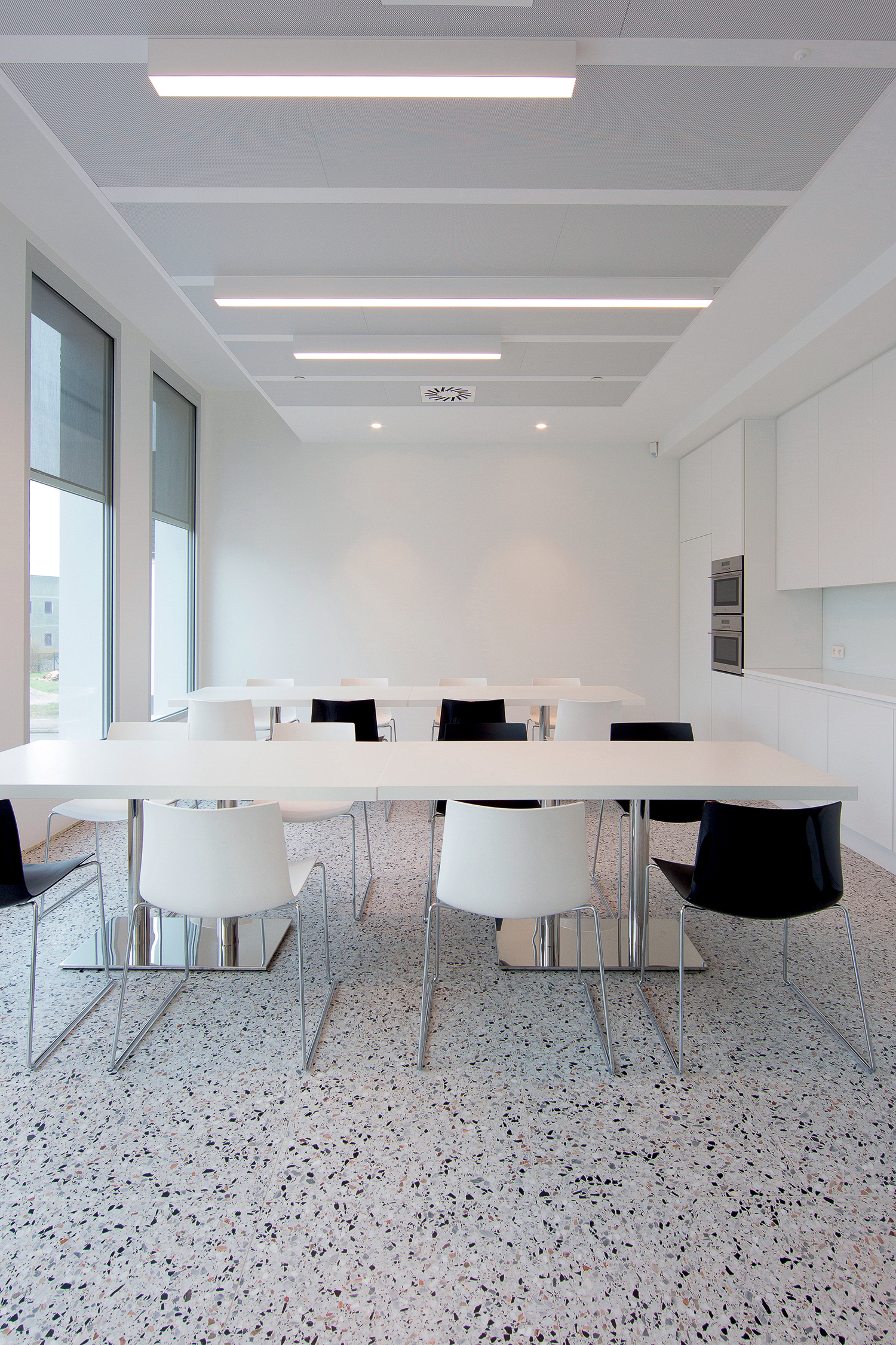 I progettisti hanno scelto la colorazione SB 173 Grigio Venato caratterizzata da tonalità tra bianco e marrone, unite a scaglie di marmo di diverse dimensioni, per esprimere uno stile sobrio ma al tempo stesso deciso. Il risultato è una superficie elegante e dinamica, ideale come pavimentazione per uffici moderni.