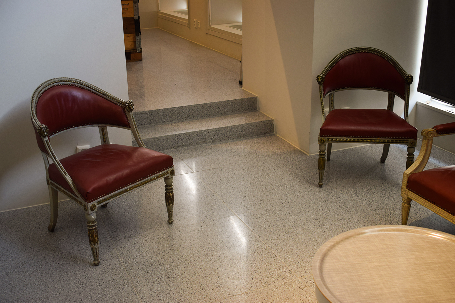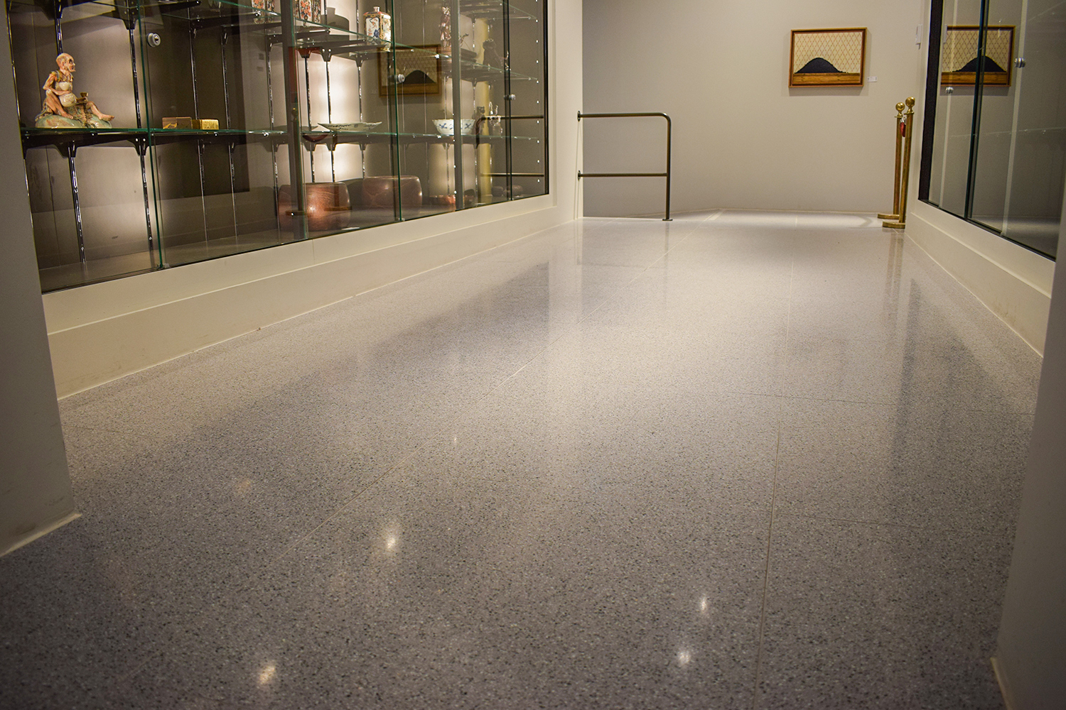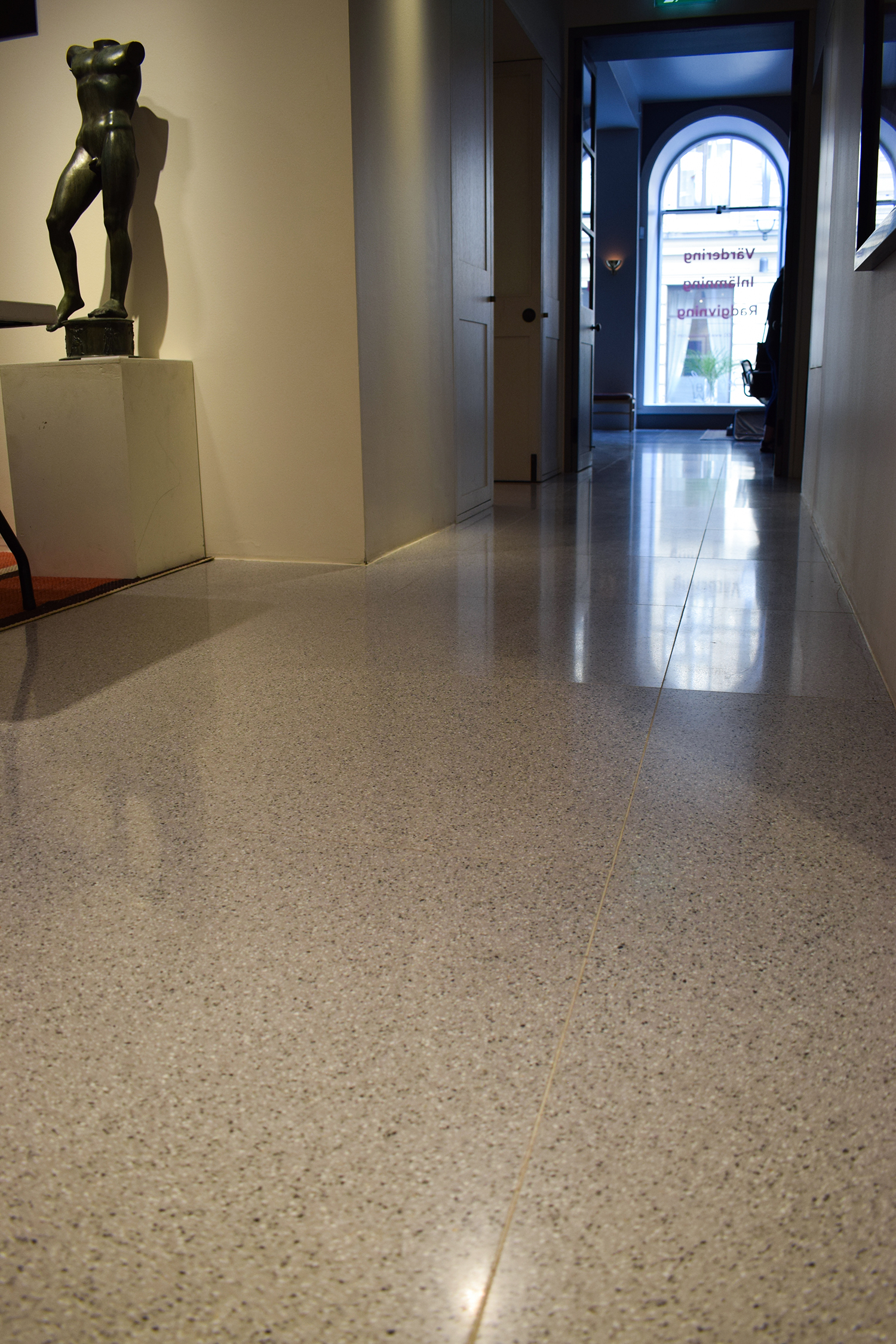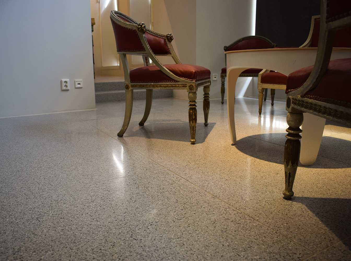 Per il restyling degli interni è stata scelta la colorazione SB 103 Grigio Medio, nella quale la graniglia di piccole dimensioni a contrasto crea un effetto elegante e lineare, perfetto come sfondo neutro e raffinato per le preziose opere d’arte e antiquariato esposte.