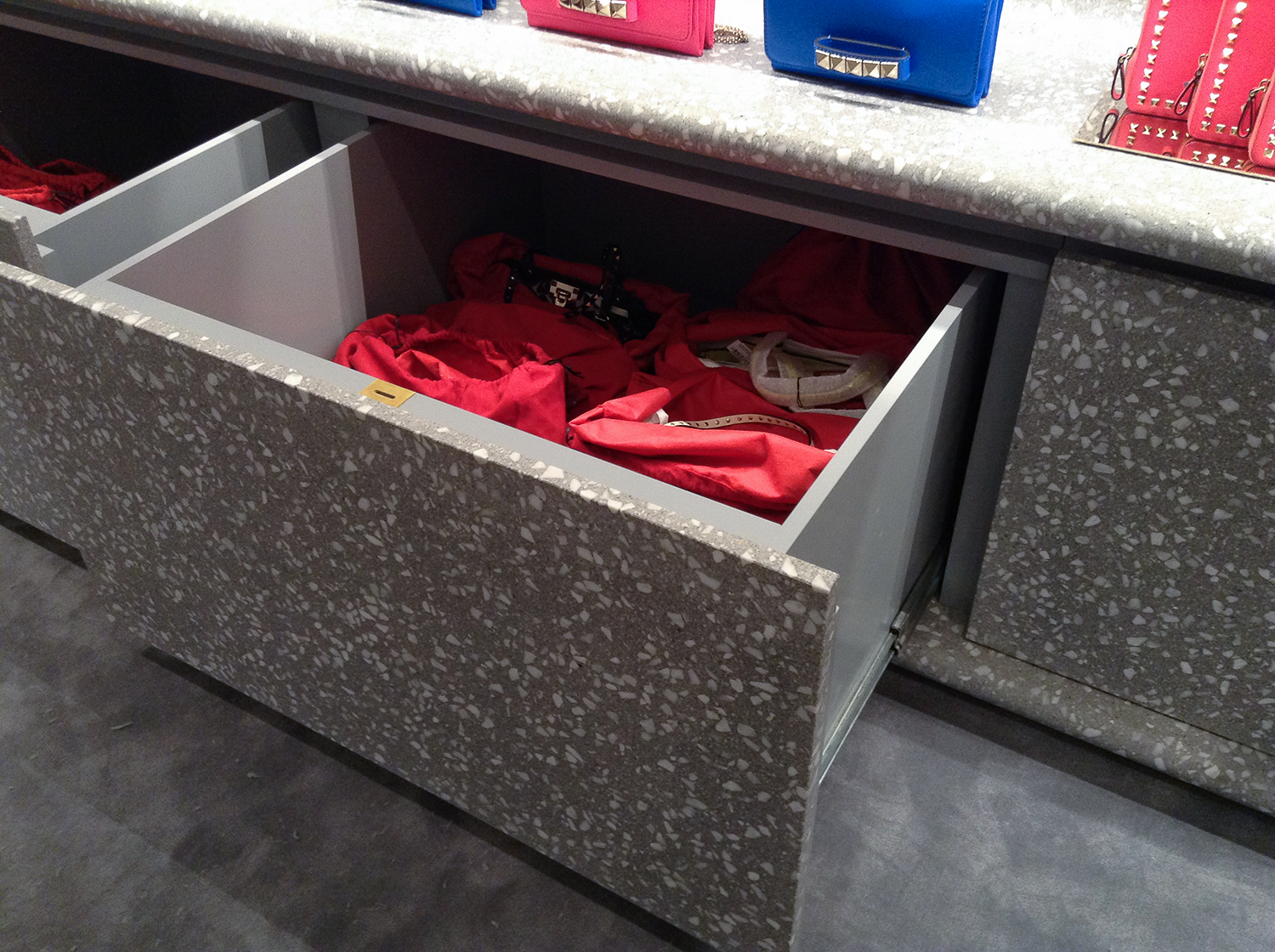 Per il corner londinese è stata sviluppata la colorazione personalizzata REG 1712, creata in esclusiva da Agglotech in collaborazione con Valentino. La progettazione ha previsto uno studio condiviso su dimensioni, tagli e spessori del marmo cemento da utilizzare, così da garantire la massima resa estetica e funzionale.