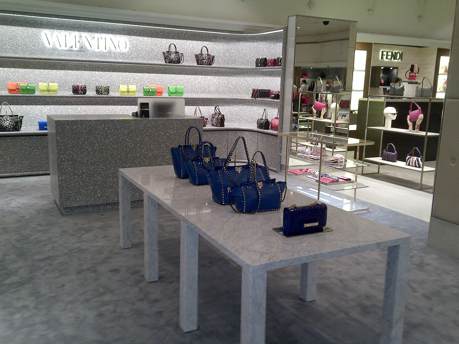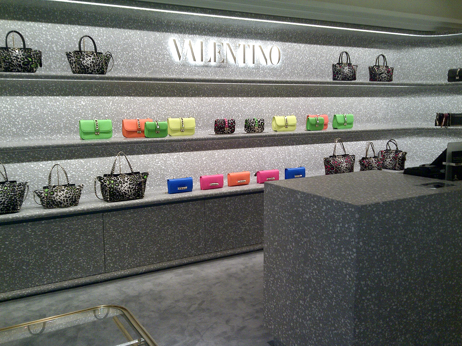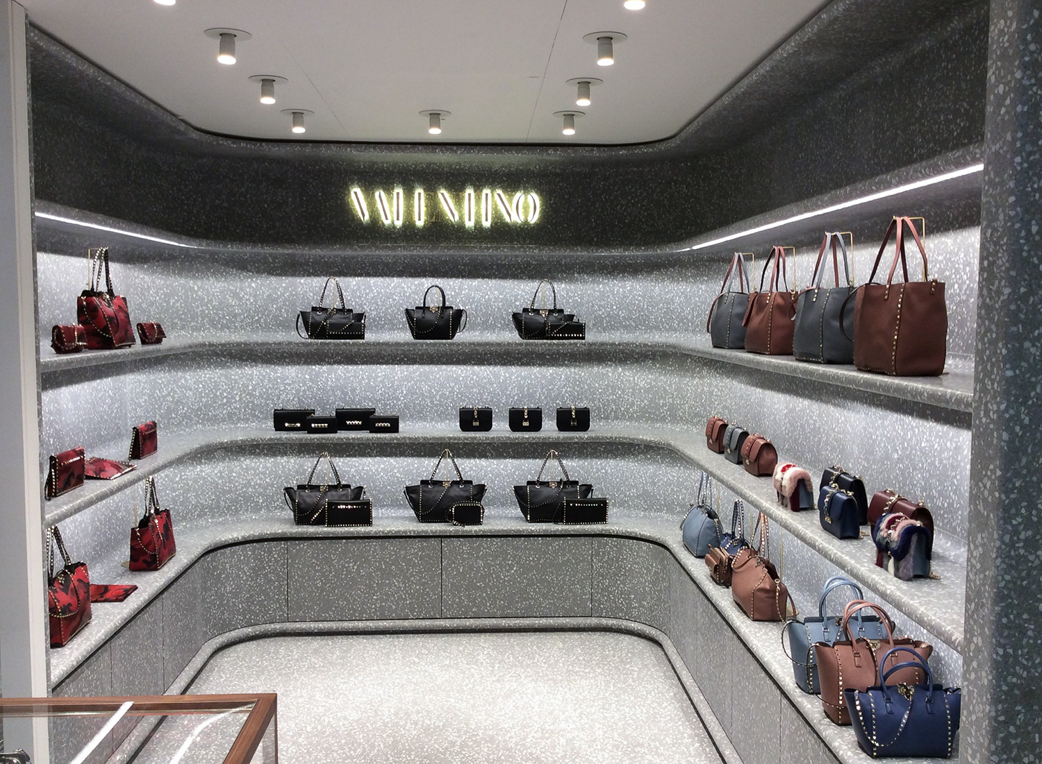 Nel 2017 il corner Valentino all’interno dei celebri magazzini Harrods di Londra è stato rinnovato secondo il concept seguito in tutti i nuovi store della maison. Per questo progetto, i rivestimenti delle pareti, i banconi, le mensole e diversi elementi speciali sono stati realizzati interamente in terrazzo Agglotech, a testimonianza dell’unicità del materiale italiano.