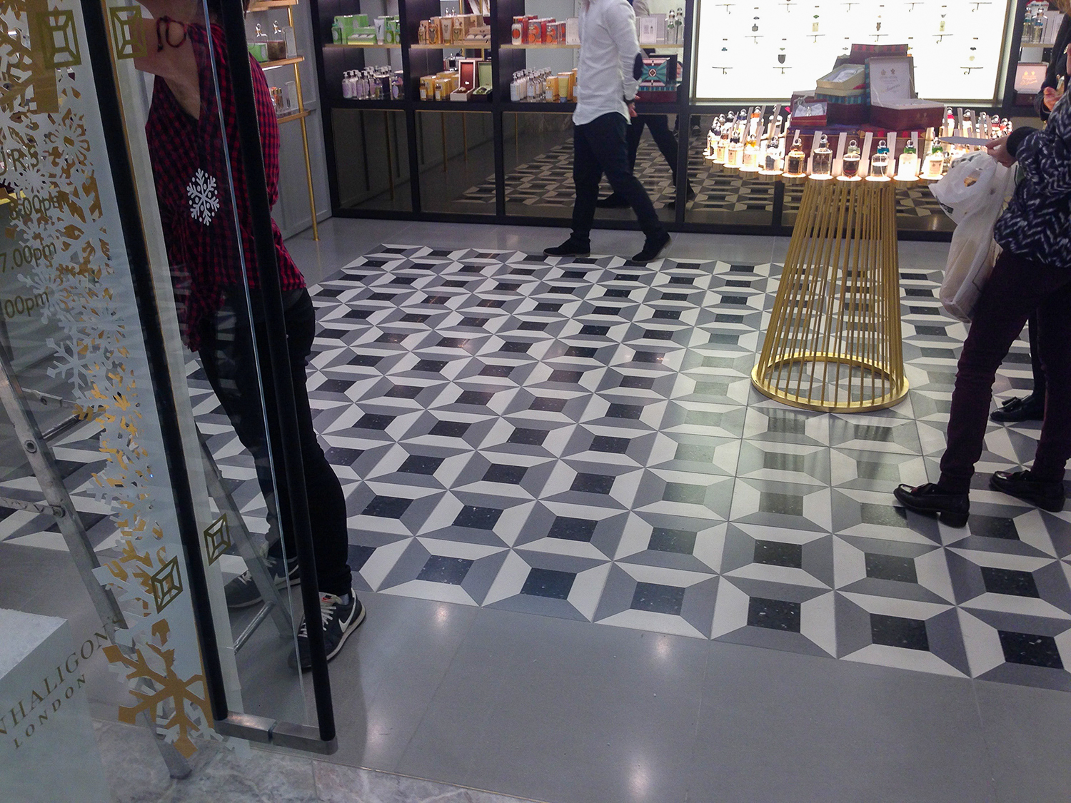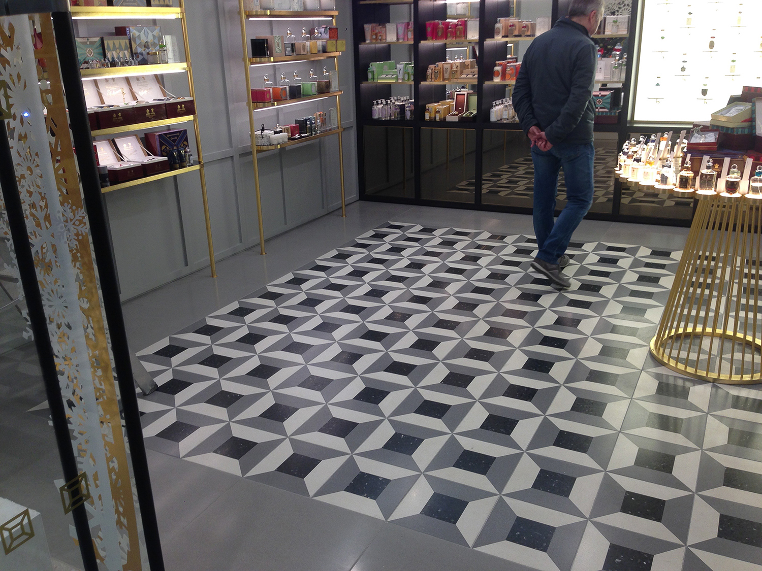 For the Penhaligon’s Store London project, Agglotech supplied three colorations: SB 1000 Thassos, a brilliant white obtained with Thassos marble chips on a light cement base, SB 151 Zinco, a medium-intensity smoke grey, and SB 148 Grafite, a deeper and more decisive grey. The combination of these three shades made it possible to create a flooring with three-dimensional geometric design, original and refined, that brings movement and personality to the environment.