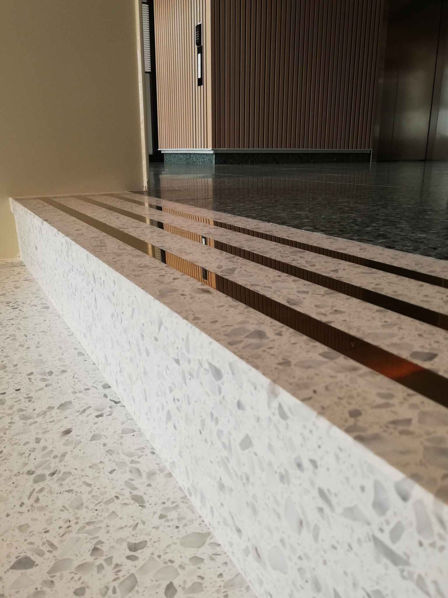 The quality of Agglotech material ensures resistance to wear, ease of maintenance and chromatic stability over time, offering a perfect solution for high-traffic public spaces such as healthcare environments.