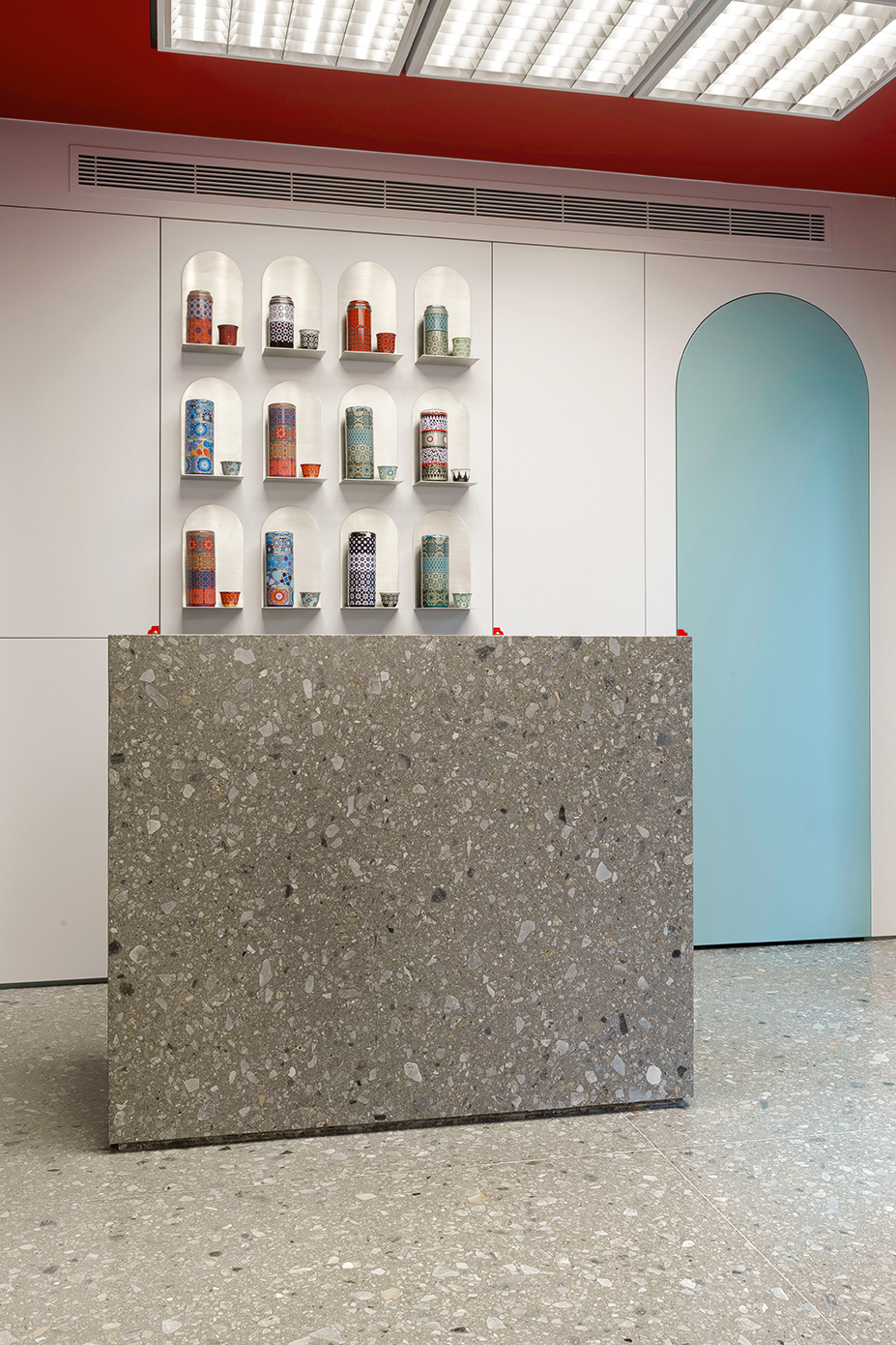 Il terrazzo Agglotech nella colorazione SB 130 Aggloceppo, caratterizzato da un elegante sfondo grigio con graniglia di marmo di diverse dimensioni e tonalità, riveste tutti i pavimenti e alcuni arredi esclusivi dello store. Il contrasto con il soffitto rosso intenso crea un’atmosfera unica, dove tecnica ed estetica dialogano in perfetta armonia.