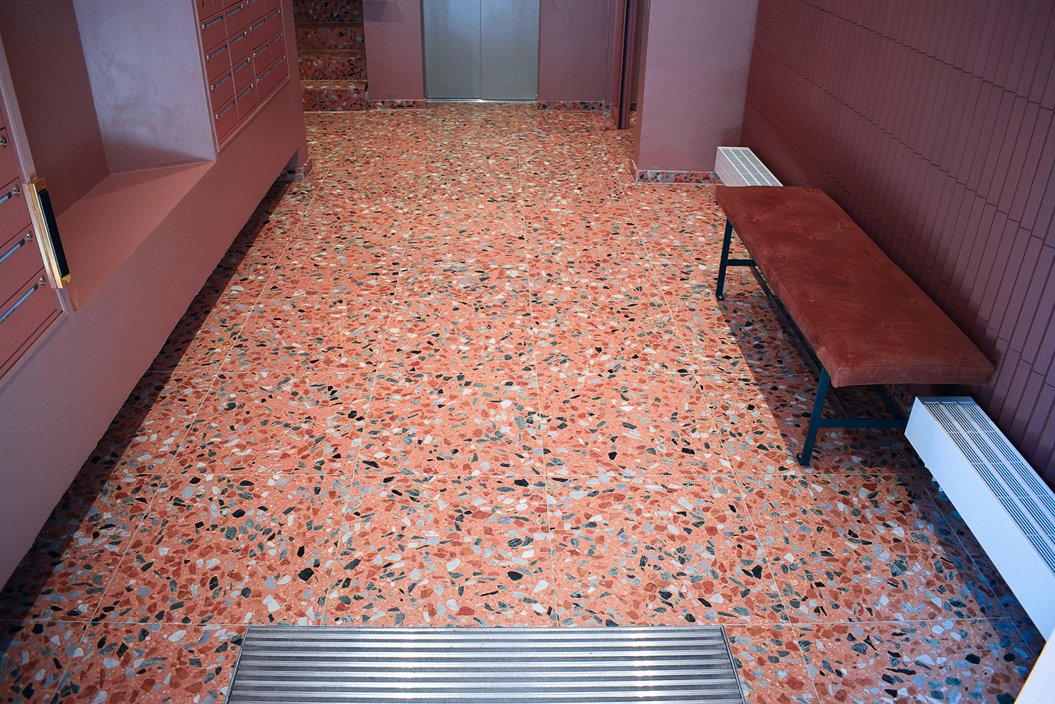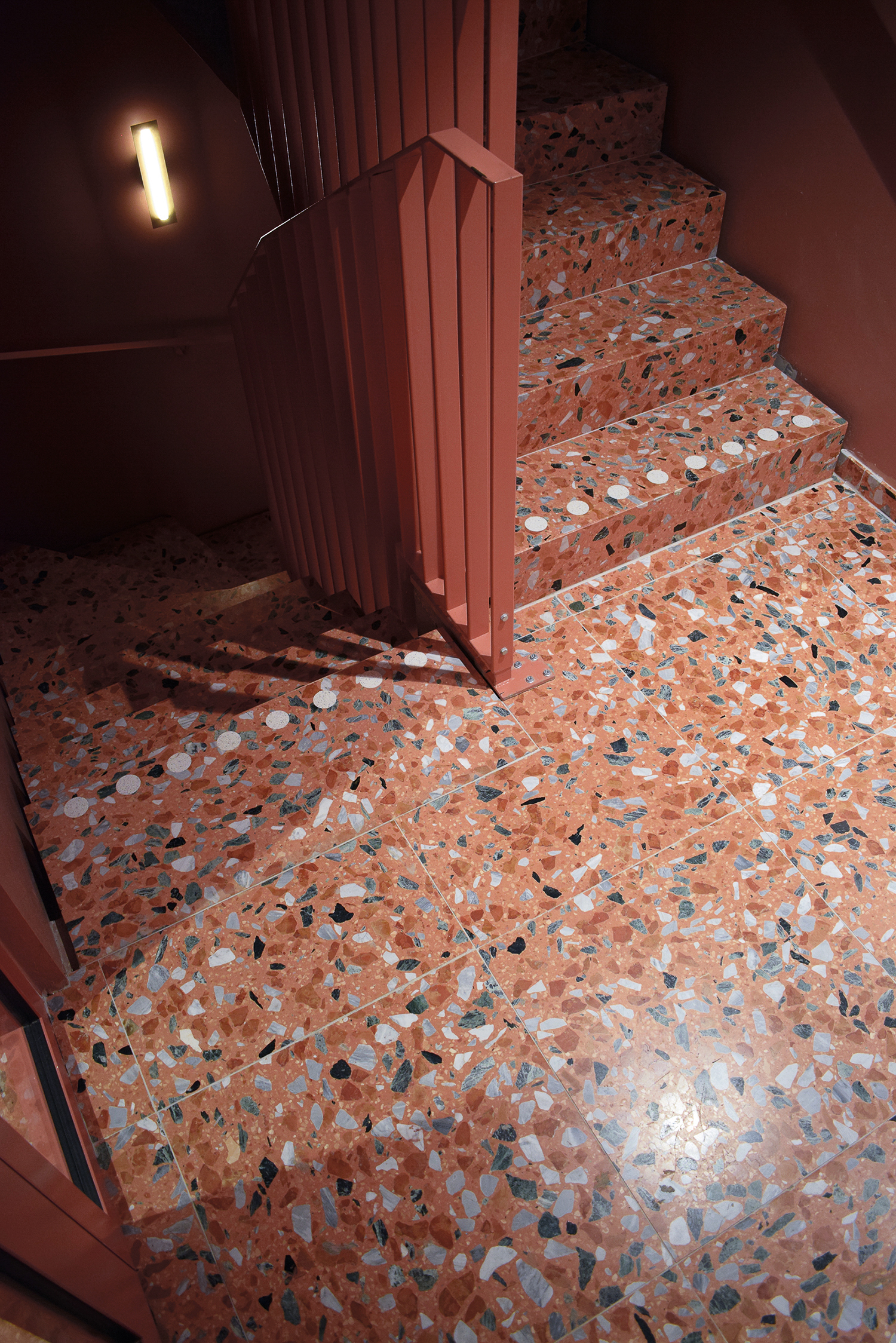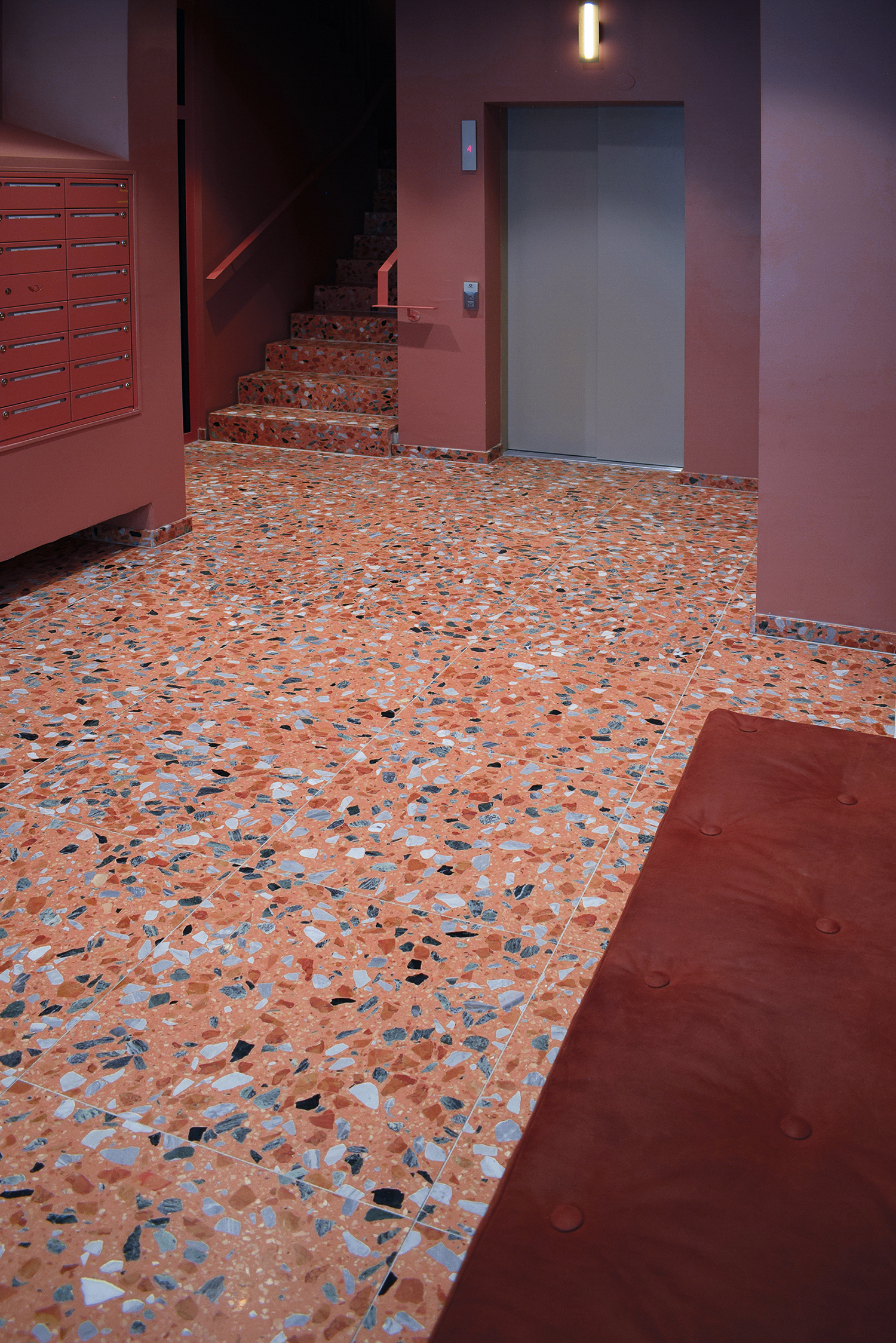 En collaboration avec le partenaire suédois Svensk Terrazzo-Teknik, Agglotech a fourni un terrazzo entièrement personnalisé REG 2965, caractérisé par une base rouge brique et des gravillons de marbre de grandes dimensions. Ce matériau unique a été utilisé pour les escaliers intérieurs, les revêtements des zones communes et pour le revêtement de certains éléments de mobilier réalisés sur mesure.