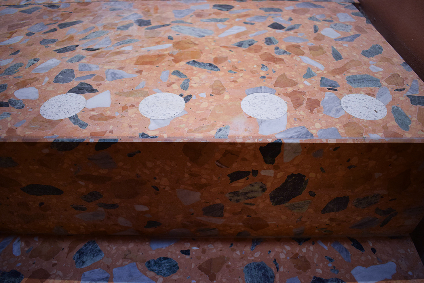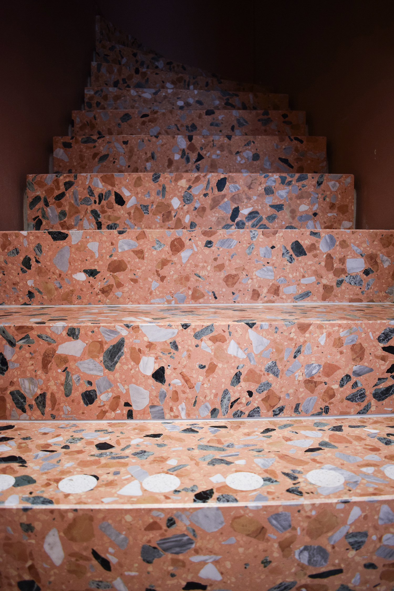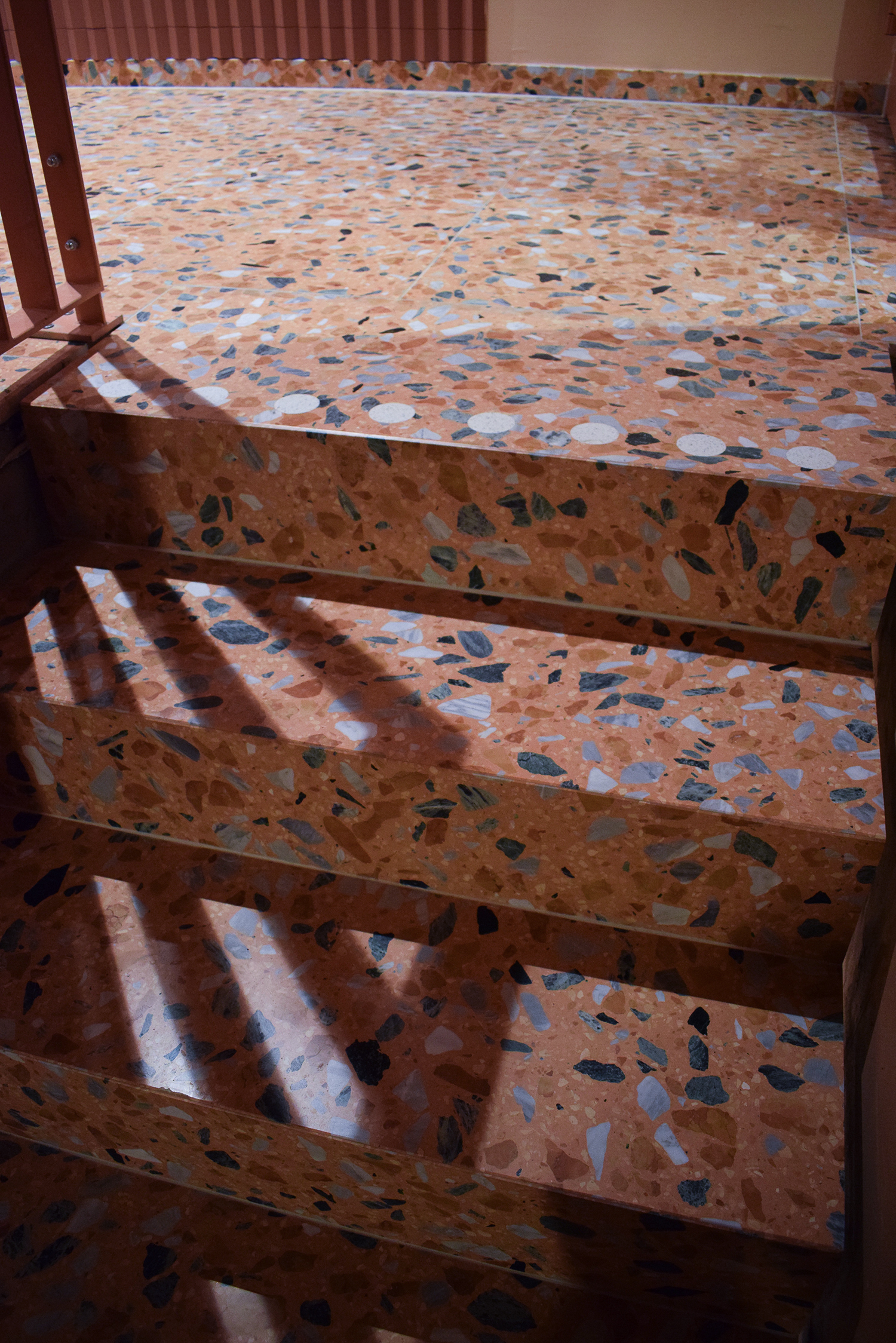 En collaboration avec le partenaire suédois Svensk Terrazzo-Teknik, Agglotech a fourni un terrazzo entièrement personnalisé REG 2965, caractérisé par une base rouge brique et des gravillons de marbre de grandes dimensions. Ce matériau unique a été utilisé pour les escaliers intérieurs, les revêtements des zones communes et pour le revêtement de certains éléments de mobilier réalisés sur mesure.