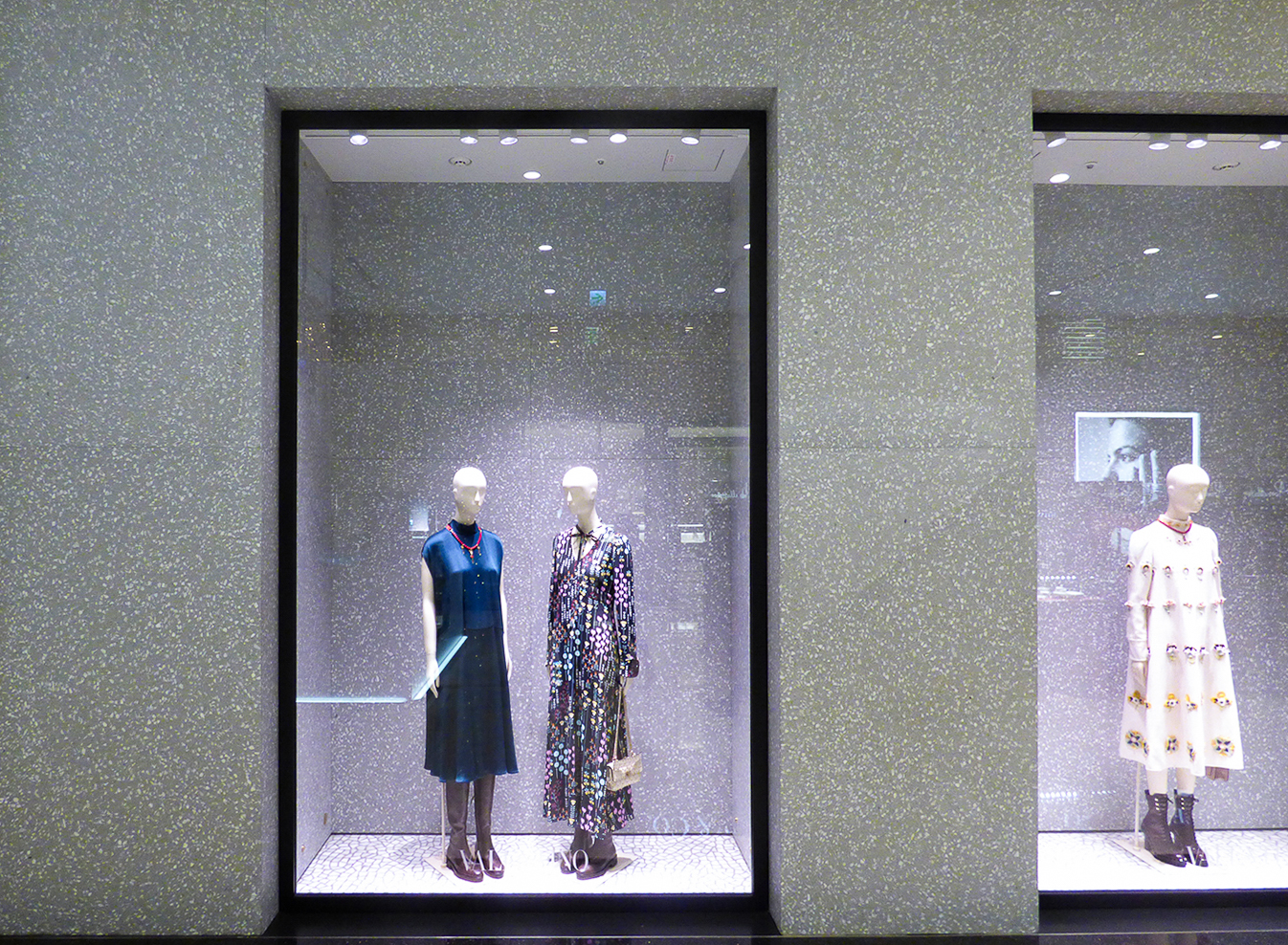 Les éclats de marbre blanc immergés dans une base cimentière grise créent une surface élégante et lumineuse, capable de mettre en valeur chaque élément de l’espace : des collections prêt-à-porter aux accessoires iconiques.