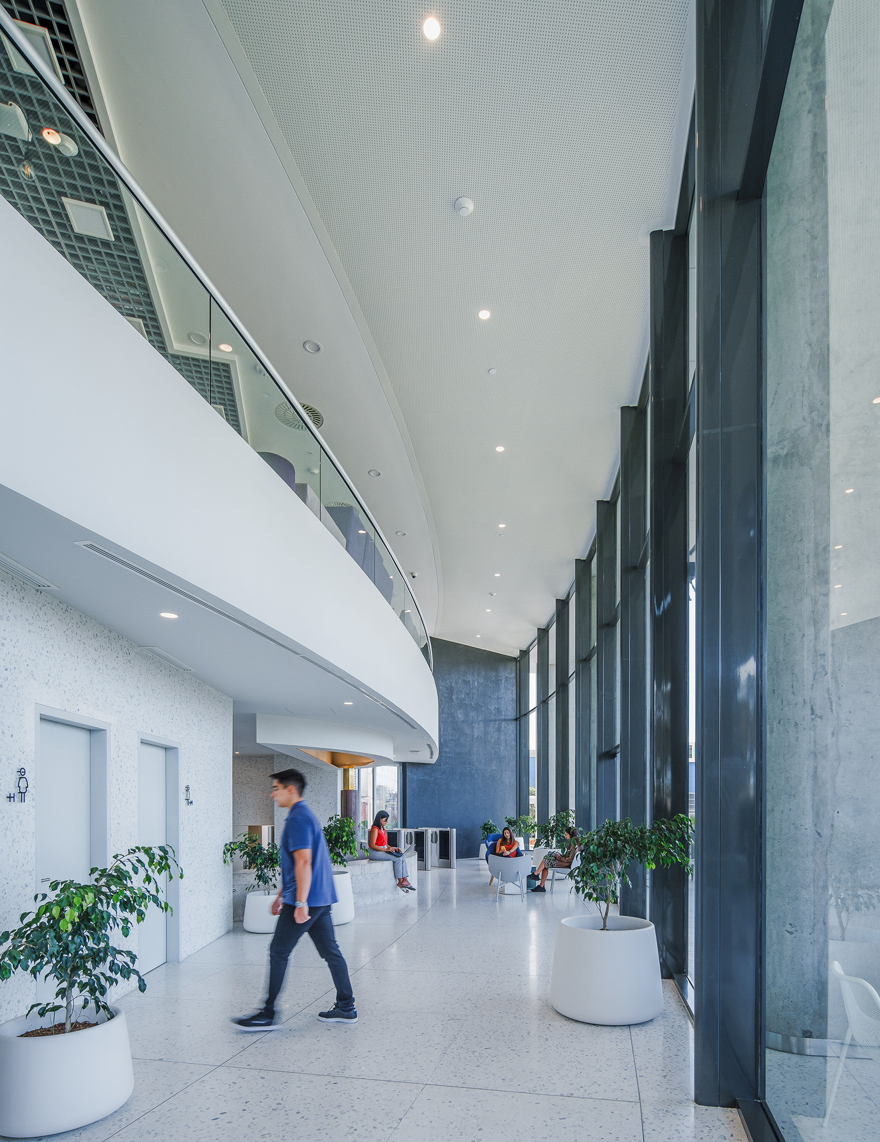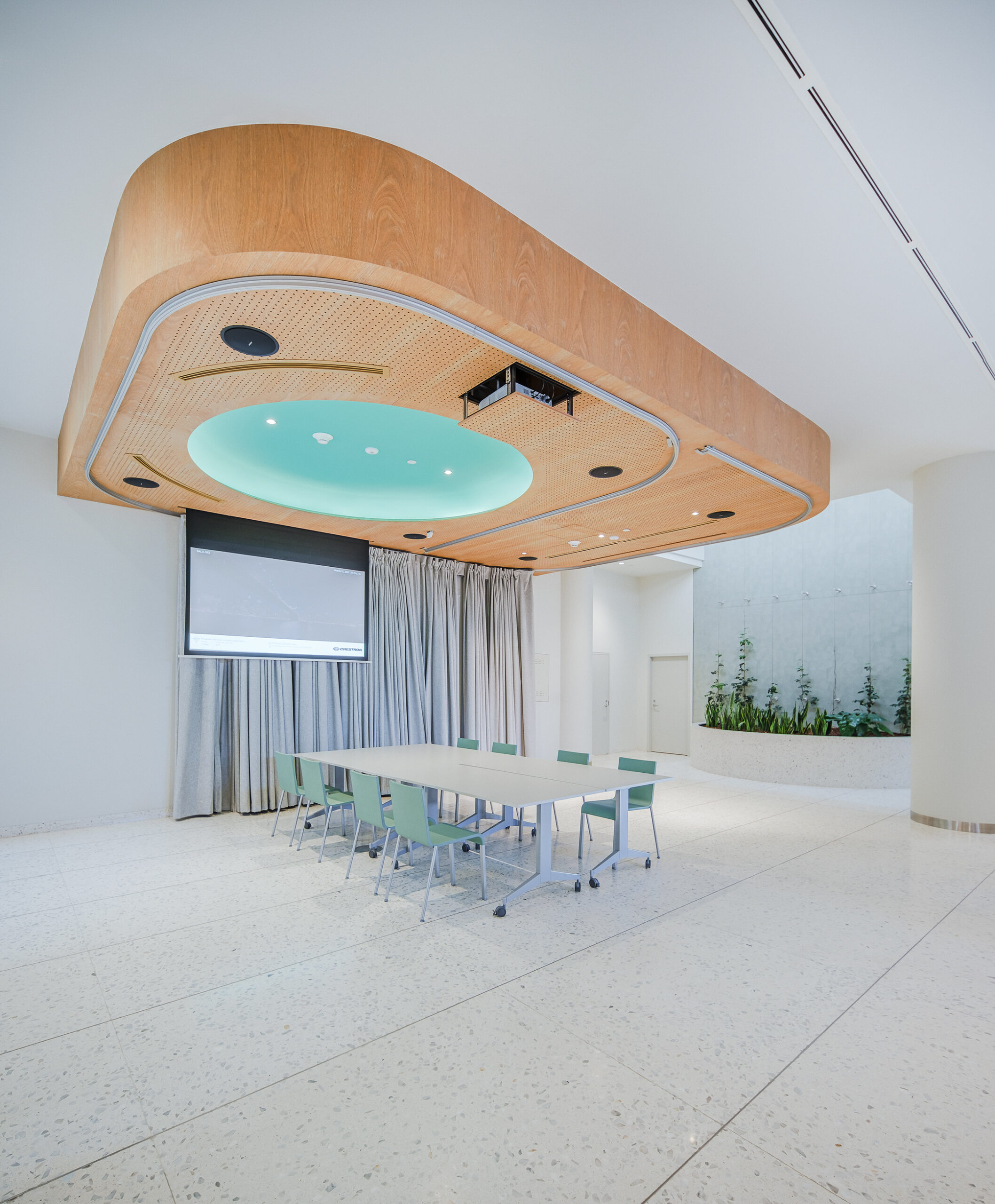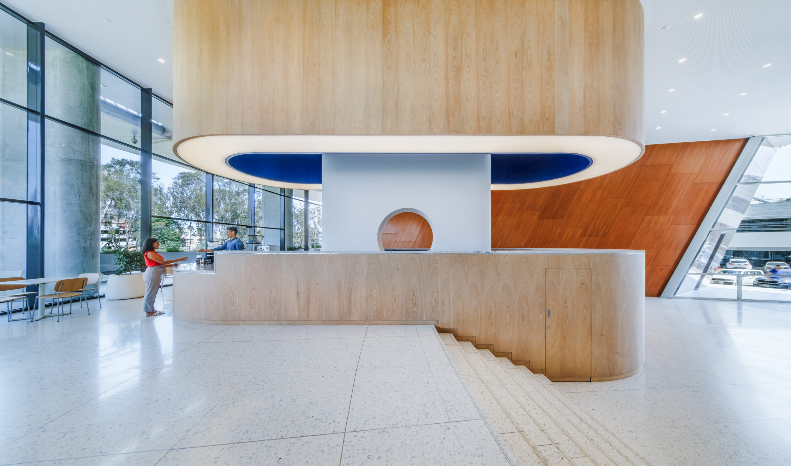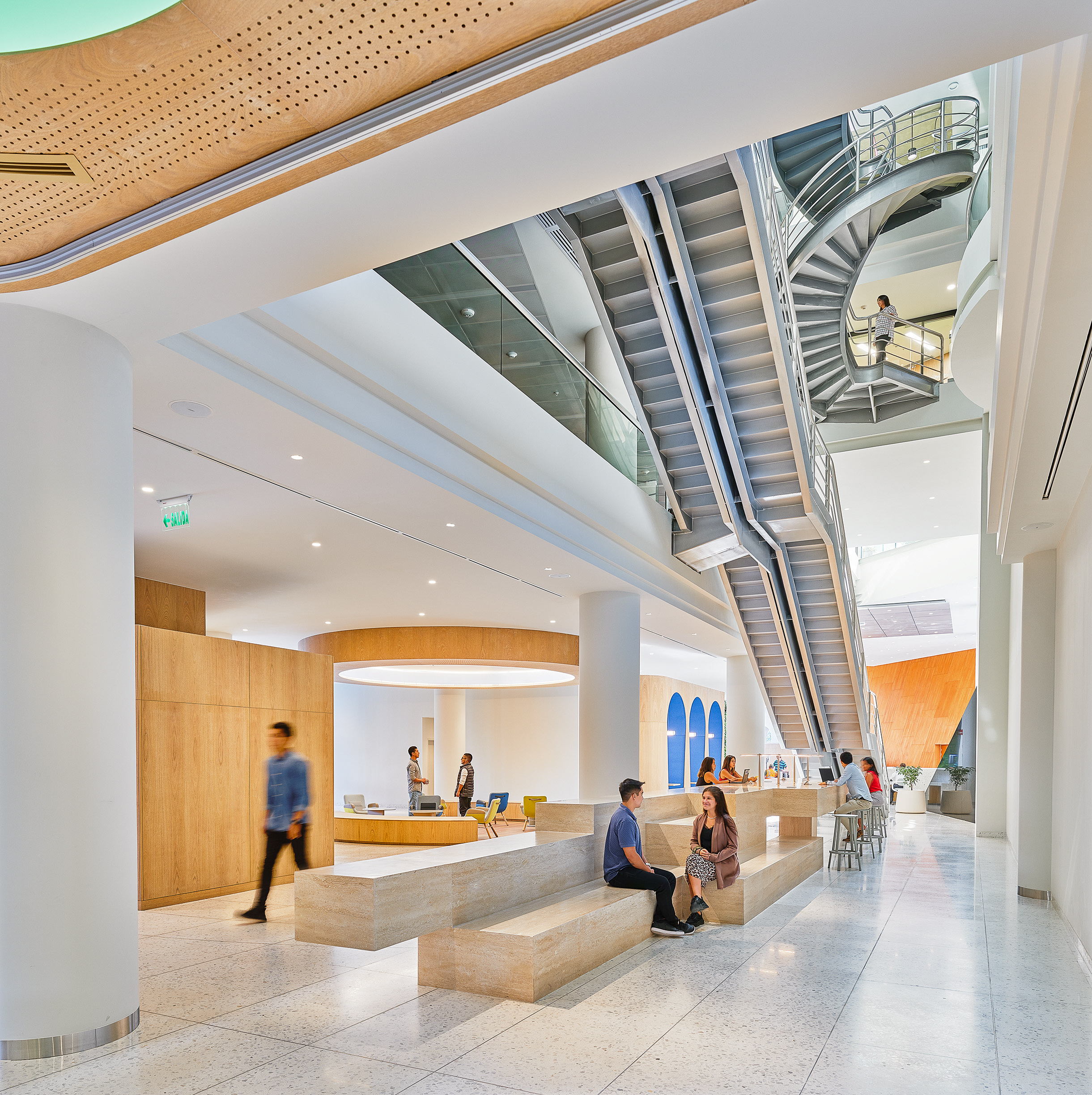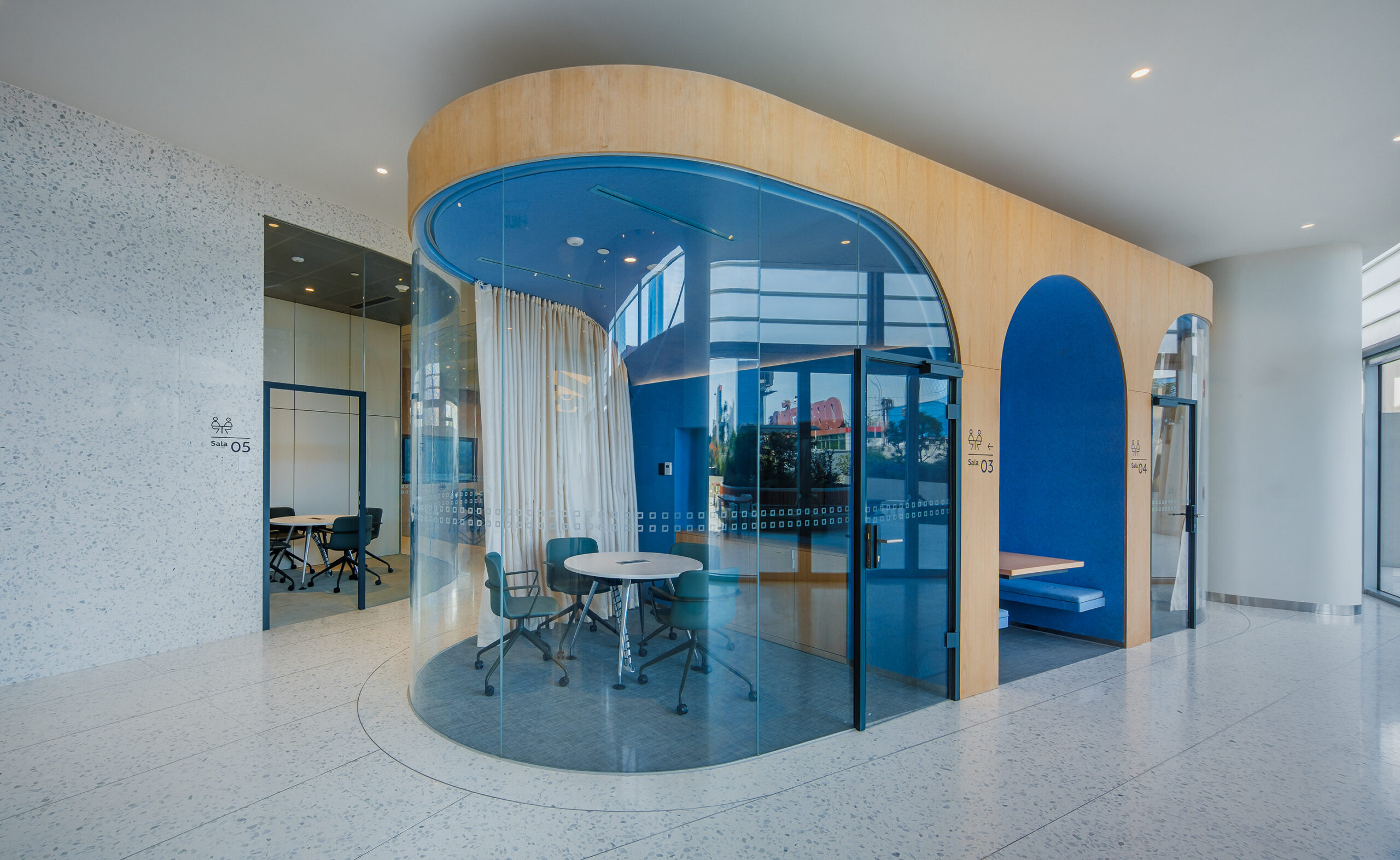 L’accostamento delle due tonalità, chiara e neutra, contribuisce a valorizzare i corridoi, le aree comuni e le sale dedicate al pubblico, amplificando la percezione di ampiezza e luminosità.