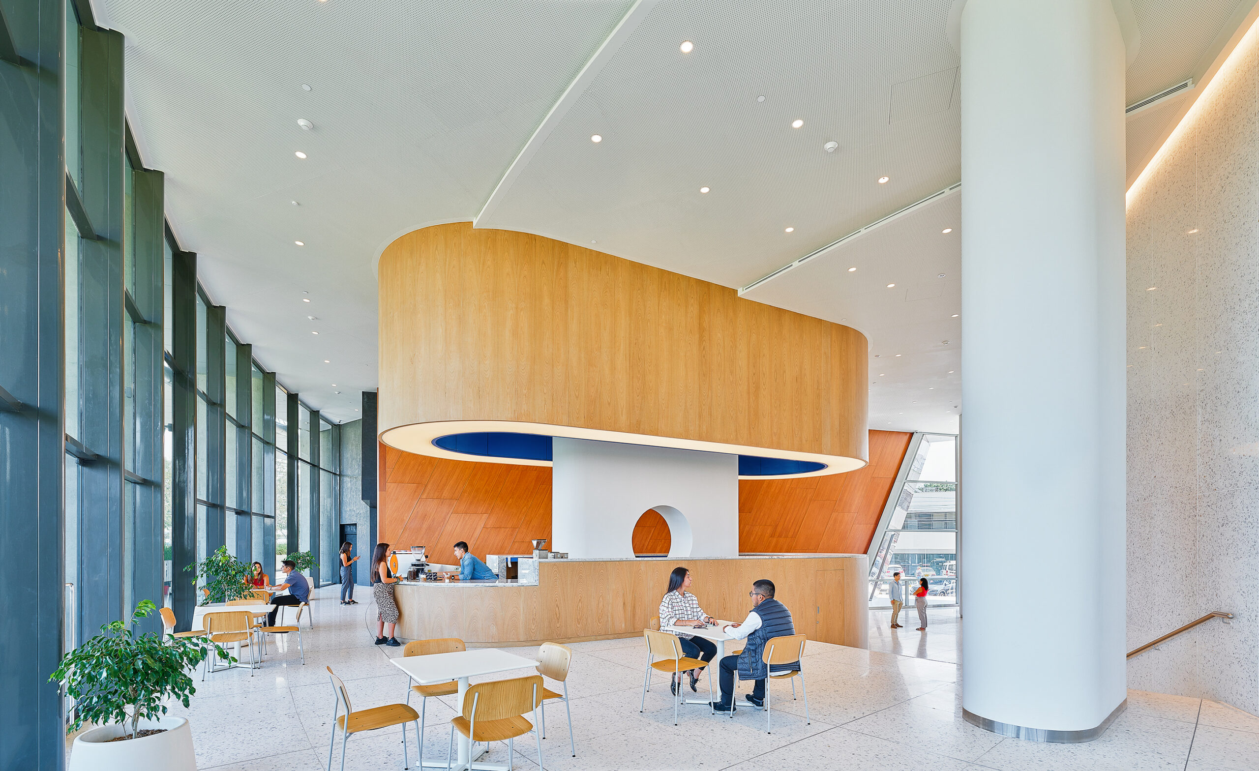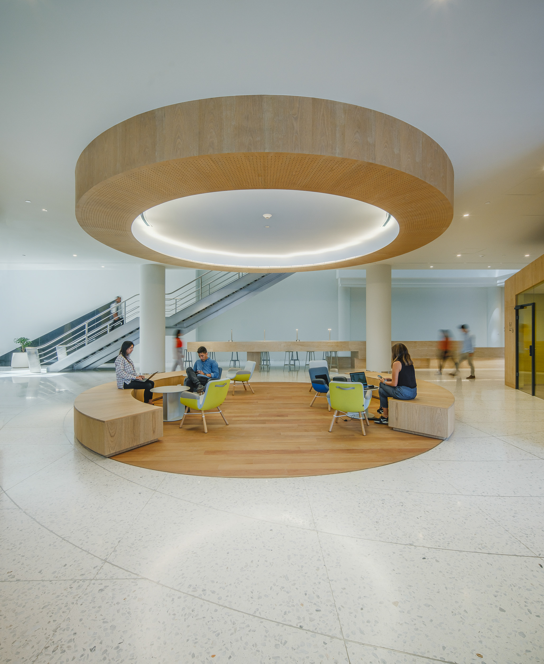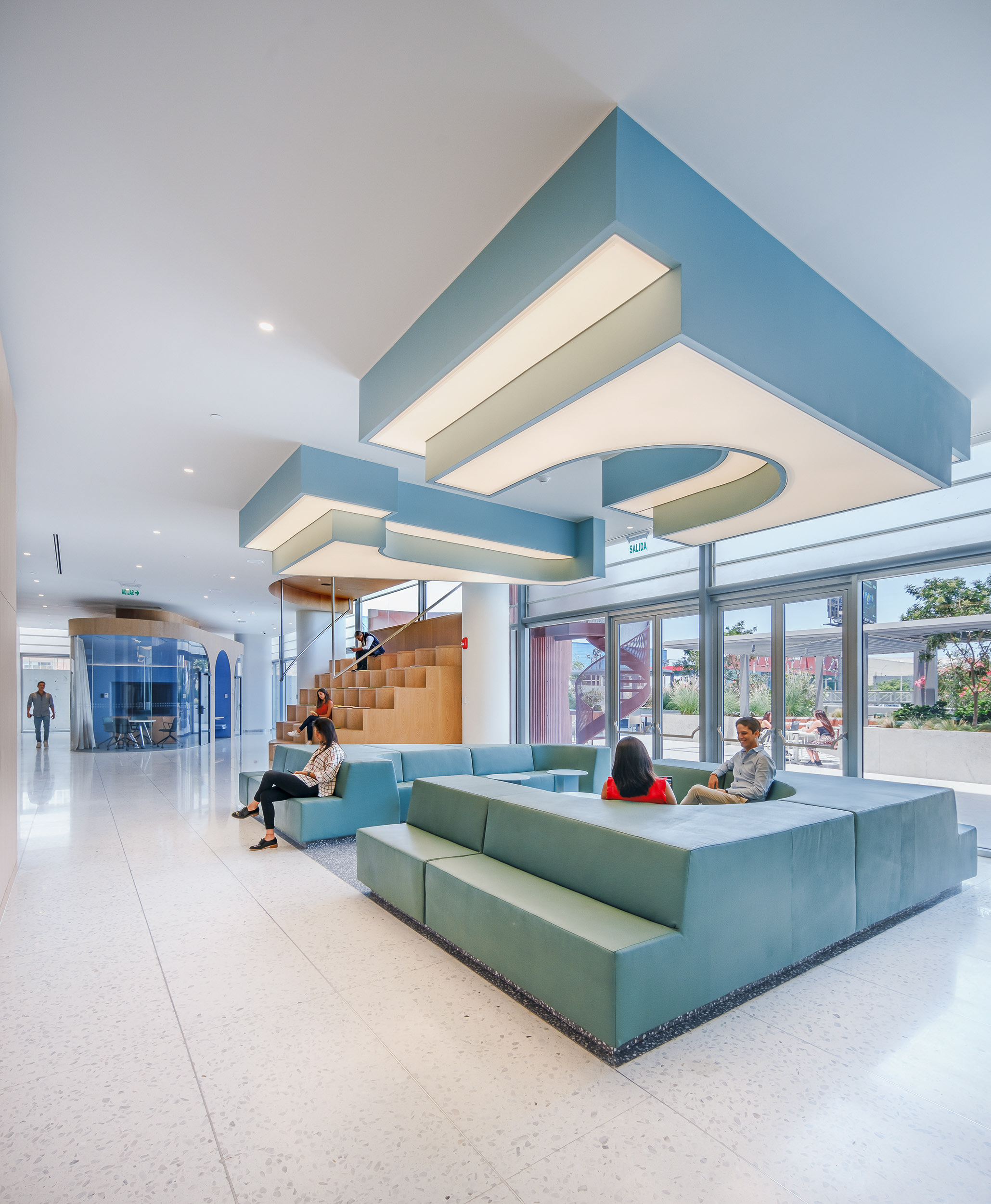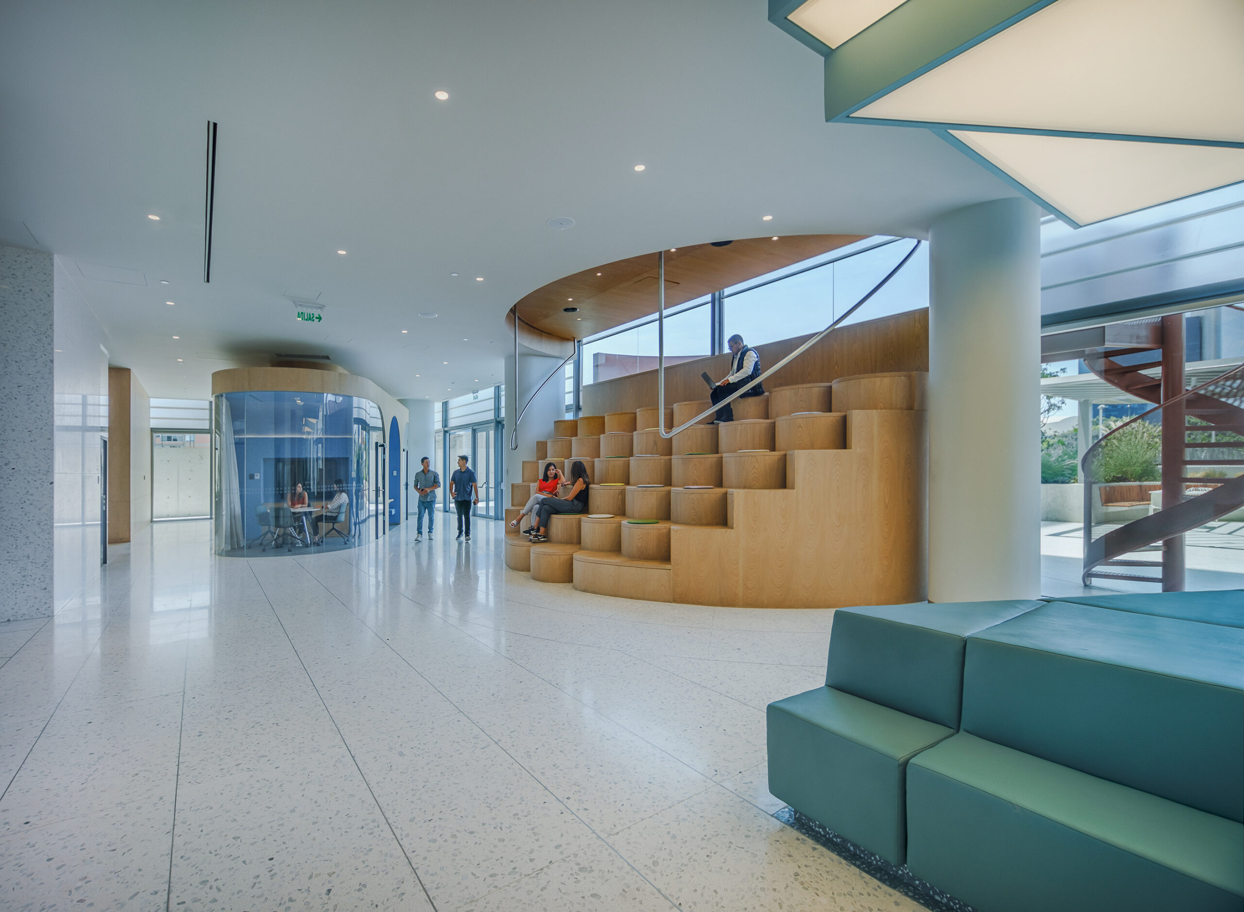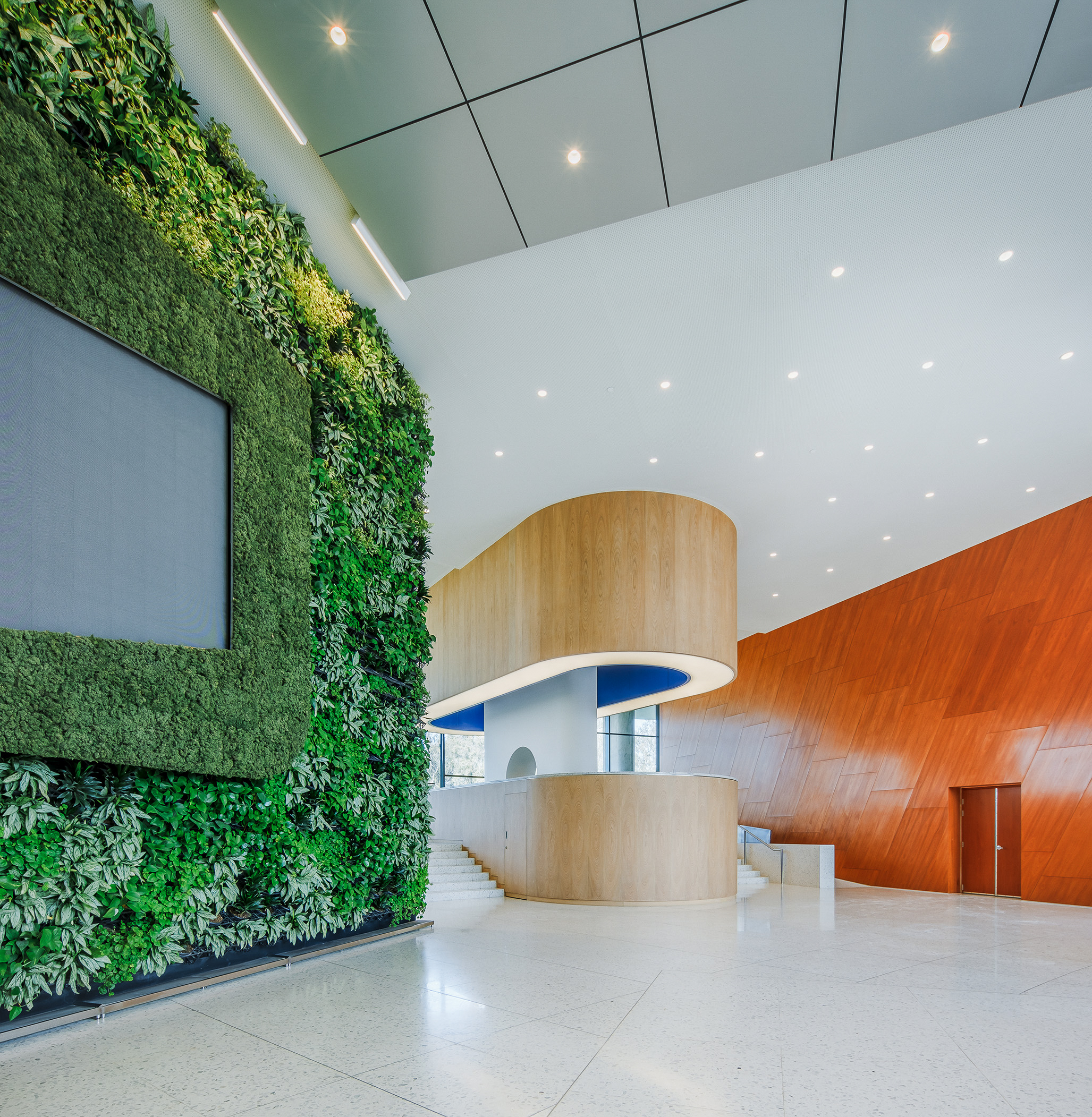 L’accostamento delle due tonalità, chiara e neutra, contribuisce a valorizzare i corridoi, le aree comuni e le sale dedicate al pubblico, amplificando la percezione di ampiezza e luminosità.