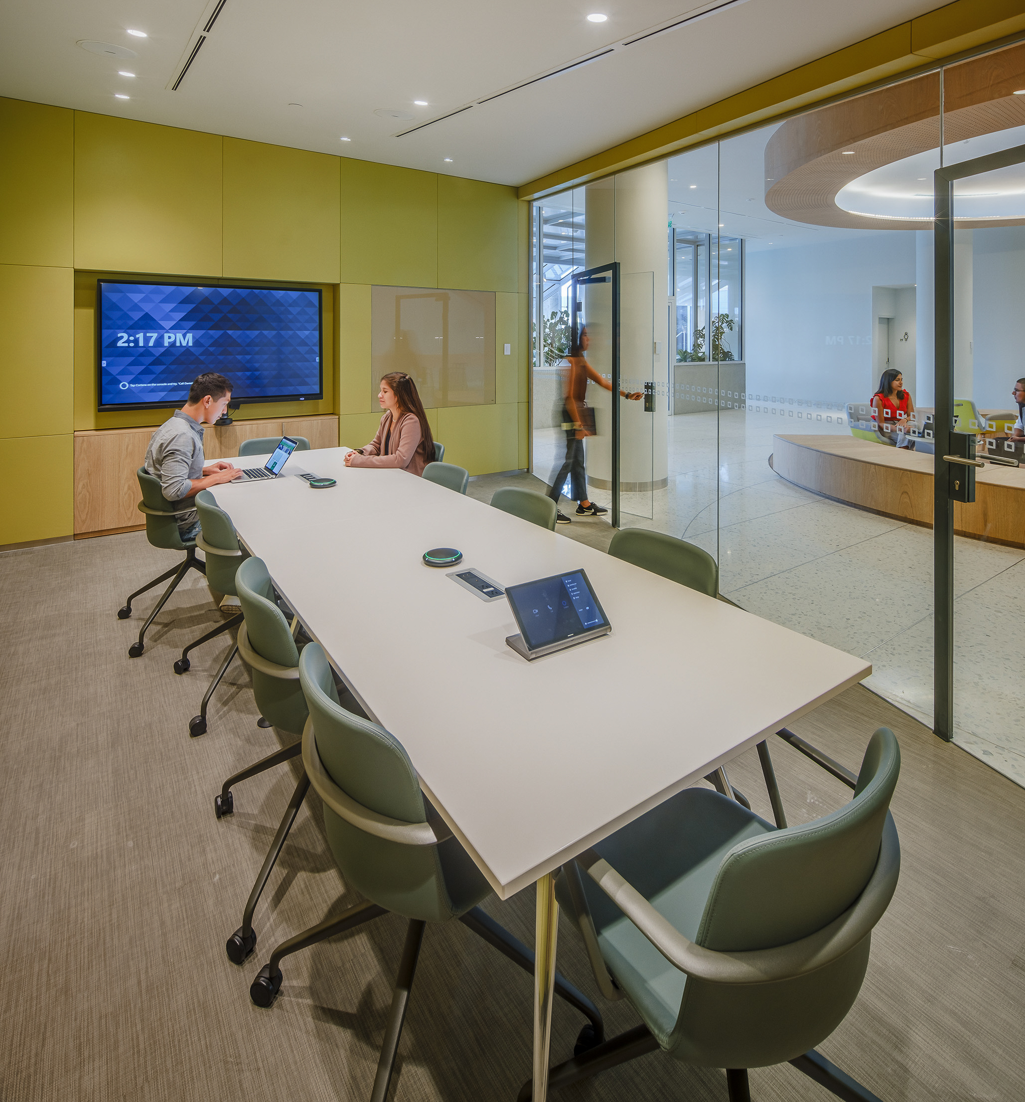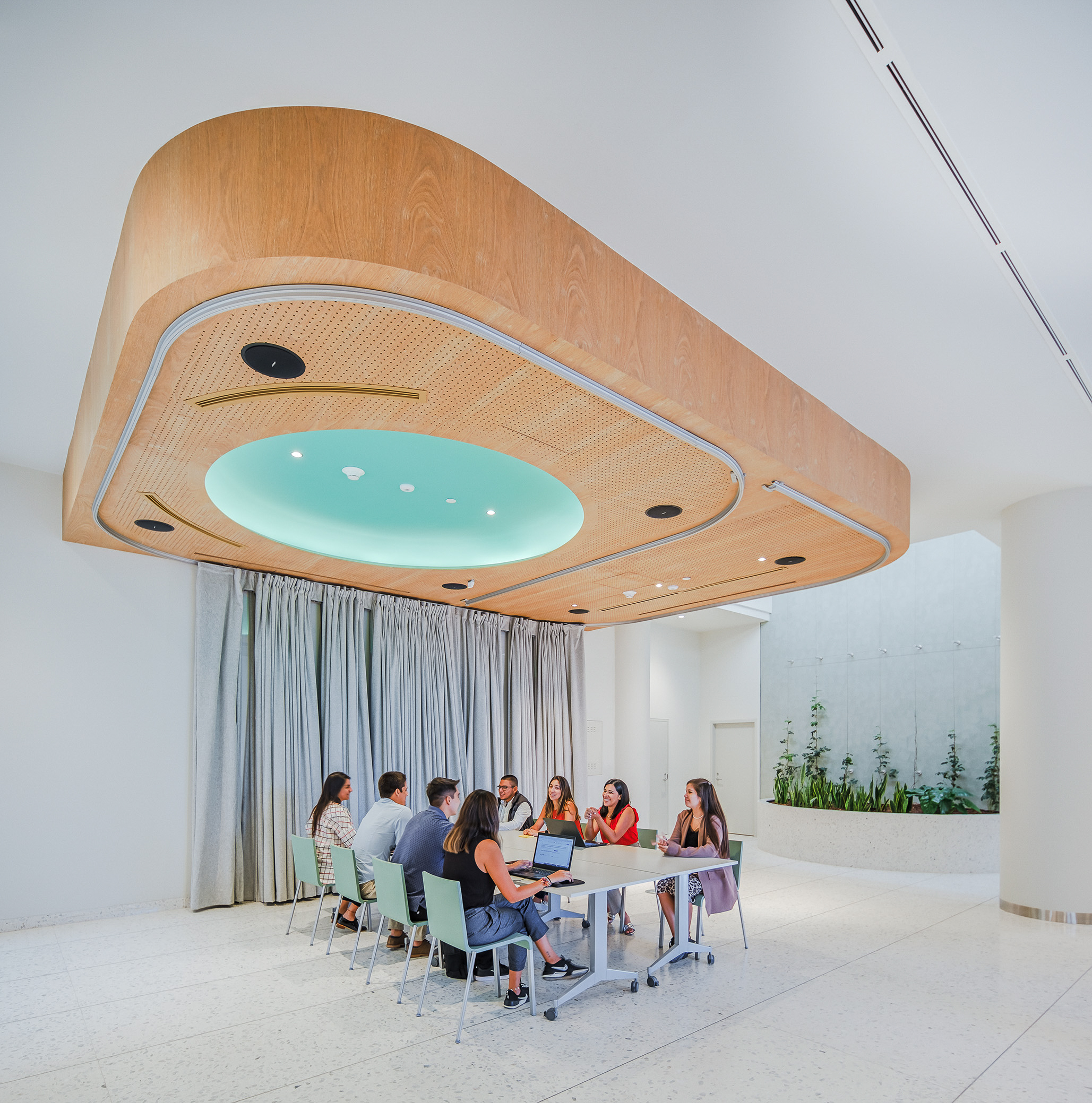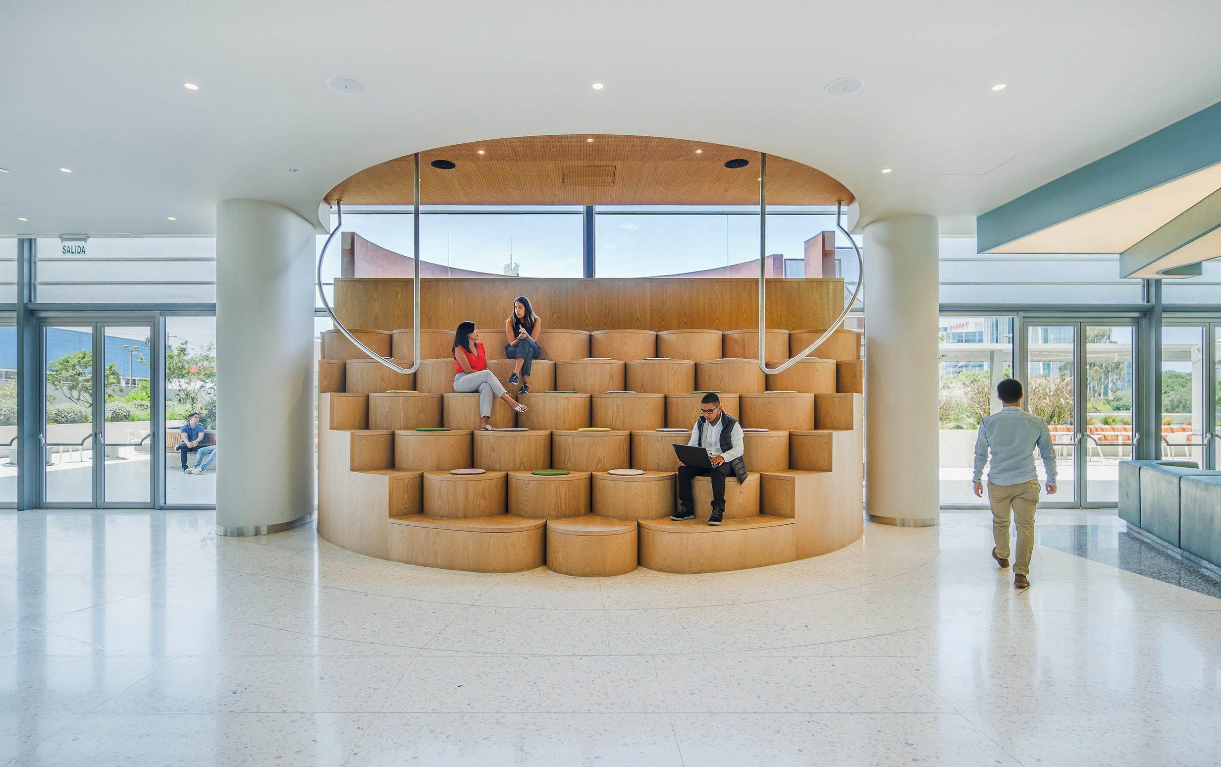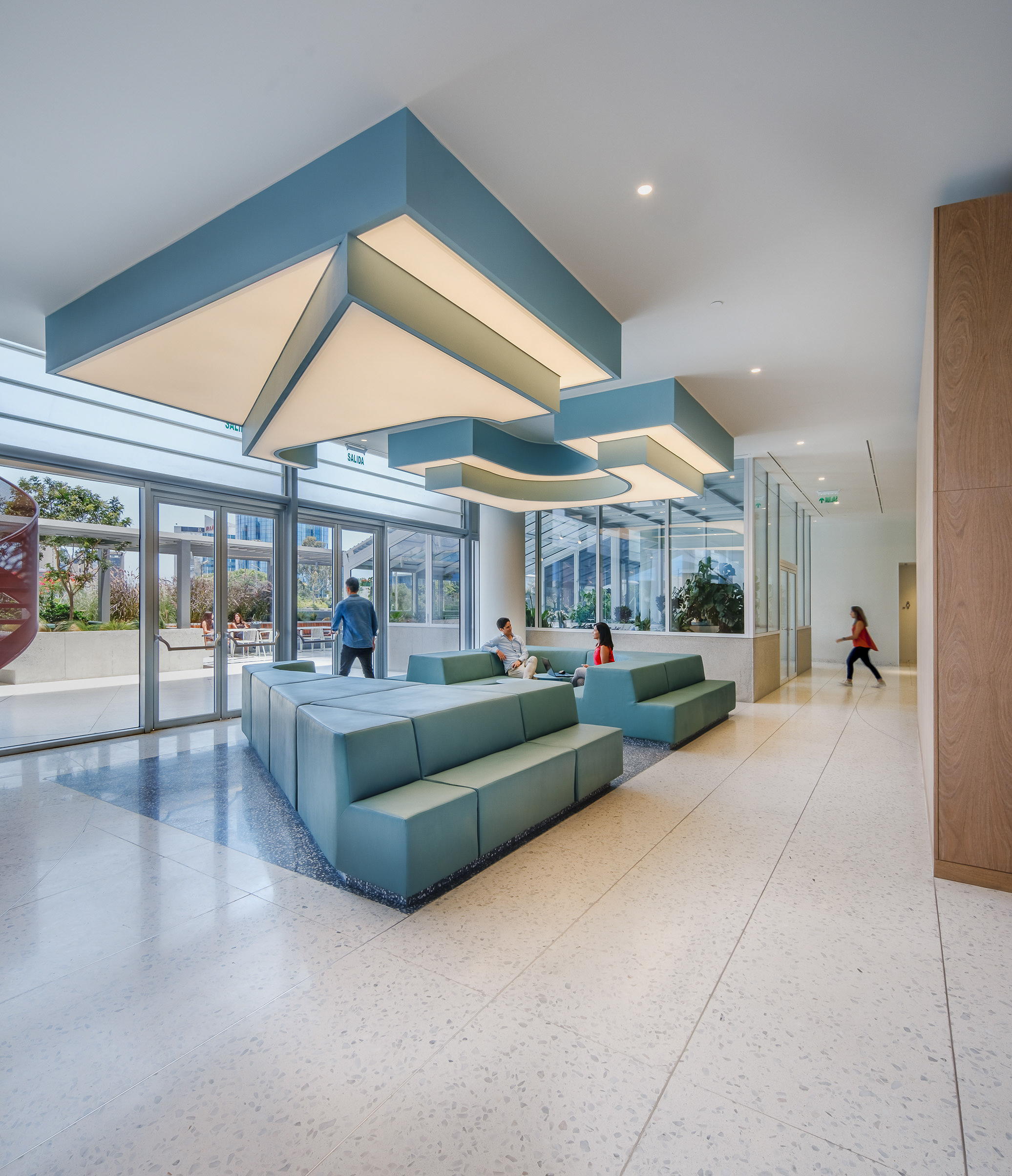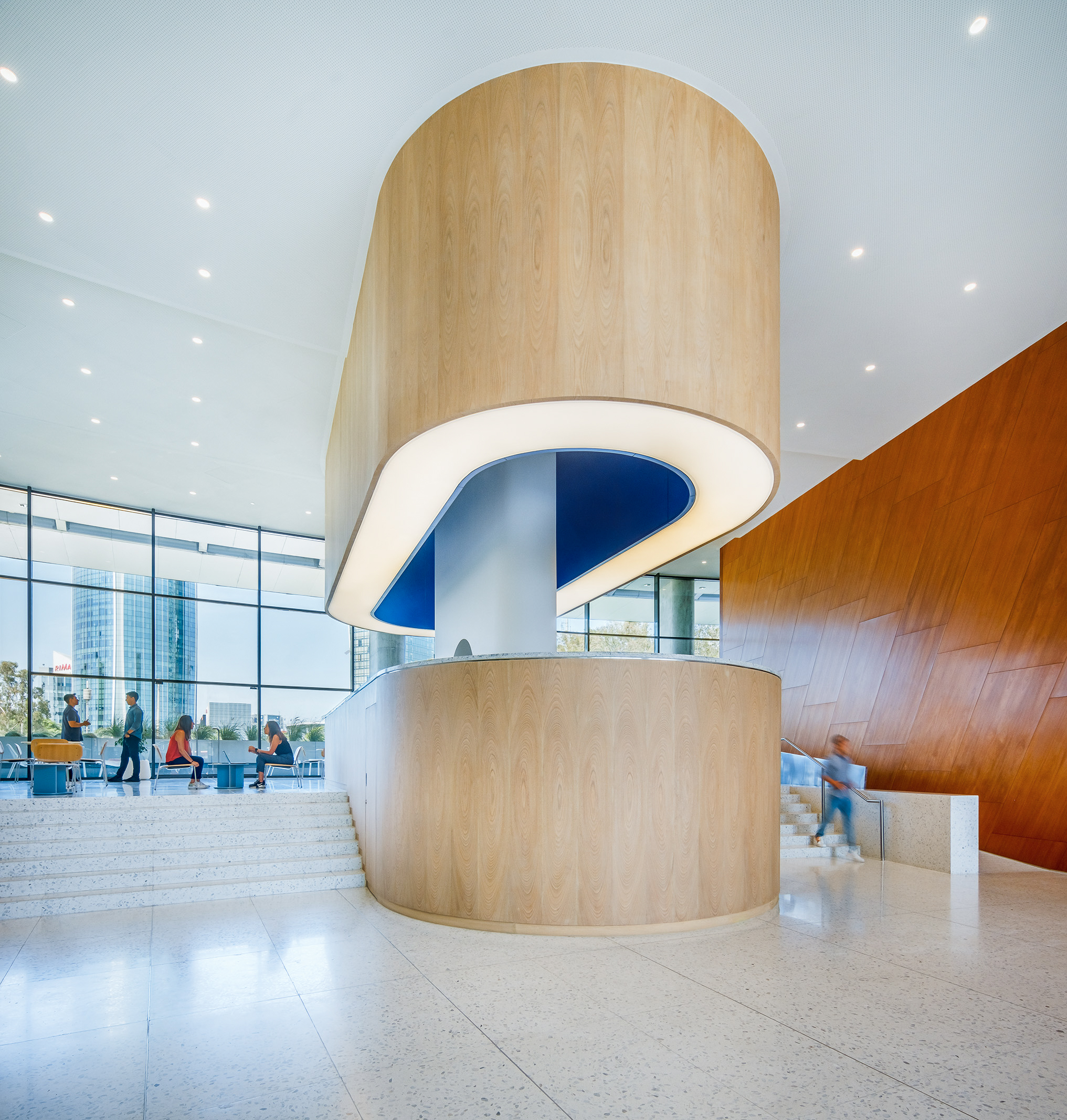 L’accostamento delle due tonalità, chiara e neutra, contribuisce a valorizzare i corridoi, le aree comuni e le sale dedicate al pubblico, amplificando la percezione di ampiezza e luminosità.