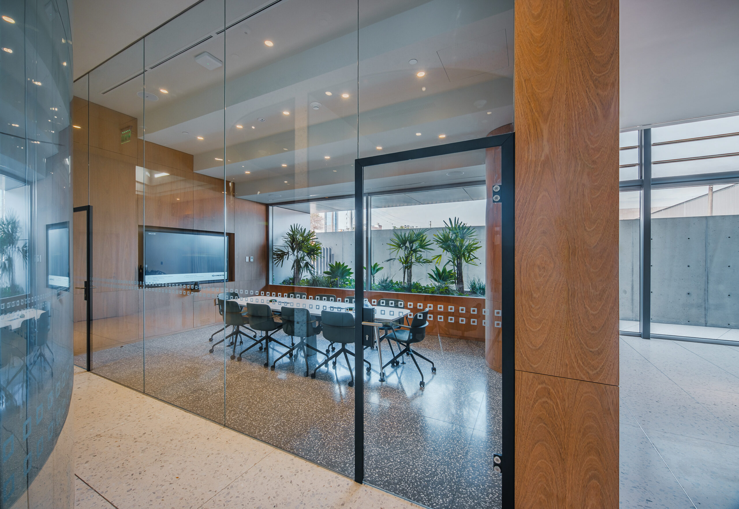 Il risultato è un ambiente che esprime modernità, ordine e trasparenza, nel pieno rispetto della visione originaria di Hans Hollein, dove ogni superficie contribuisce a creare un senso di continuità visiva e armonia architettonica.