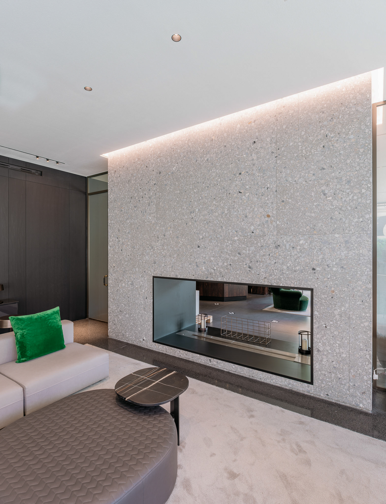 Caratterizzata da una base cromatica neutra e da graniglie di marmo bianco, grigio e antracite di diverse dimensioni, questa texture trasmette profondità visiva ed equilibrio tra tradizione e contemporaneità. SB 130 Aggloceppo non è solo una tonalità: è un linguaggio che racconta la città metropolitana attraverso la sua storia, i materiali e sensibilità progettuale. Il colore scelto, sobrio e ricercato, accompagna luci, geometrie e finiture, valorizzando le superfici con continuità estetica e forza espressiva.