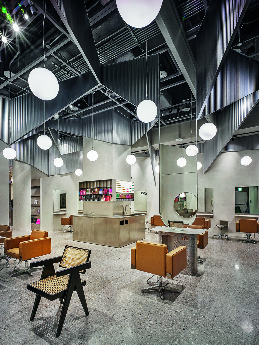 Linee pure, armonia ed eleganza definiscono questo hair salon, frutto della collaborazione con lo studio di architettura CJ Studio Shi-Chieh Lu. Il terrazzo Agglotech SB 124 Rotondo riveste pavimenti e arredi, reinterpretando la tradizione del seminato veneziano in chiave contemporanea.