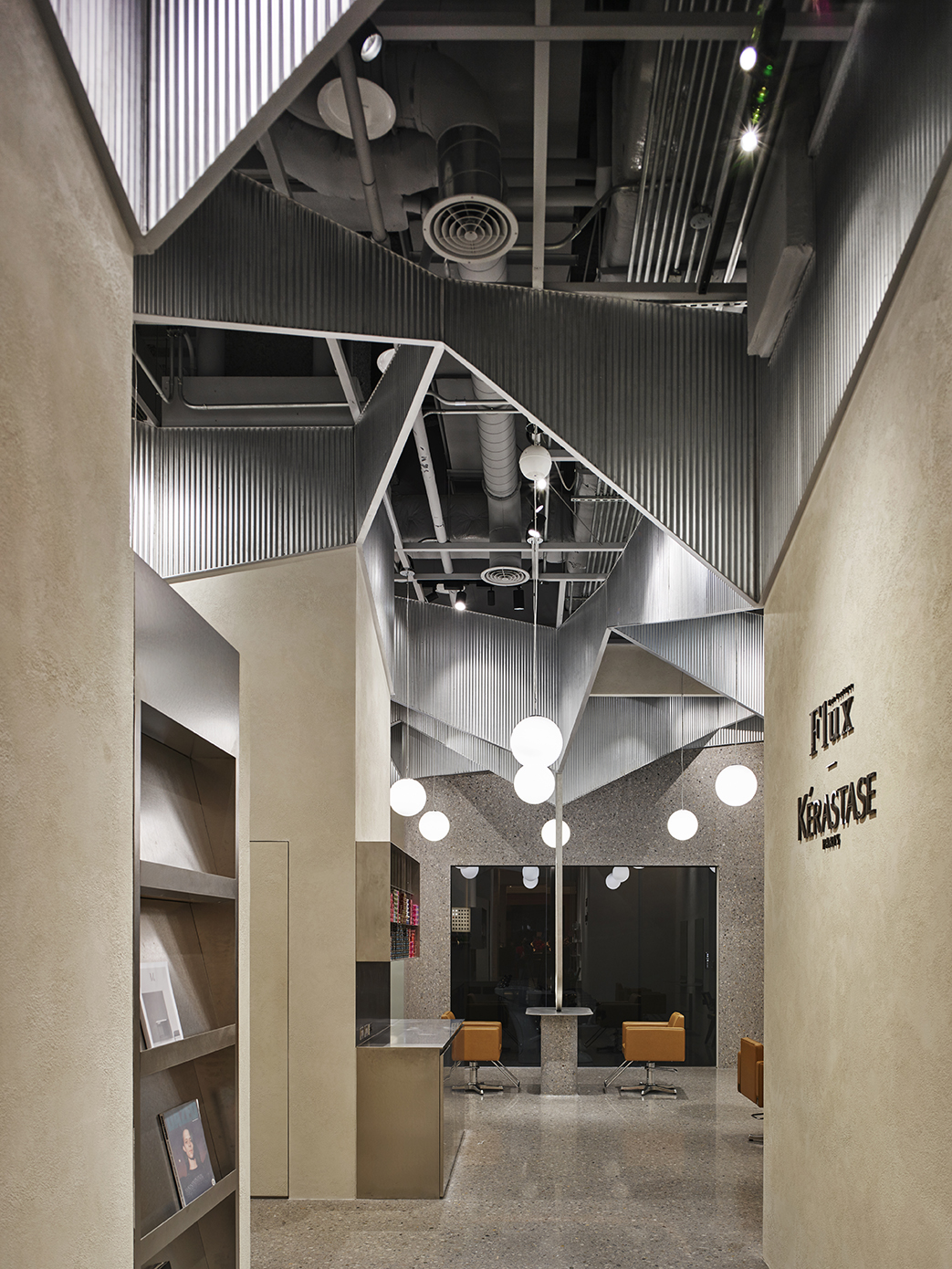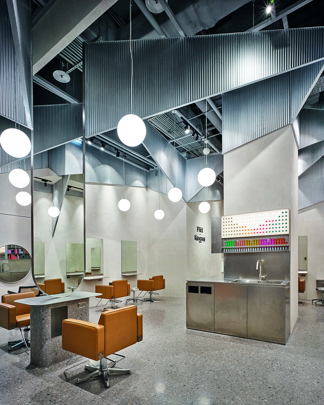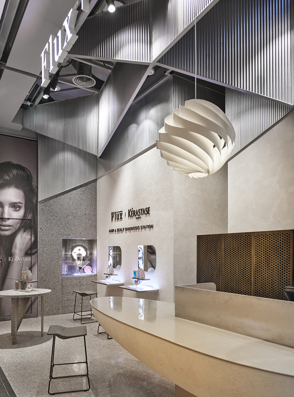 Il Kérastase Flux Salon di Taipei è un progetto che valorizza al massimo il terrazzo veneziano made in Italy Agglotech. Non solo pavimenti, ma anche rivestimenti interni, arredi e elementi speciali in massello sono stati realizzati con il colore SB 124 Rotondo, un marmo cemento grigio con scaglie tendenti al marrone.