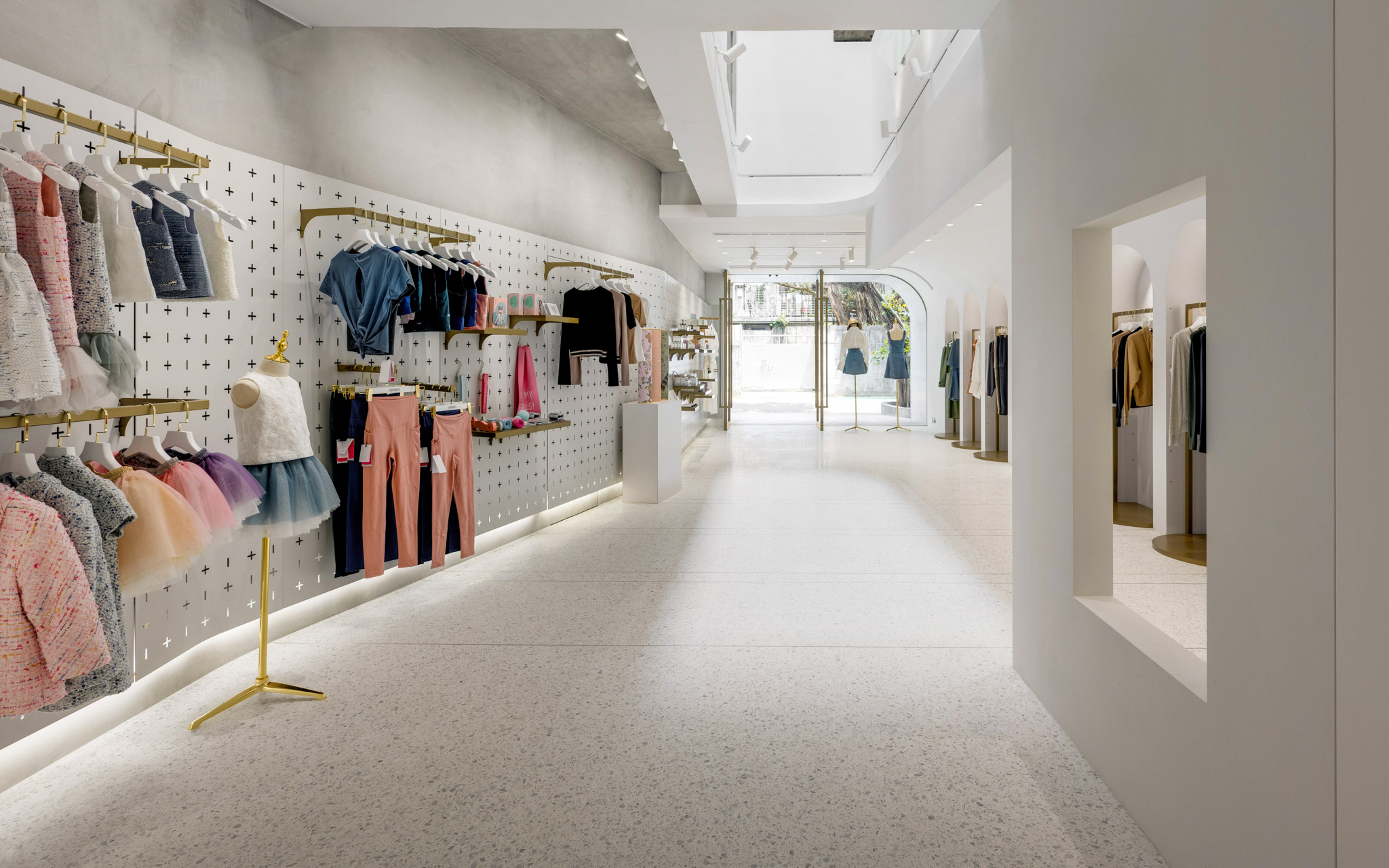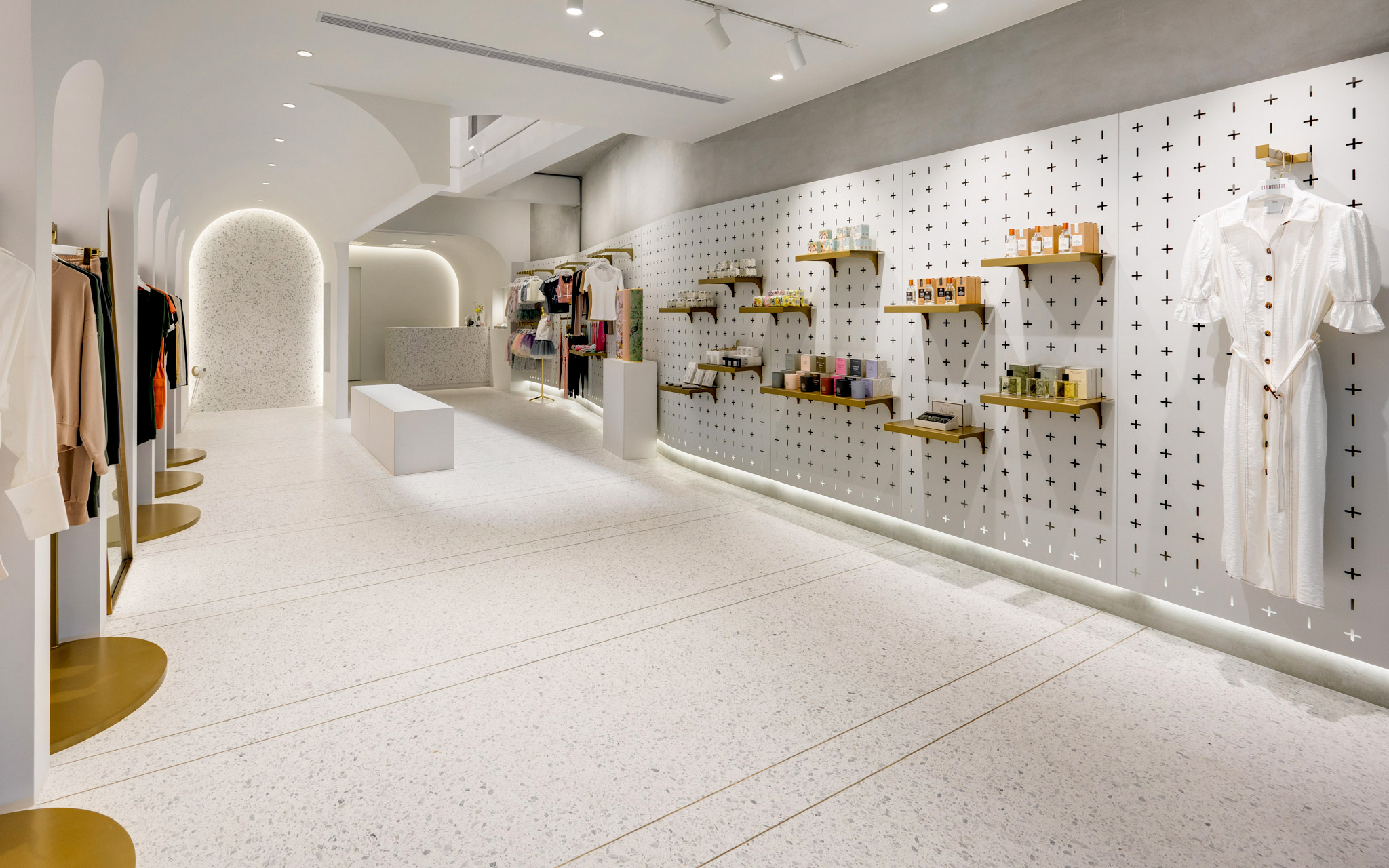 Per la pavimentazione interna è stata scelta la colorazione SB 143 Bianco Carrara 25, uno sfondo bianco luminoso arricchito da frammenti policromi che donano brillantezza agli ambienti e accompagnano con eleganza i capi di alta moda esposti.