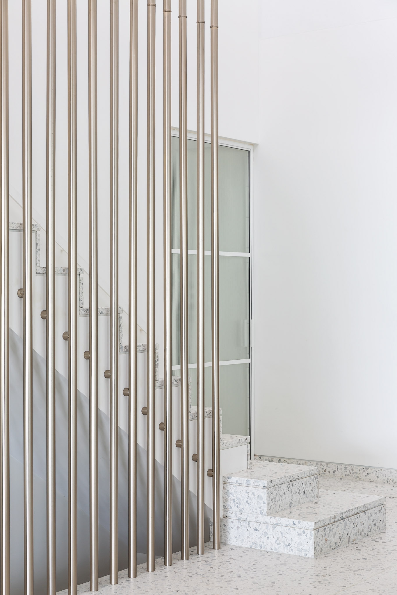 Il materiale è stato scelto per rivestire pavimenti e scale interne, creando un effetto continuo e raffinato che dialoga con arredi minimal e superfici in legno e pietra.