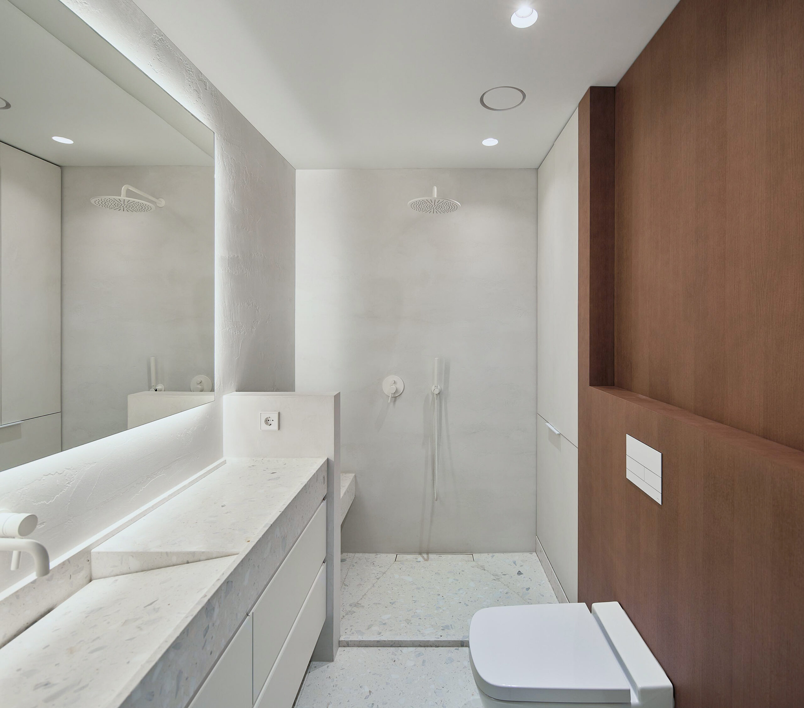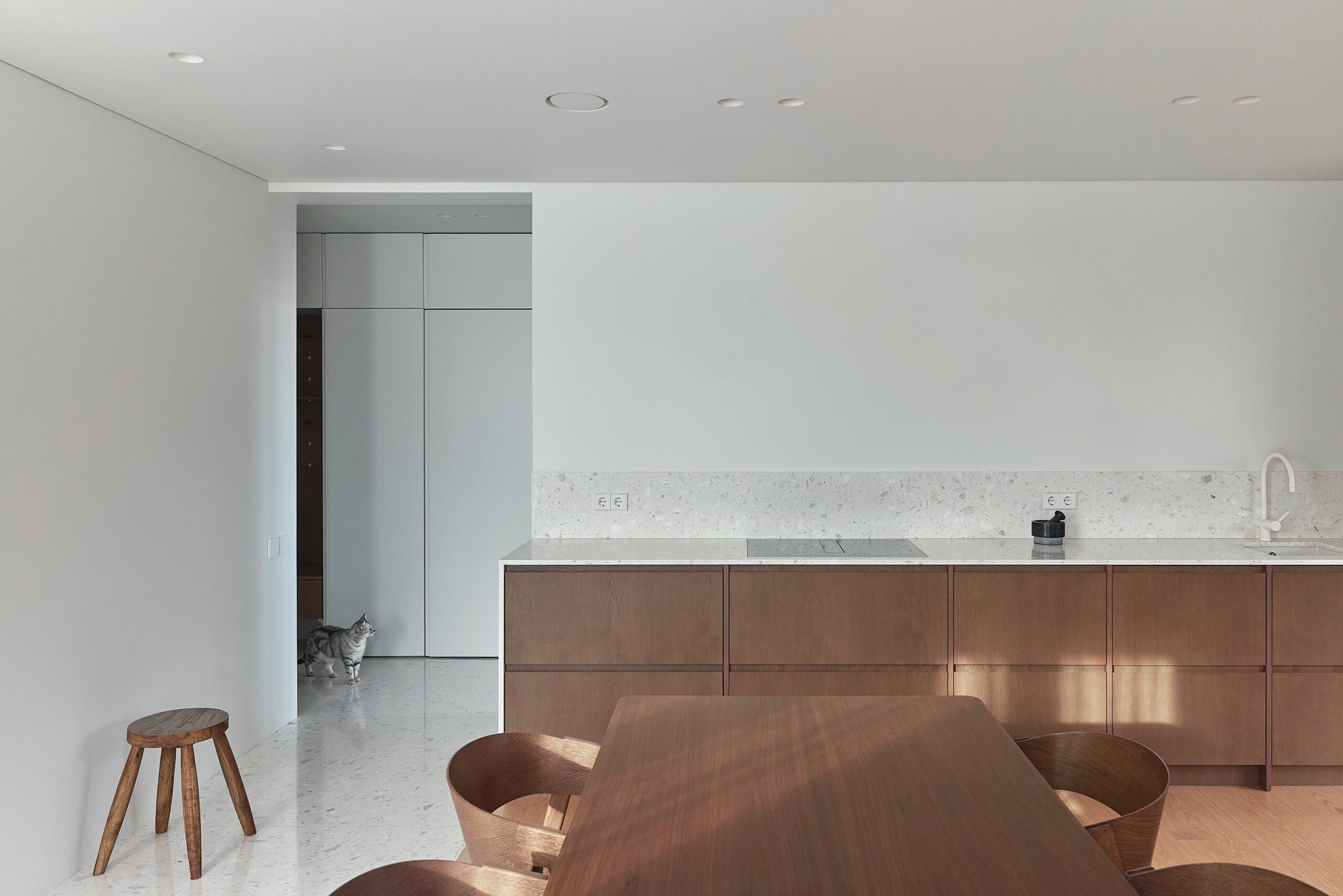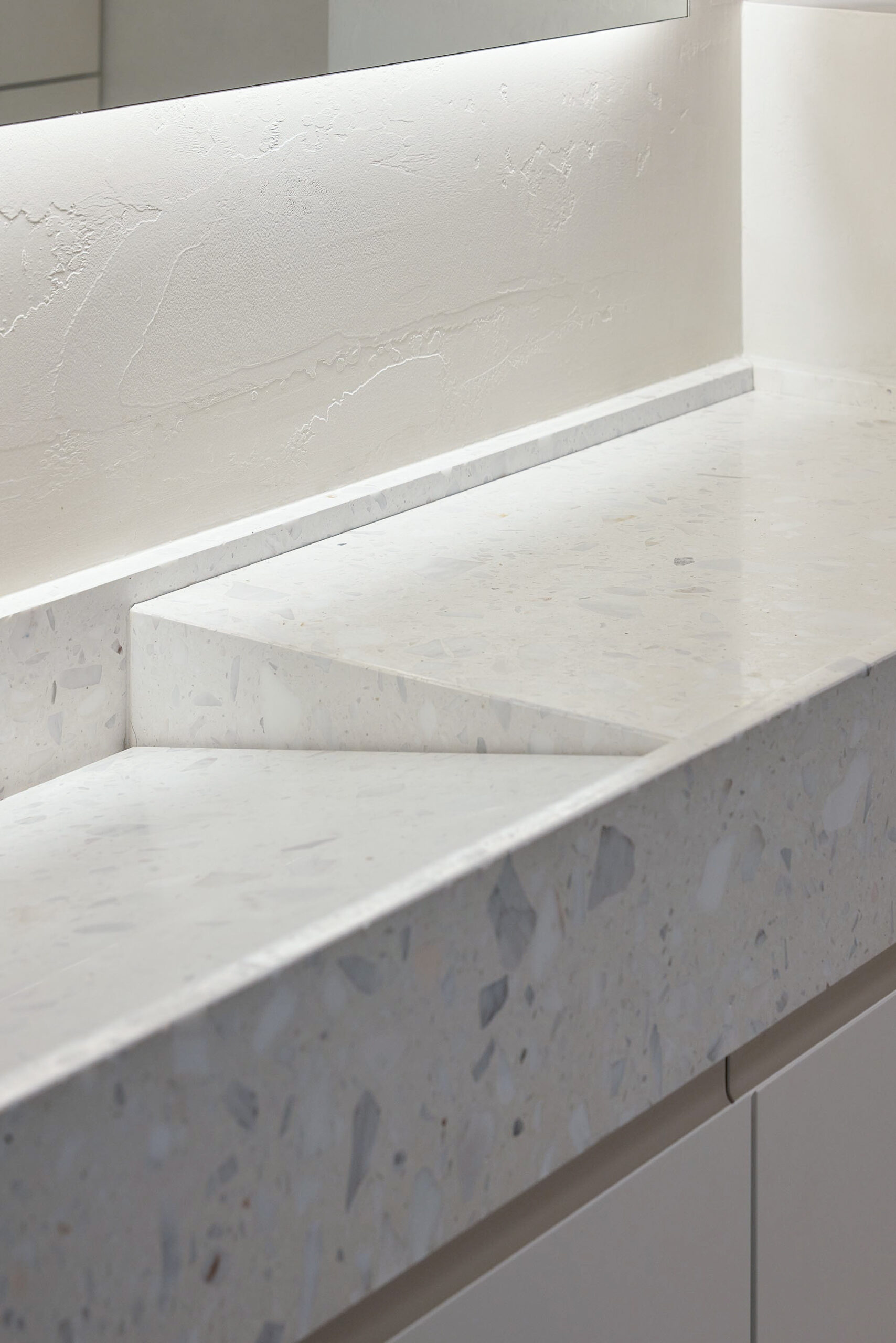 Situata in un contesto residenziale di pregio, la struttura è stata pensata per valorizzare la luce, la continuità degli spazi e la forza espressiva delle superfici. Il terrazzo Agglotech SB 290 Calacatta è il protagonista indiscusso degli interni, scelto per ricoprire la cucina, il salotto e il bagno, creando un filo conduttore materico tra i diversi ambienti.