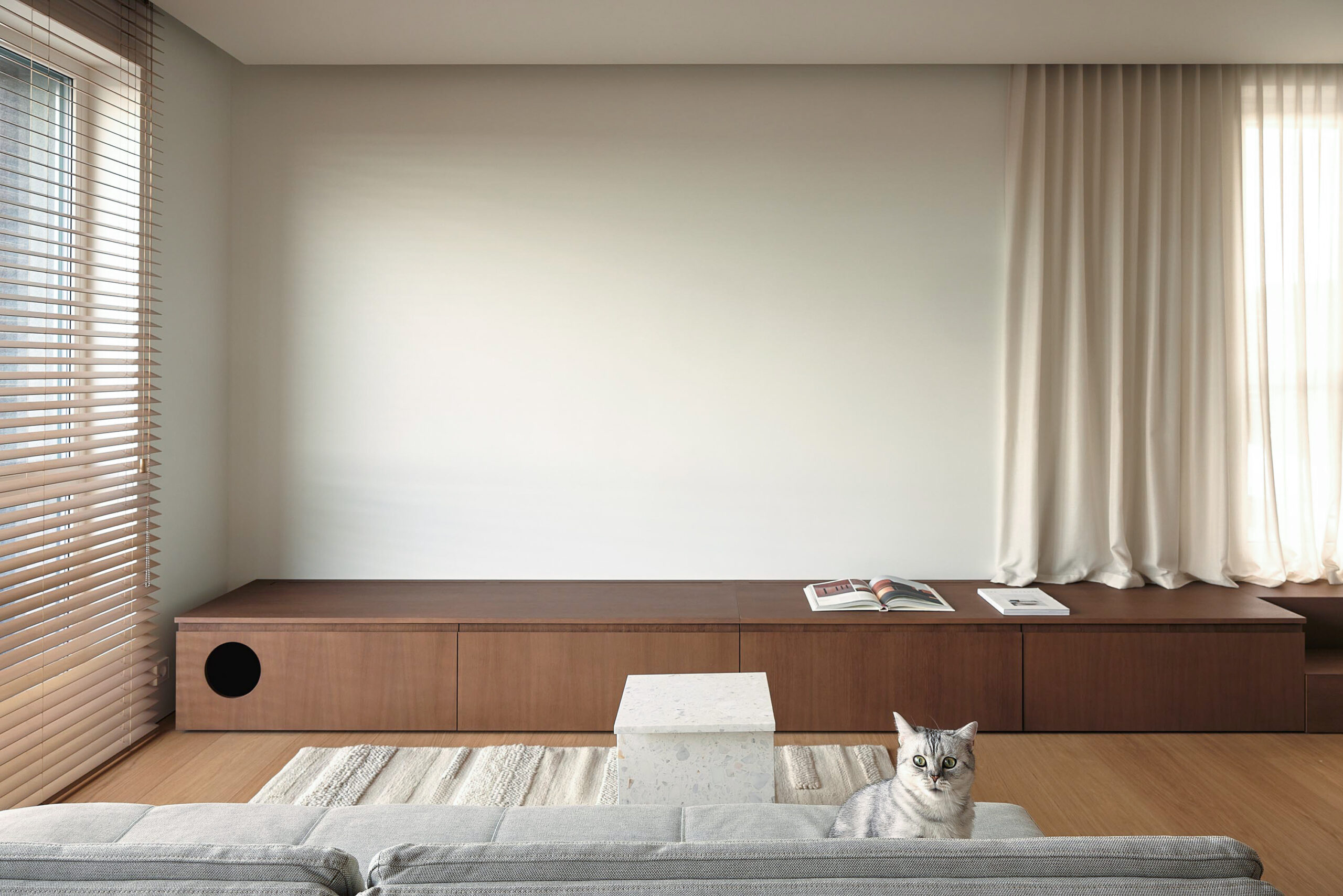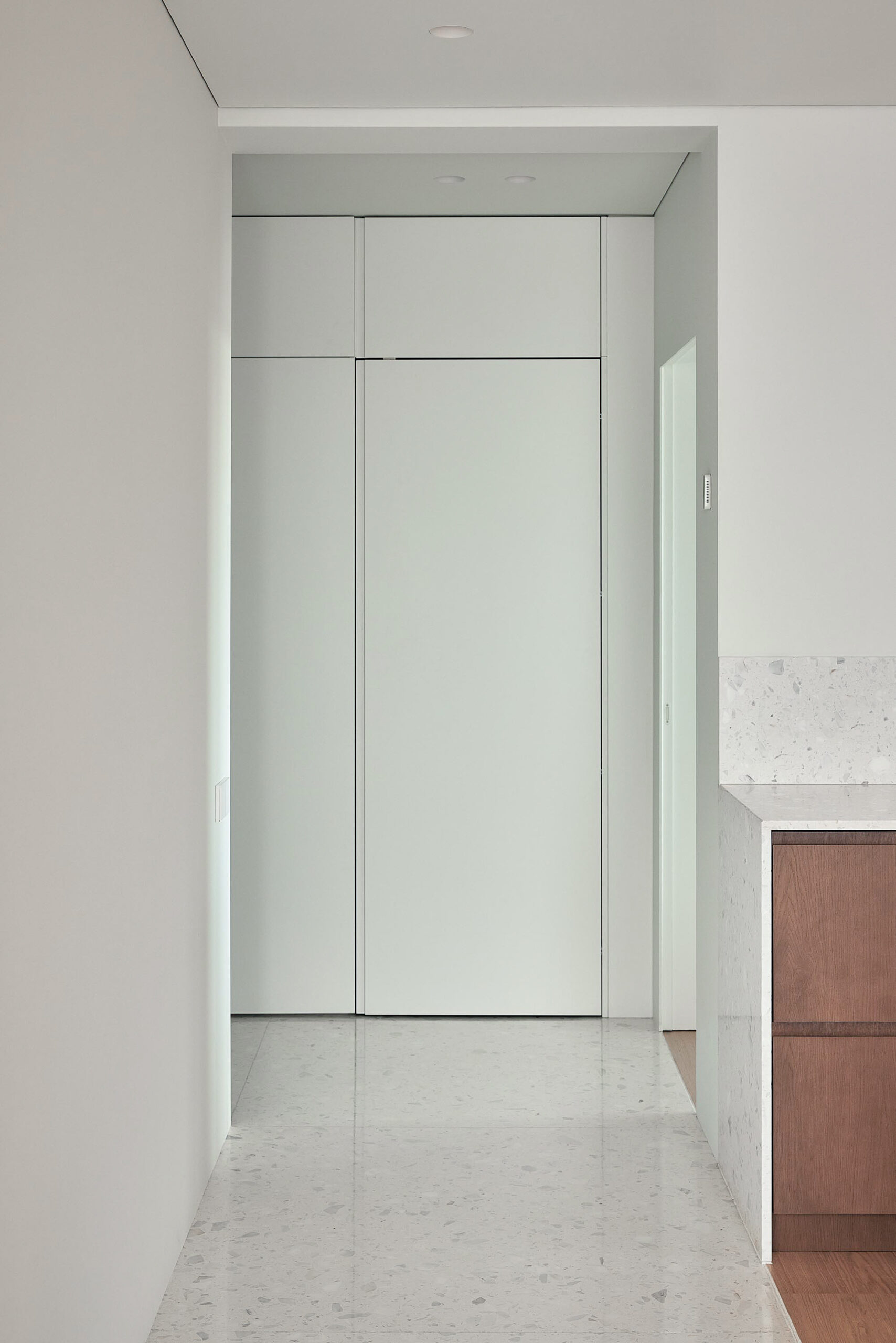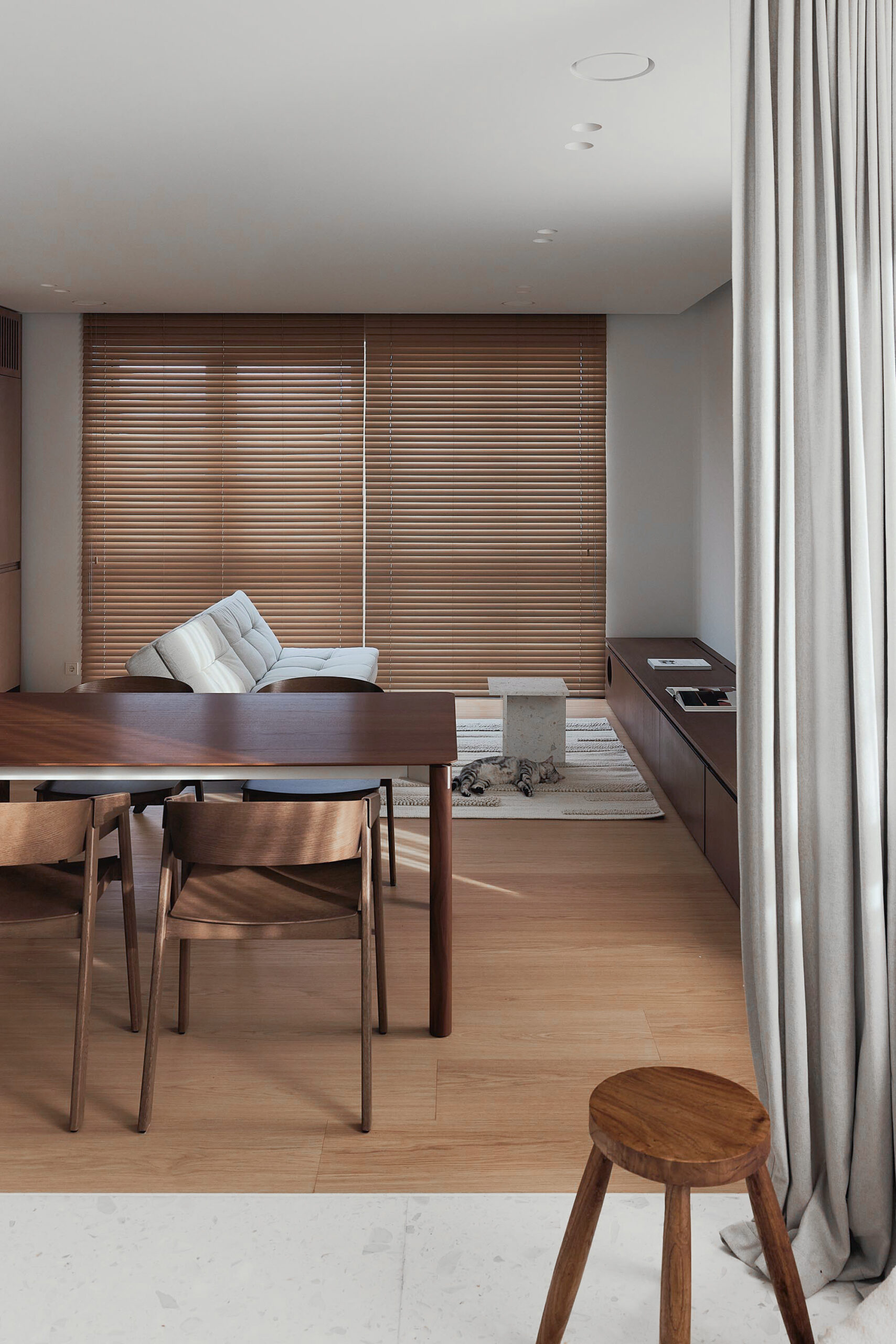 Situata in un contesto residenziale di pregio, la struttura è stata pensata per valorizzare la luce, la continuità degli spazi e la forza espressiva delle superfici. Il terrazzo Agglotech SB 290 Calacatta è il protagonista indiscusso degli interni, scelto per ricoprire la cucina, il salotto e il bagno, creando un filo conduttore materico tra i diversi ambienti.