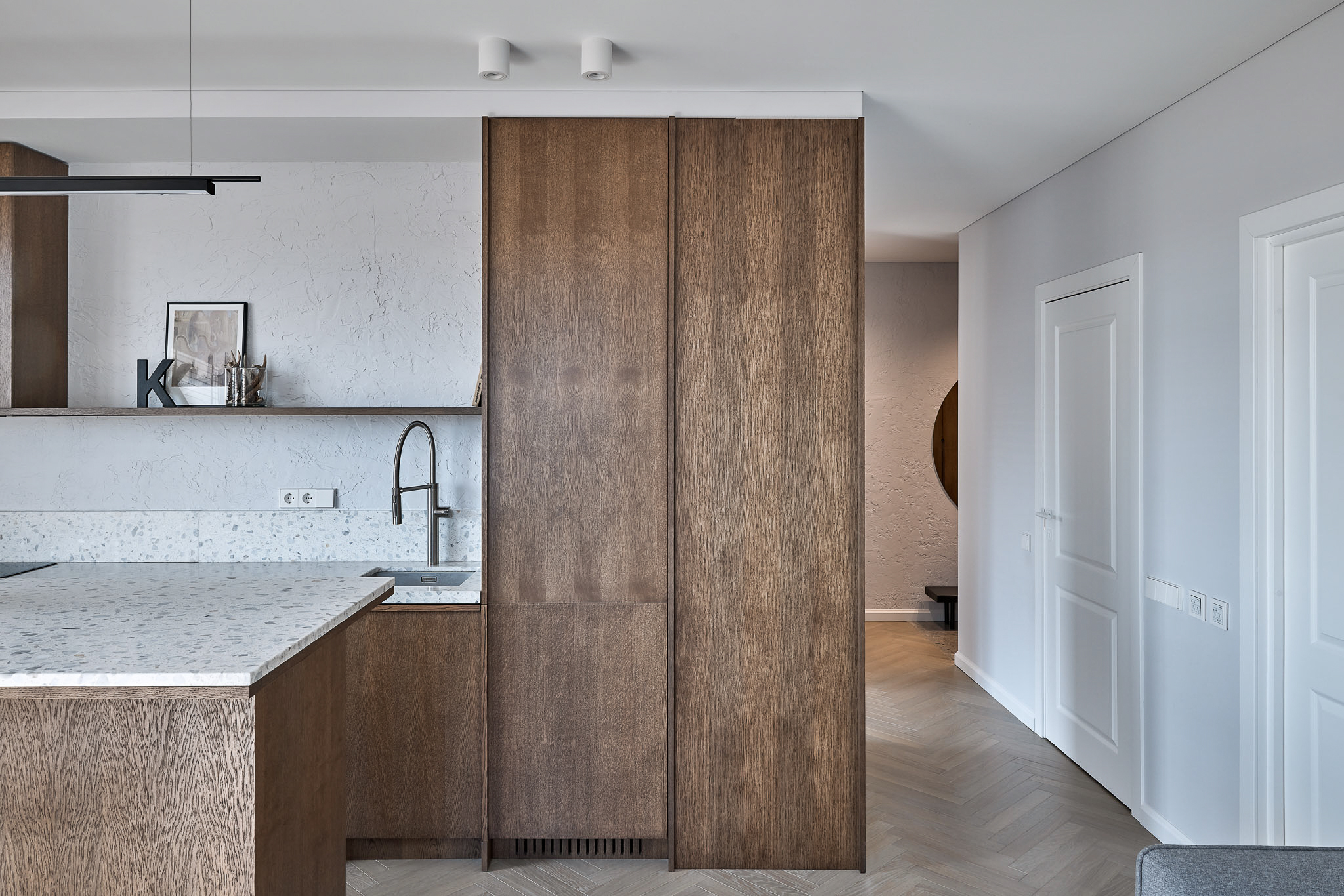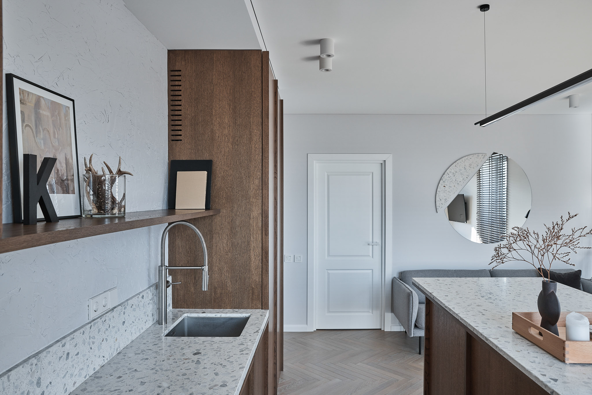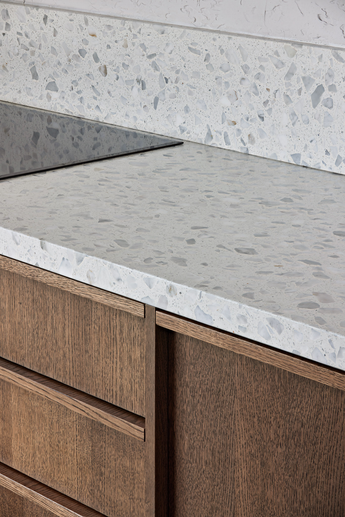 SB 250 Lido, con la sua base cementizia bianca e le graniglie di marmo grigie di diverse dimensioni, è stata impiegata per la cucina, il top e il piano del tavolo, unendo funzionalità e purezza estetica.