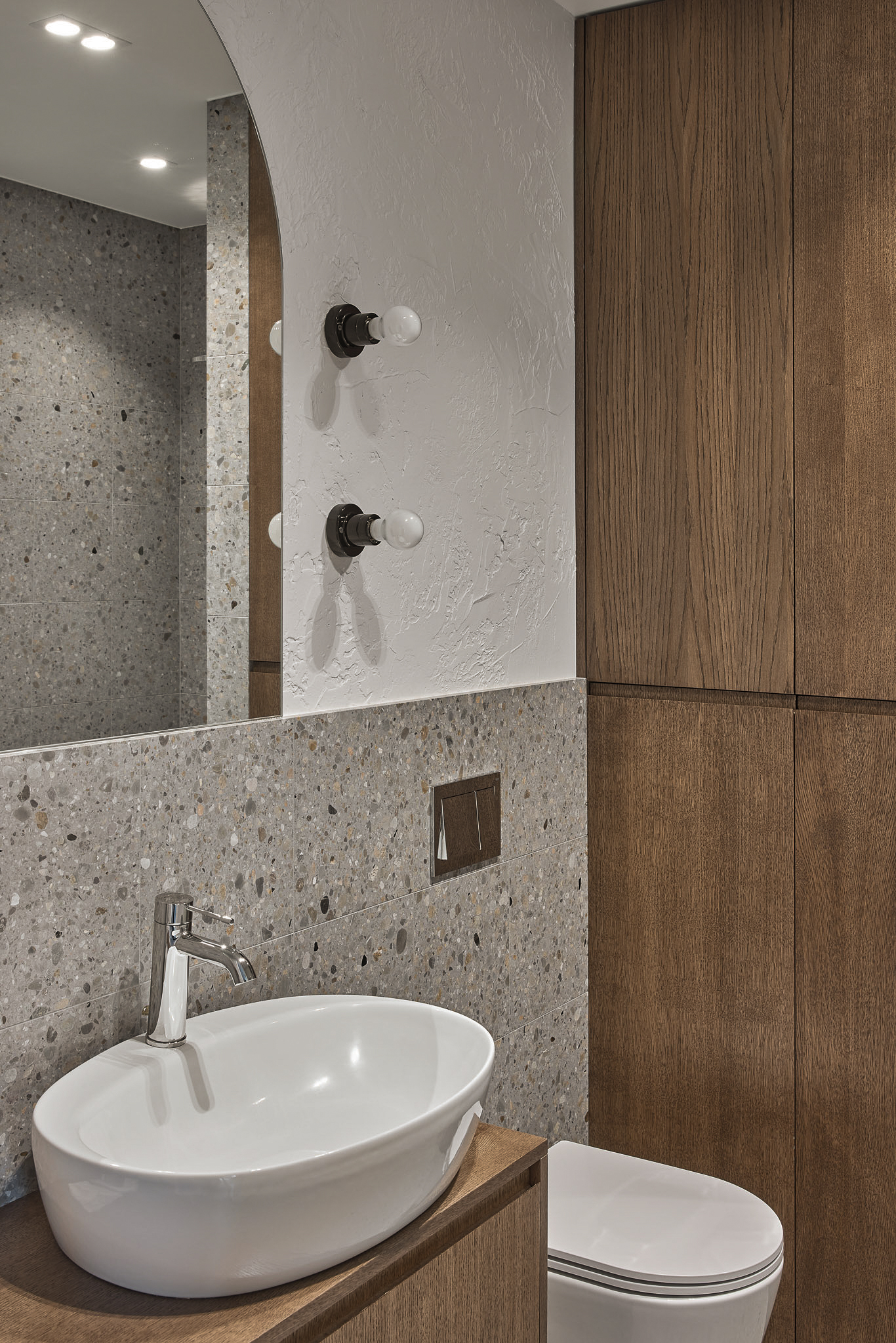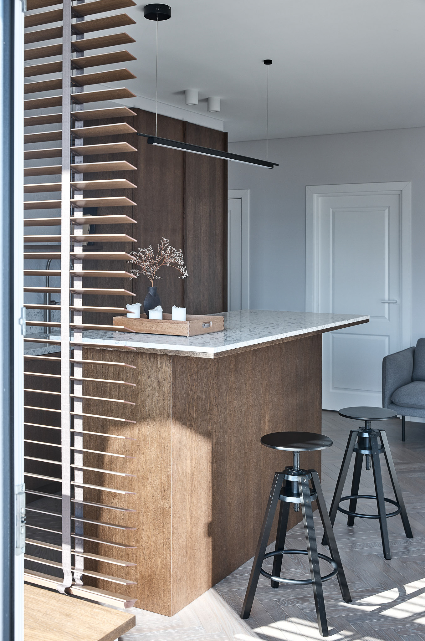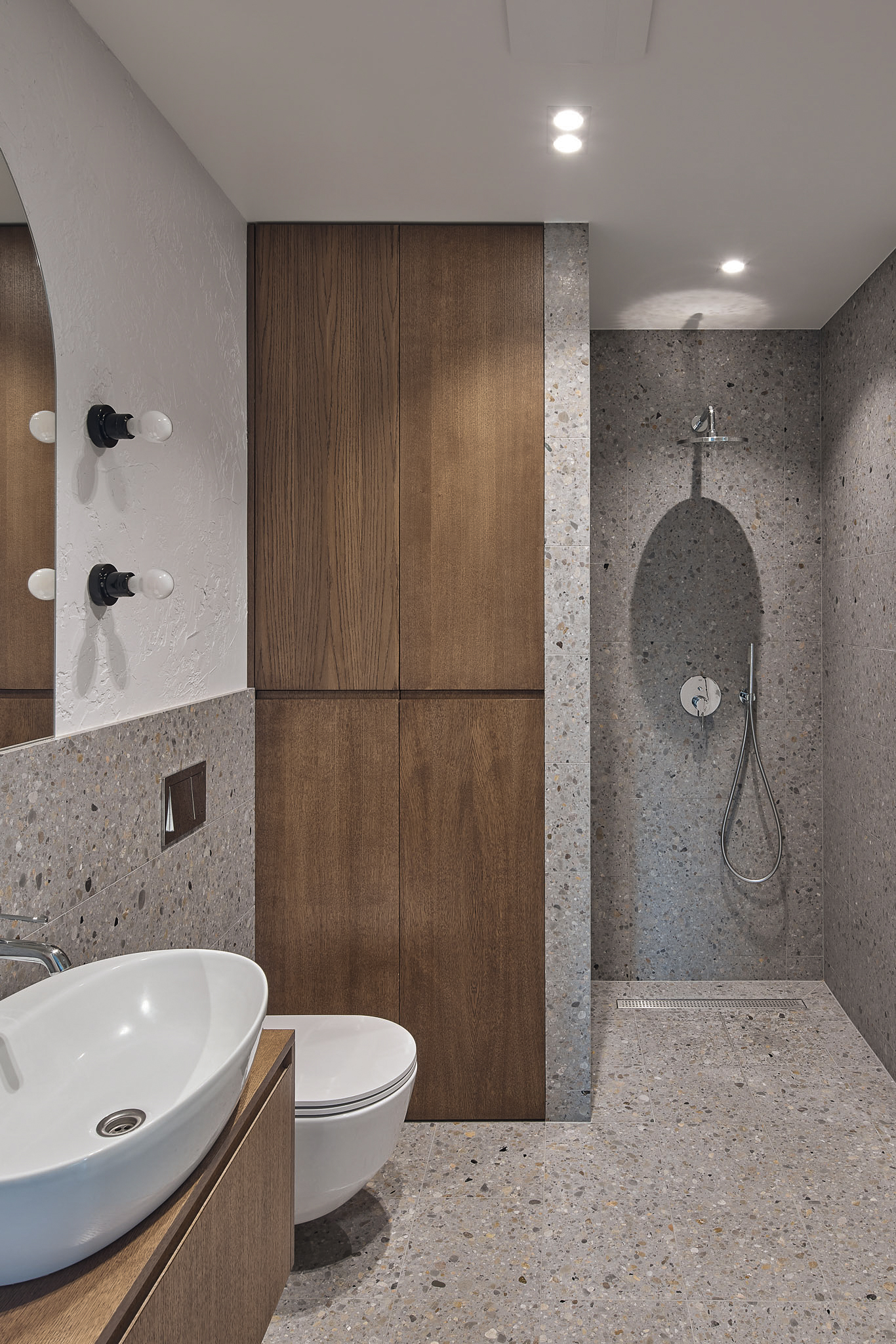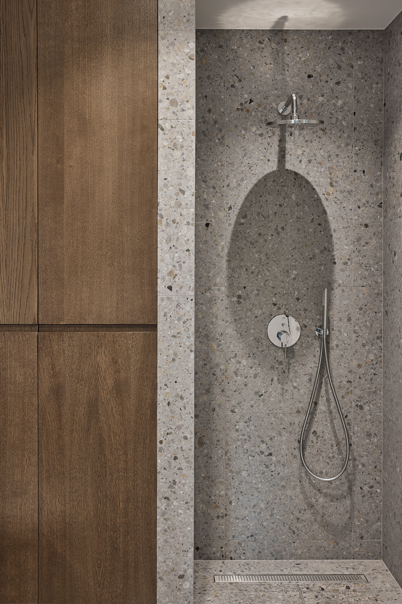 SB 250 Lido, con la sua base cementizia bianca e le graniglie di marmo grigie di diverse dimensioni, è stata impiegata per la cucina, il top e il piano del tavolo, unendo funzionalità e purezza estetica.
