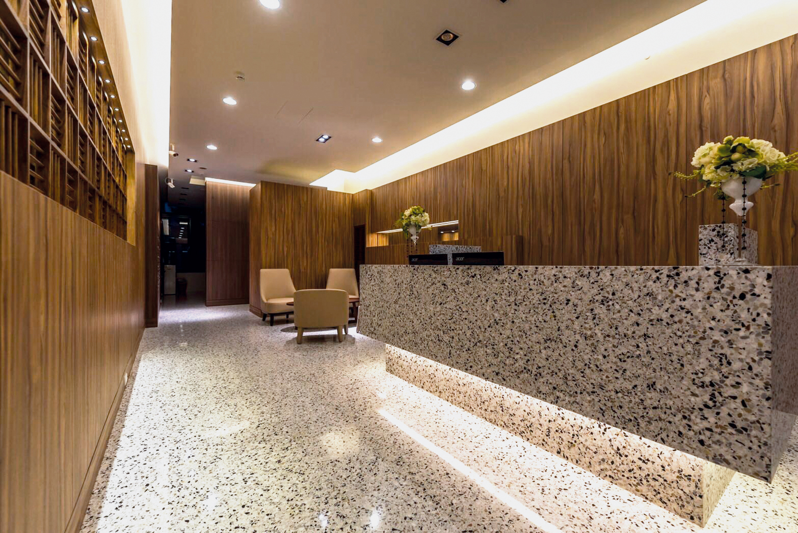 Il terrazzo è stato utilizzato non solo per i pavimenti, ma anche per la reception desk in massello, realizzata su misura a partire dal blocco di marmo cemento. Questo elemento, arricchito da inserti luminosi a LED, si inserisce in perfetta armonia con il design lineare e le finiture in legno circostanti.