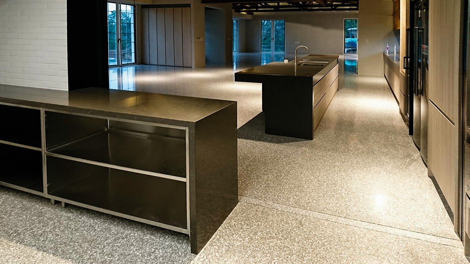 Per il progetto è stata selezionata la colorazione SB 173 Grigio Venato, caratterizzata da graniglia scura di medie dimensioni immersa in una base cementizia bianca. La finitura lucida amplifica la luminosità dello spazio, creando riflessi raffinati grazie al gioco di faretti e strisce LED.