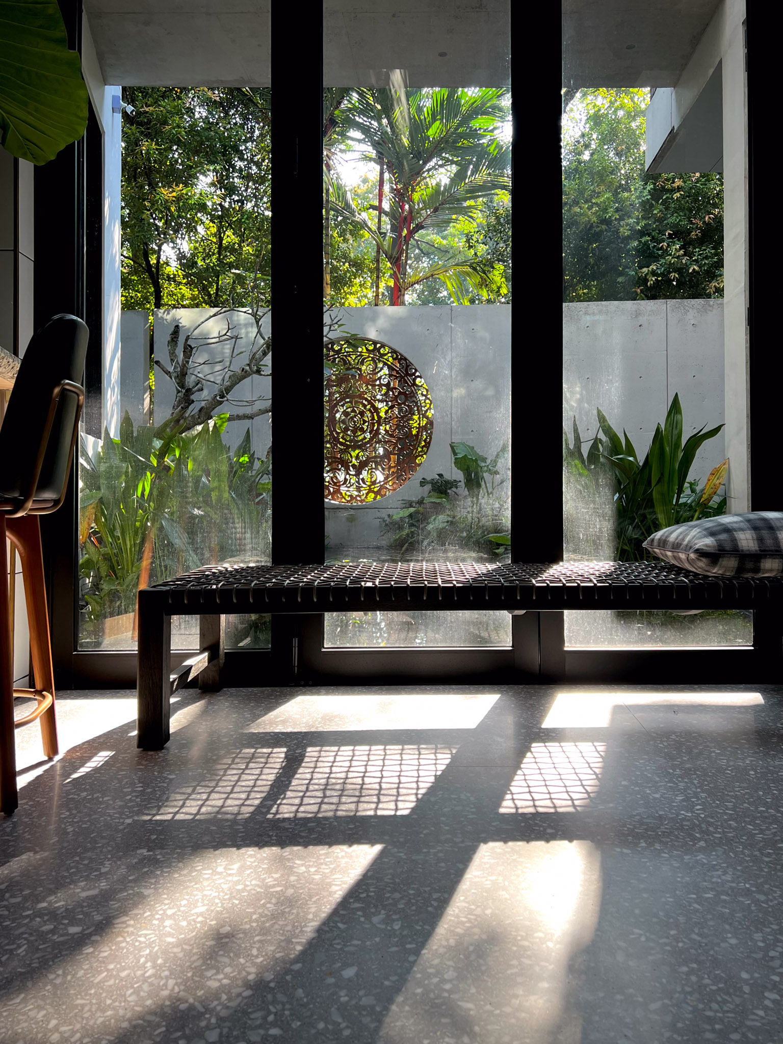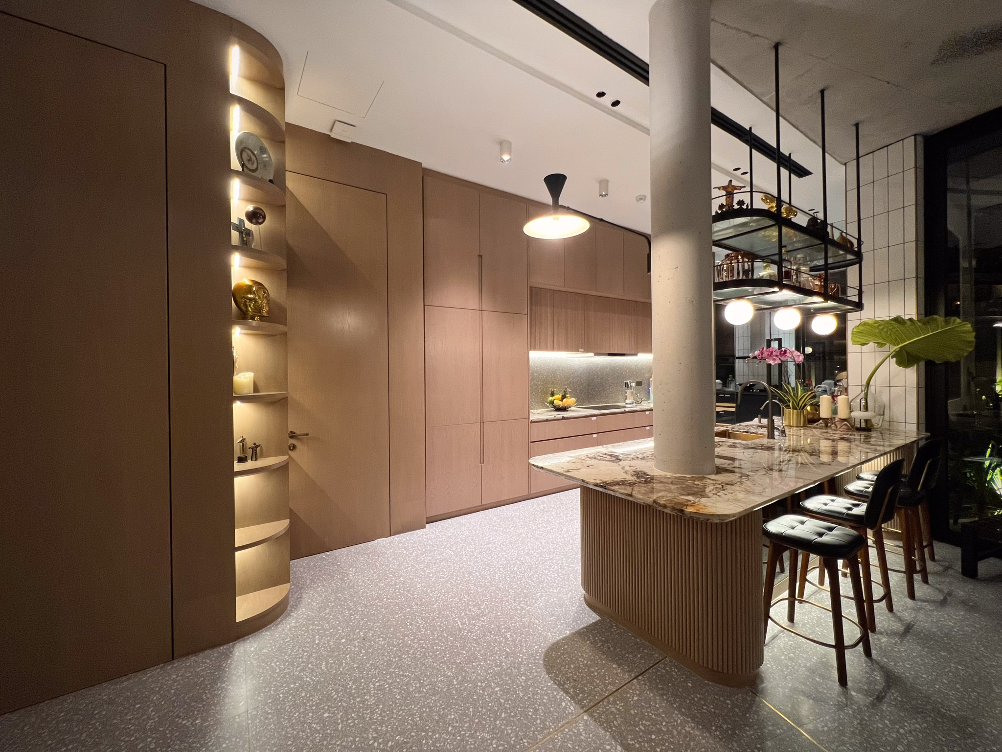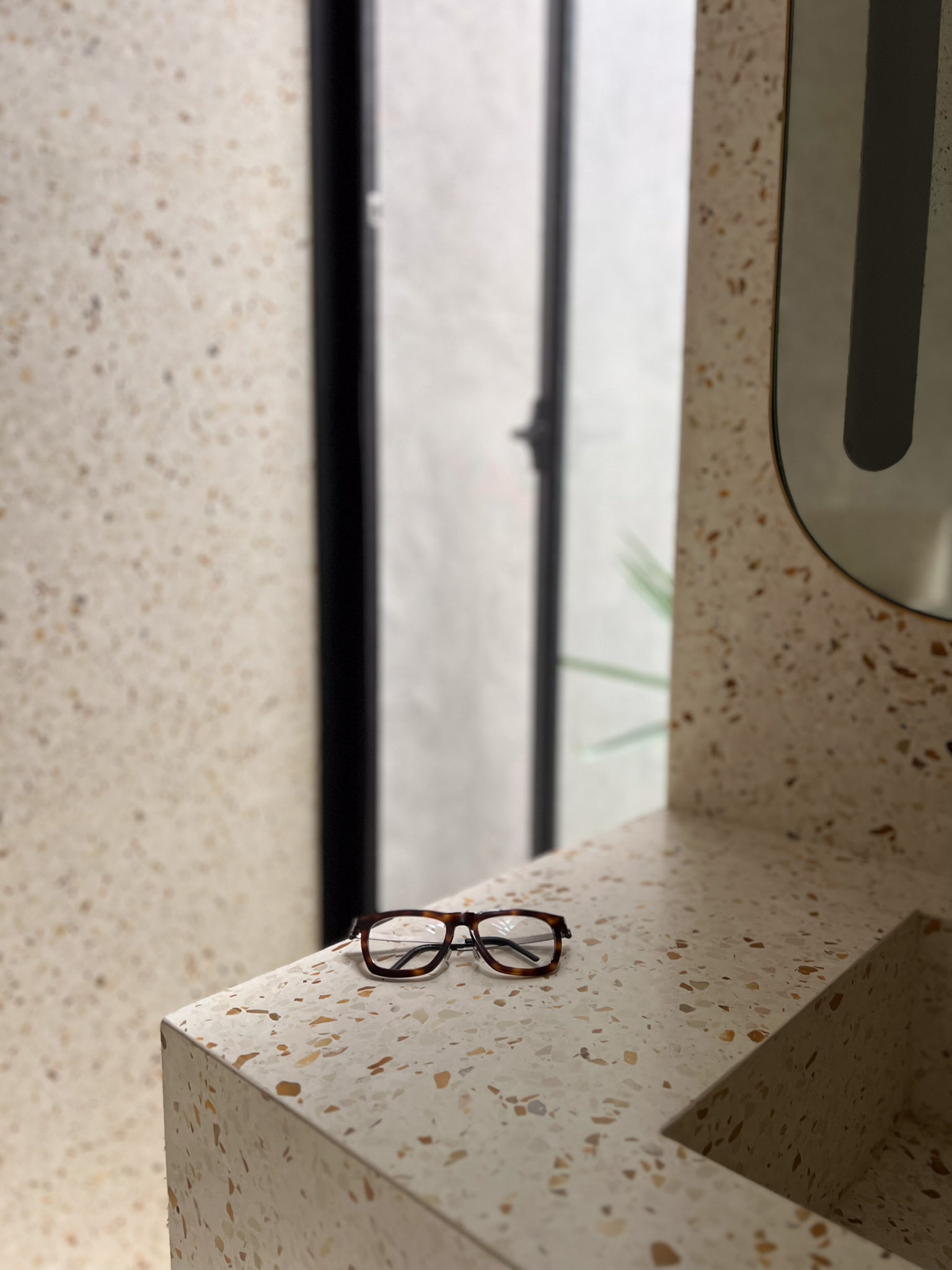 Le ampie vetrate lasciano filtrare la luce, che incontra le superfici in terrazzo e ne esalta le sfumature materiche, creando un dialogo continuo tra architettura e ambiente. Ogni dettaglio contribuisce a un’atmosfera di eleganza discreta e contemporanea, in cui la qualità artigianale diventa elemento distintivo dell’abitare.