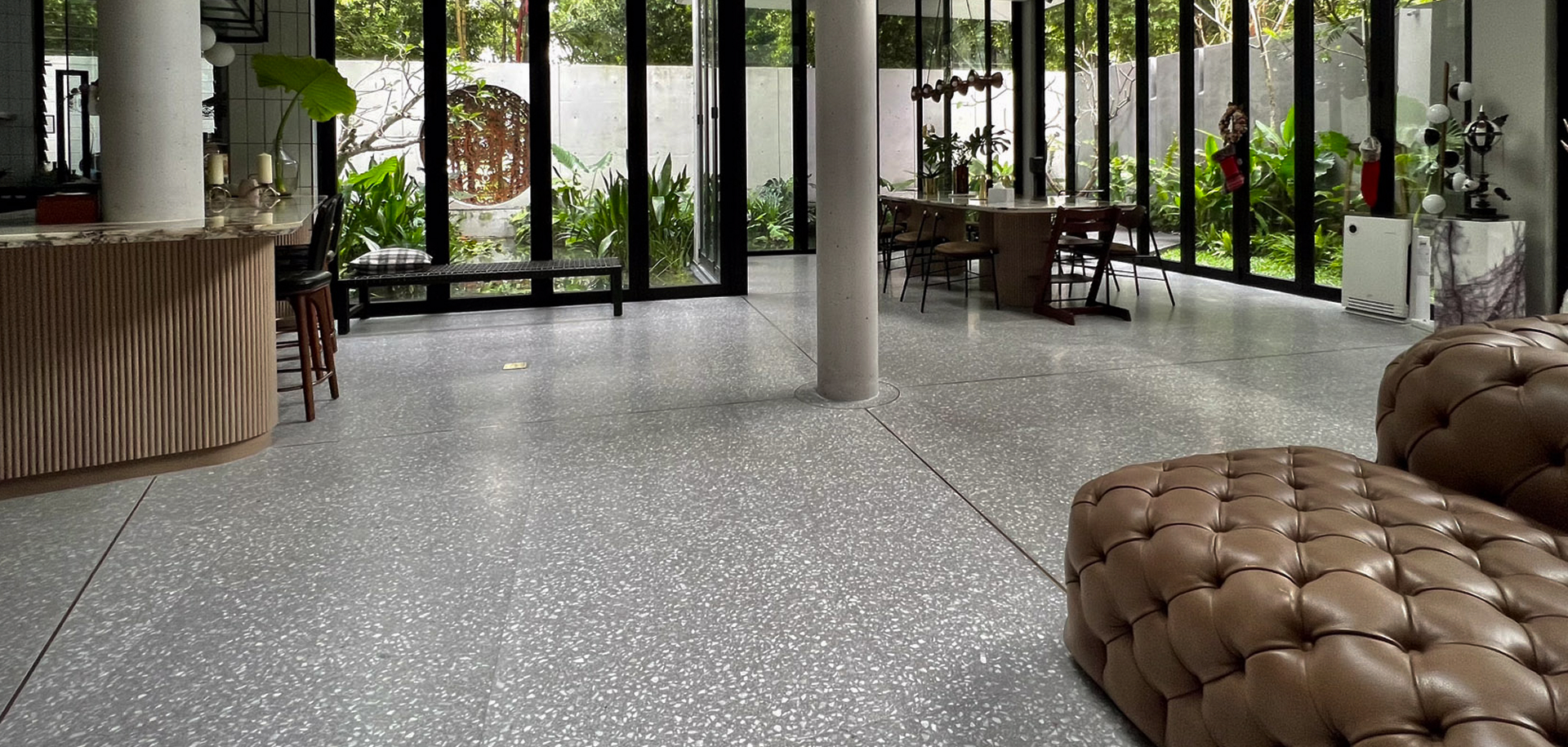 L’agglomerato di marmo e cemento, materiale robusto, versatile ed ecocompatibile, è stato utilizzato per i pavimenti della cucina, della sala da pranzo, dei corridoi, dei bagni e del patio esterno, conferendo continuità e armonia tra gli ambienti interni ed esterni.