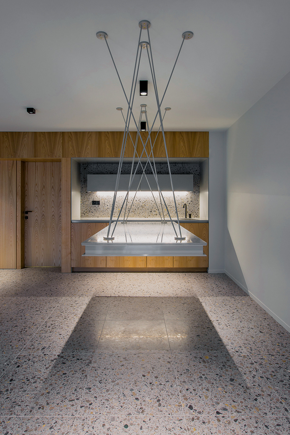 Il risultato è un ambiente caratterizzato da un equilibrio perfetto tra semplicità e raffinatezza, dove il pavimento alla veneziana diventa protagonista in dialogo con gli elementi in legno e le finiture moderne. La continuità materica del terrazzo è stata estesa anche ai bagni, dove la graniglia di marmo è stata utilizzata per rivestire sia le pavimentazioni sia le pareti verticali, creando un effetto visivo di grande coerenza e pregio.