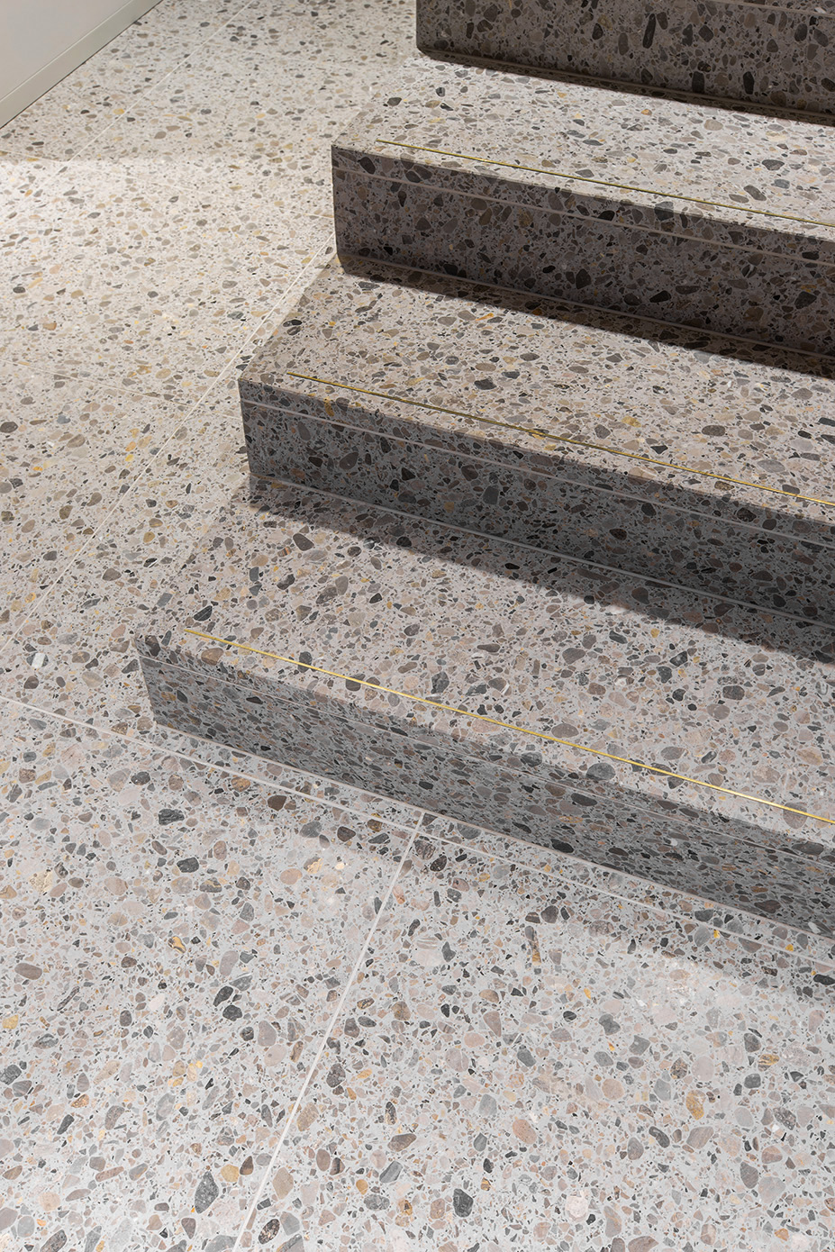 In collaborazione con lo studio Lapukas ir Pieštukas, è stata scelta la colorazione SB 124 Grigio Rotondo. Questo terrazzo si distingue per una graniglia di marmo di medie e grandi dimensioni, distribuita in una base cementizia grigia che conferisce profondità e movimento alla superficie.