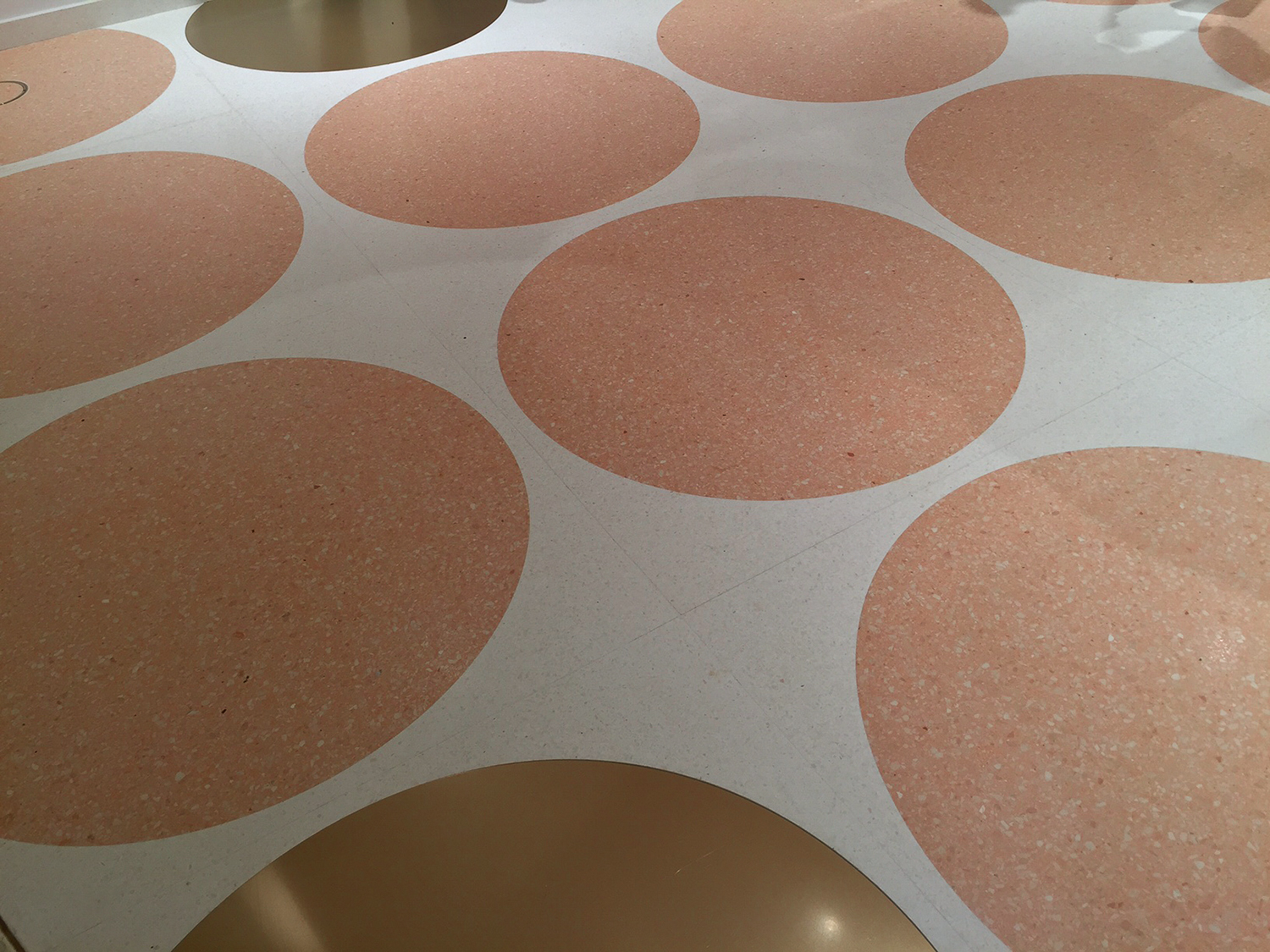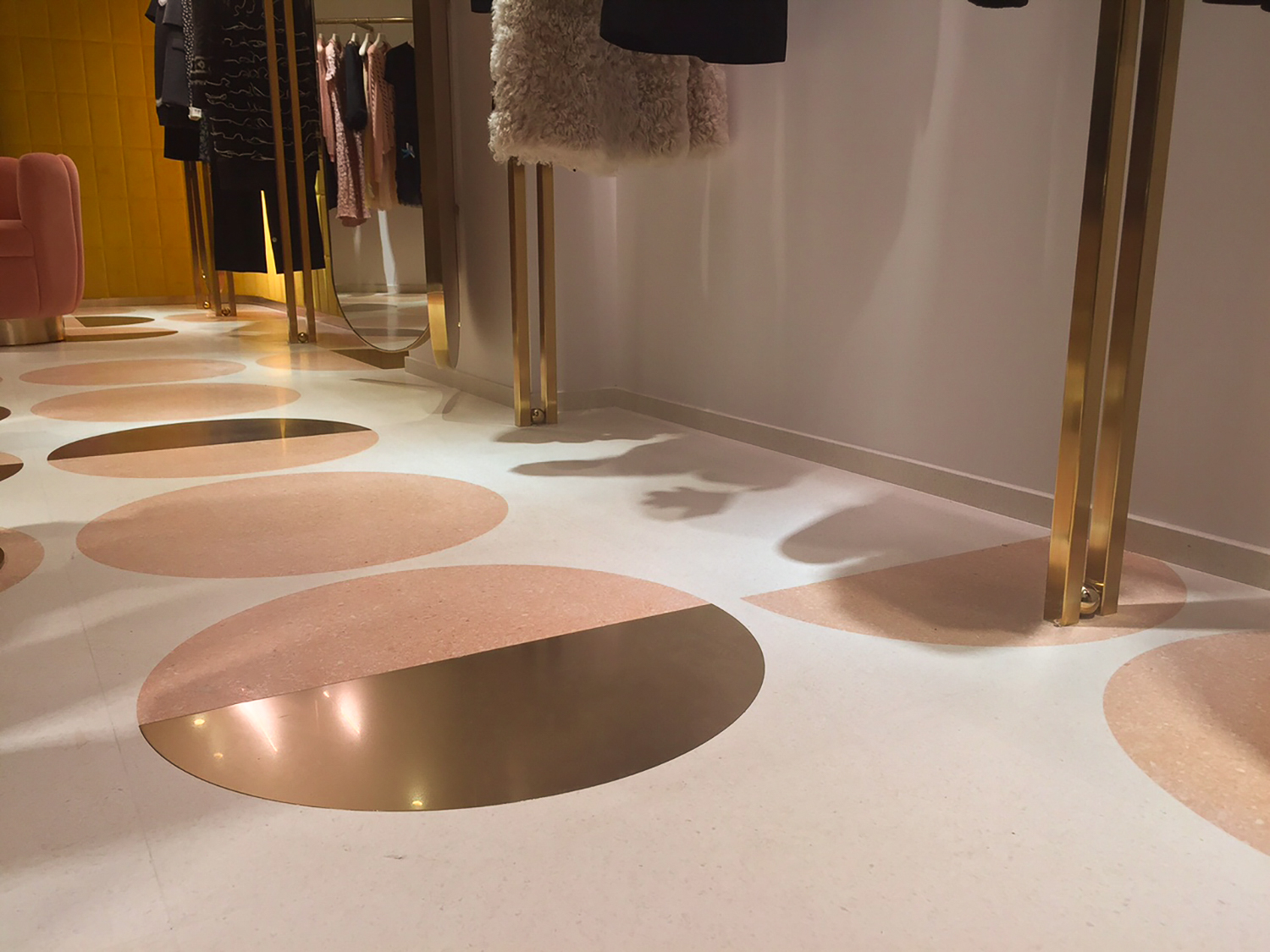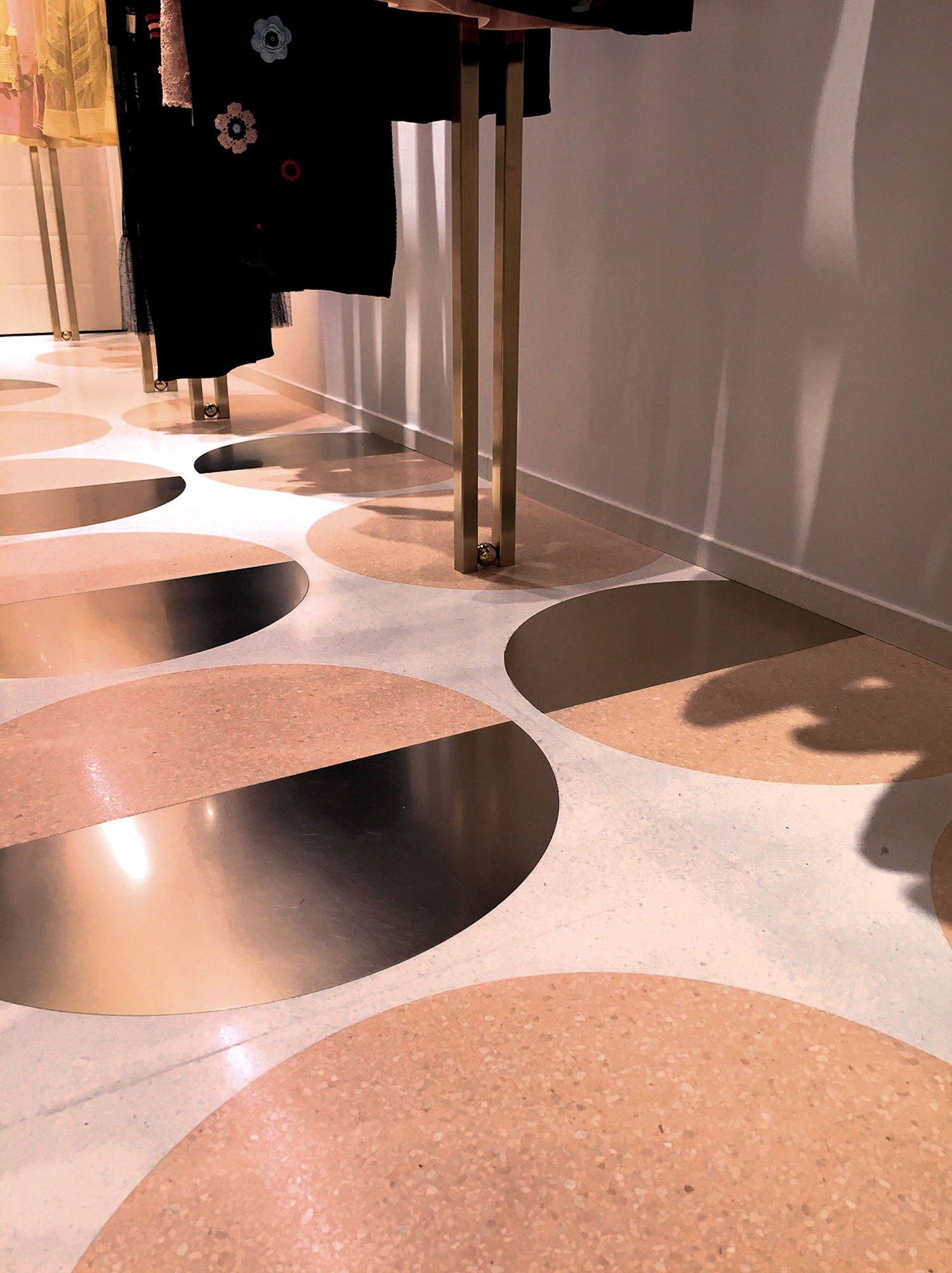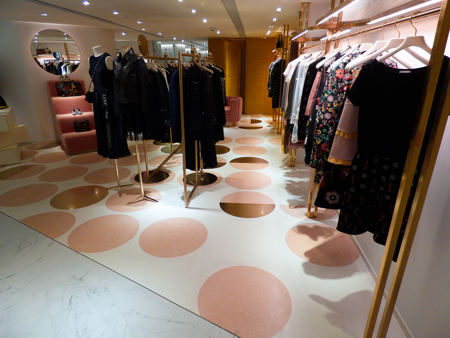 Per il Red Valentino store di Shenzen, Agglotech ha realizzato due colorazioni di terrazzo su misura: SB 135 Rosa e SB 136 Bianco Verona, posate in modo da formare un grande motivo circolare composto da due mezze lune, una rosa e una bianca.