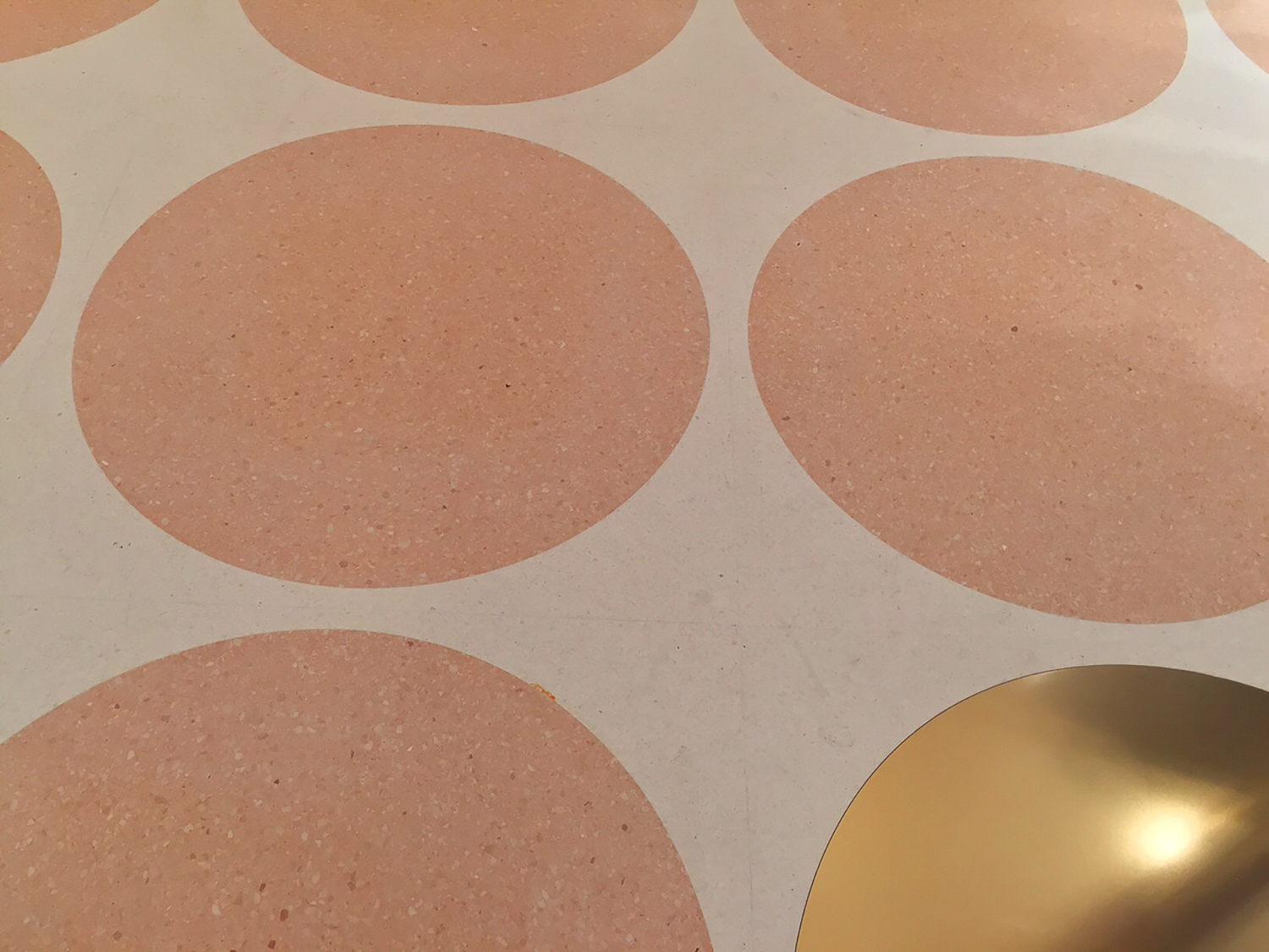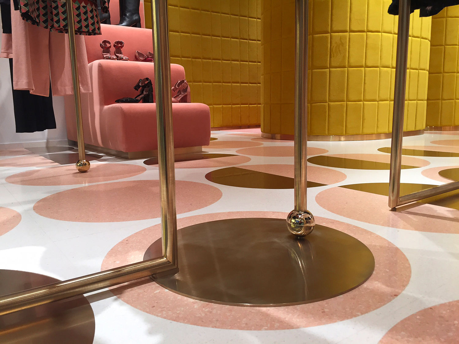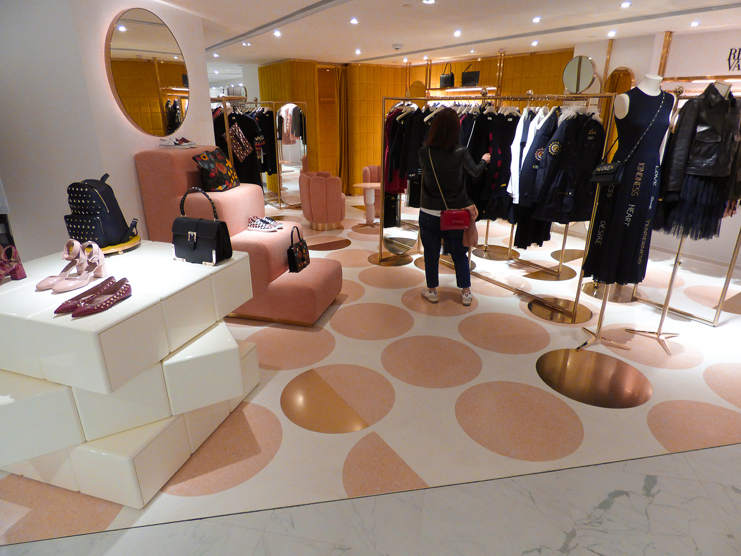 Per il Red Valentino store di Shenzen, Agglotech ha realizzato due colorazioni di terrazzo su misura: SB 135 Rosa e SB 136 Bianco Verona, posate in modo da formare un grande motivo circolare composto da due mezze lune, una rosa e una bianca.