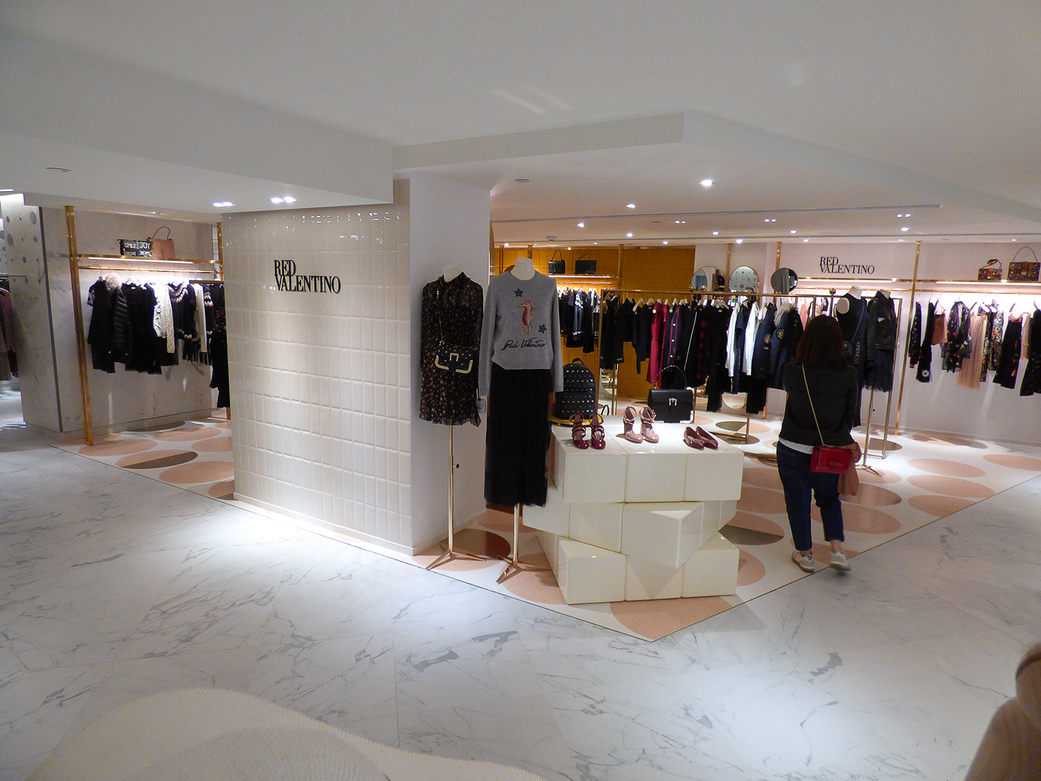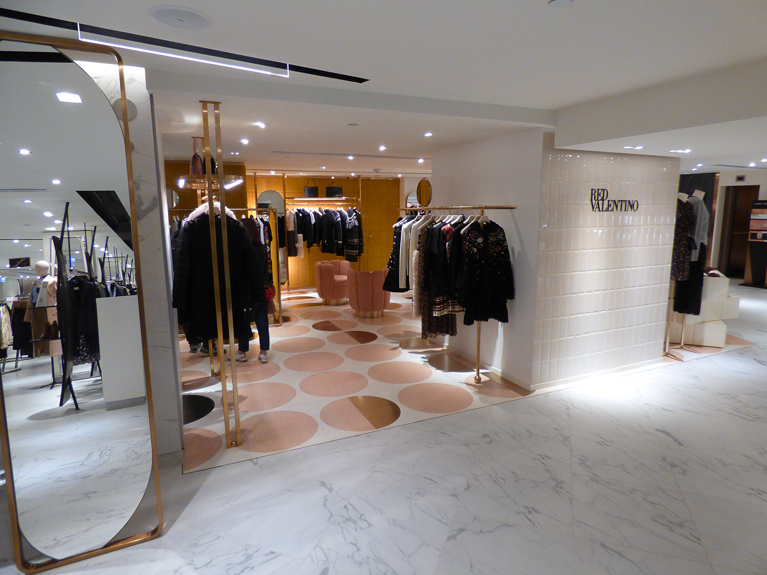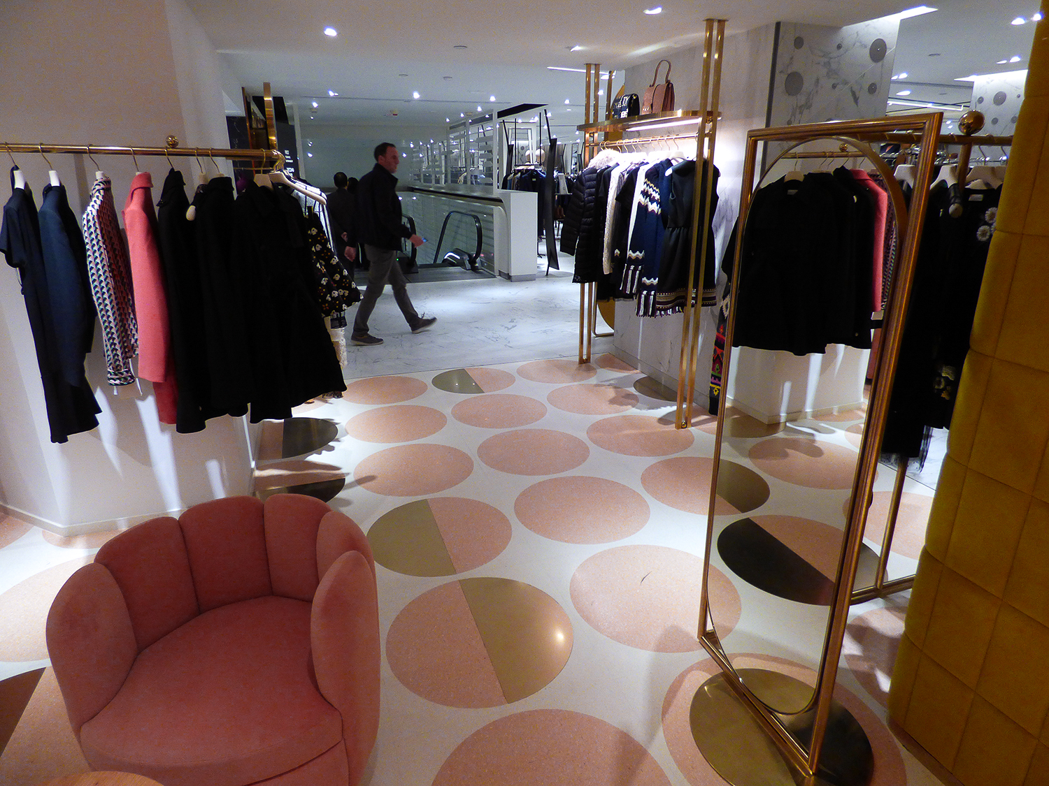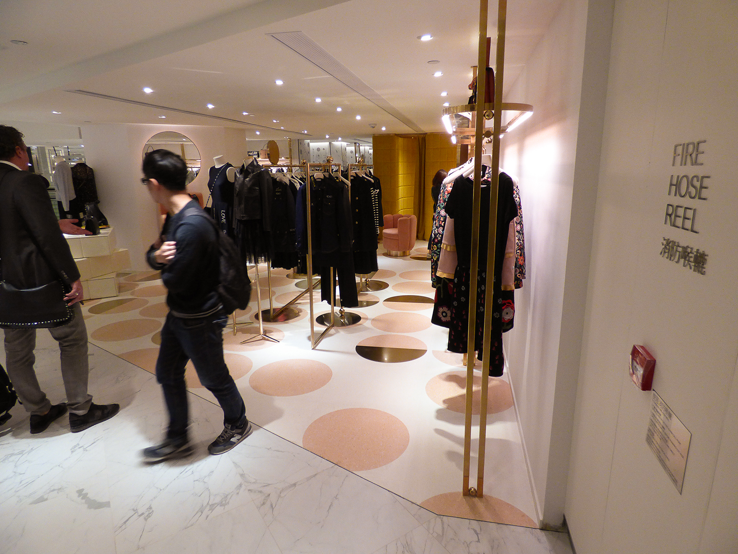Per il Red Valentino store di Shenzen, Agglotech ha realizzato due colorazioni di terrazzo su misura: SB 135 Rosa e SB 136 Bianco Verona, posate in modo da formare un grande motivo circolare composto da due mezze lune, una rosa e una bianca.