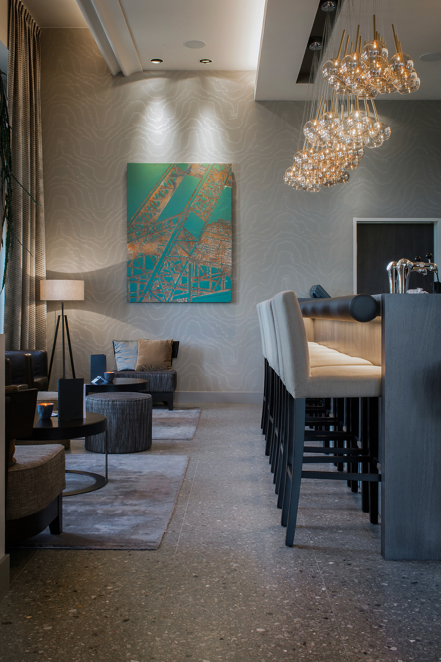 L’intervento ha coinvolto le principali aree comuni dell’hotel, tra cui hall, lounge e zone relax, dove il terrazzo diventa protagonista di un ambiente elegante e armonioso.
