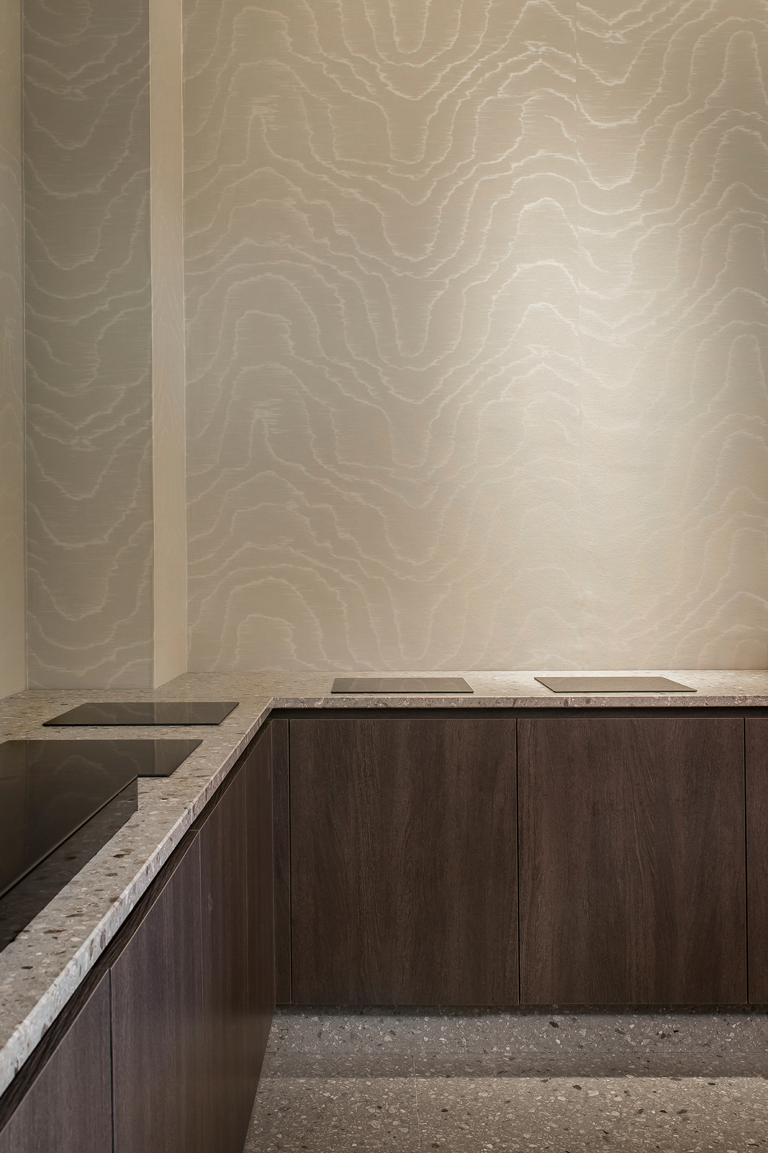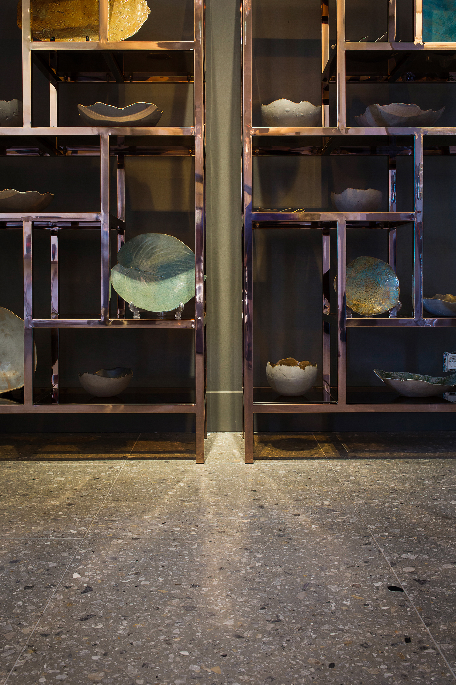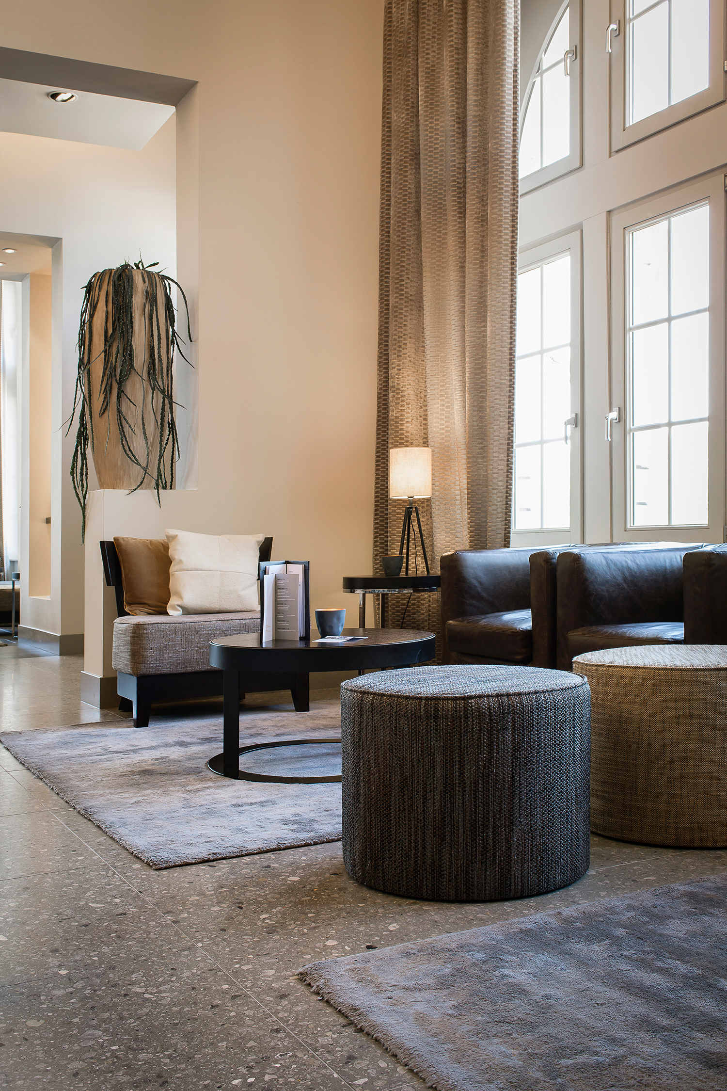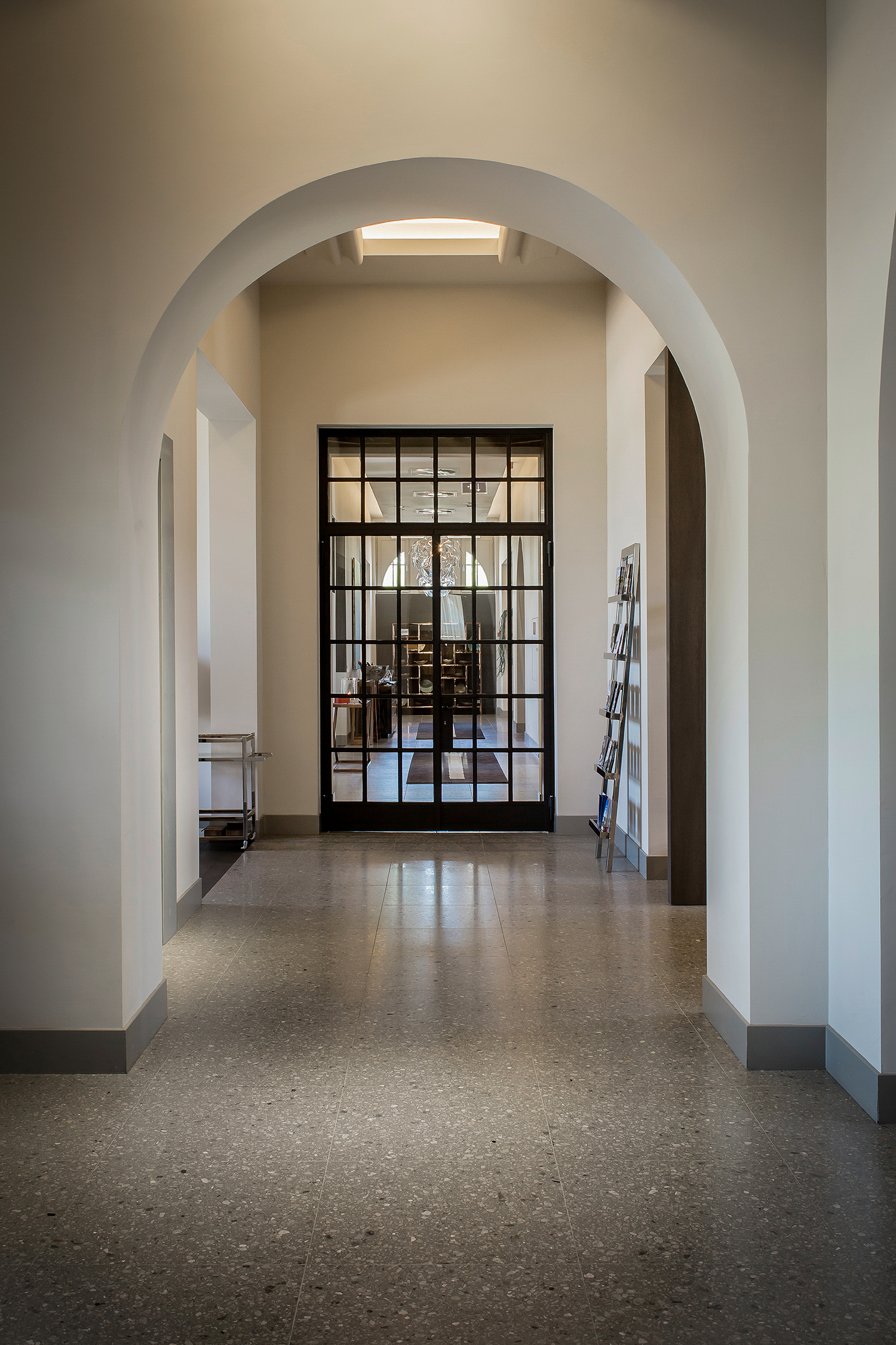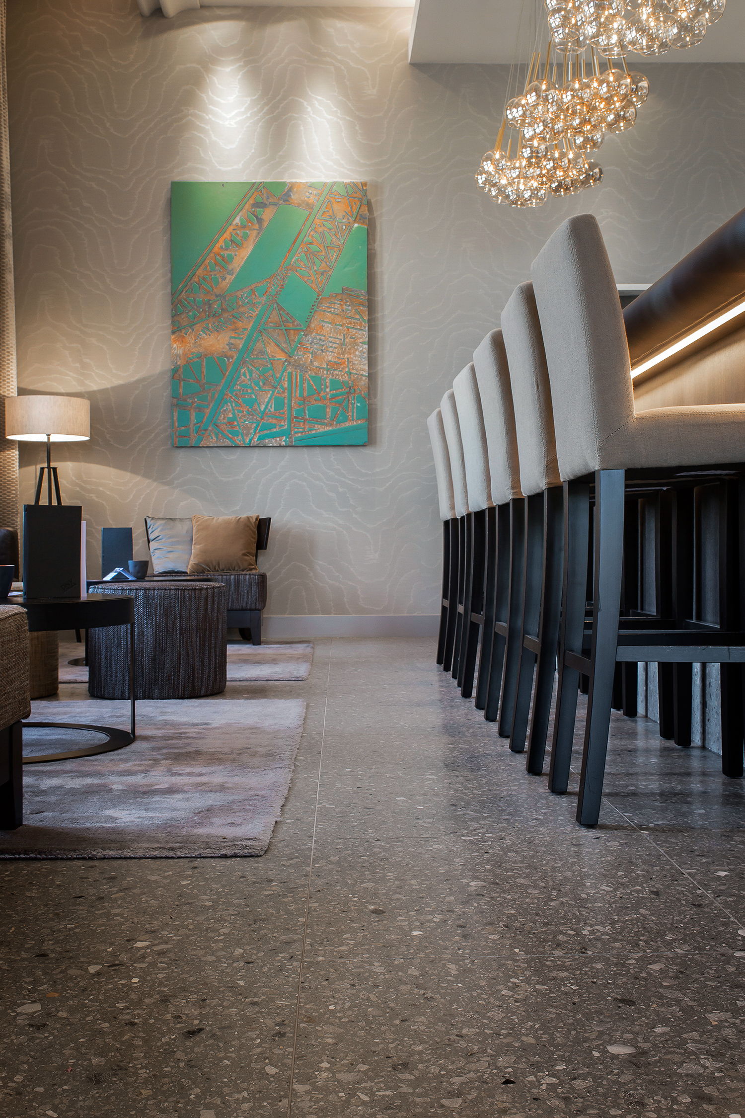 Questo terrazzo, dalla forte identità materica, si abbina perfettamente ai toni caldi dei tessuti, ai metalli satinati e al legno naturale che caratterizzano gli interni dell’hotel, conferendo equilibrio e continuità tra superfici e arredi.