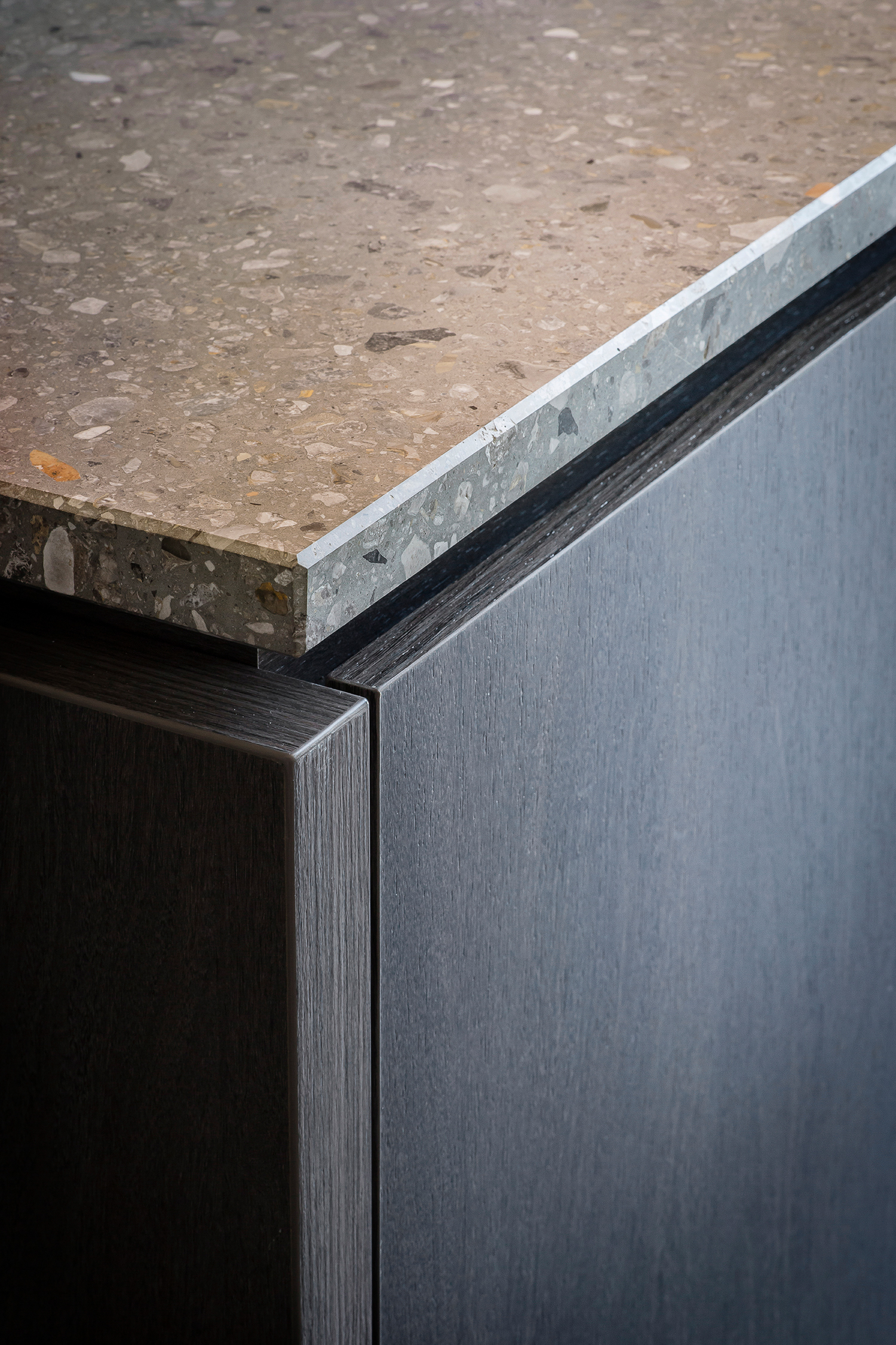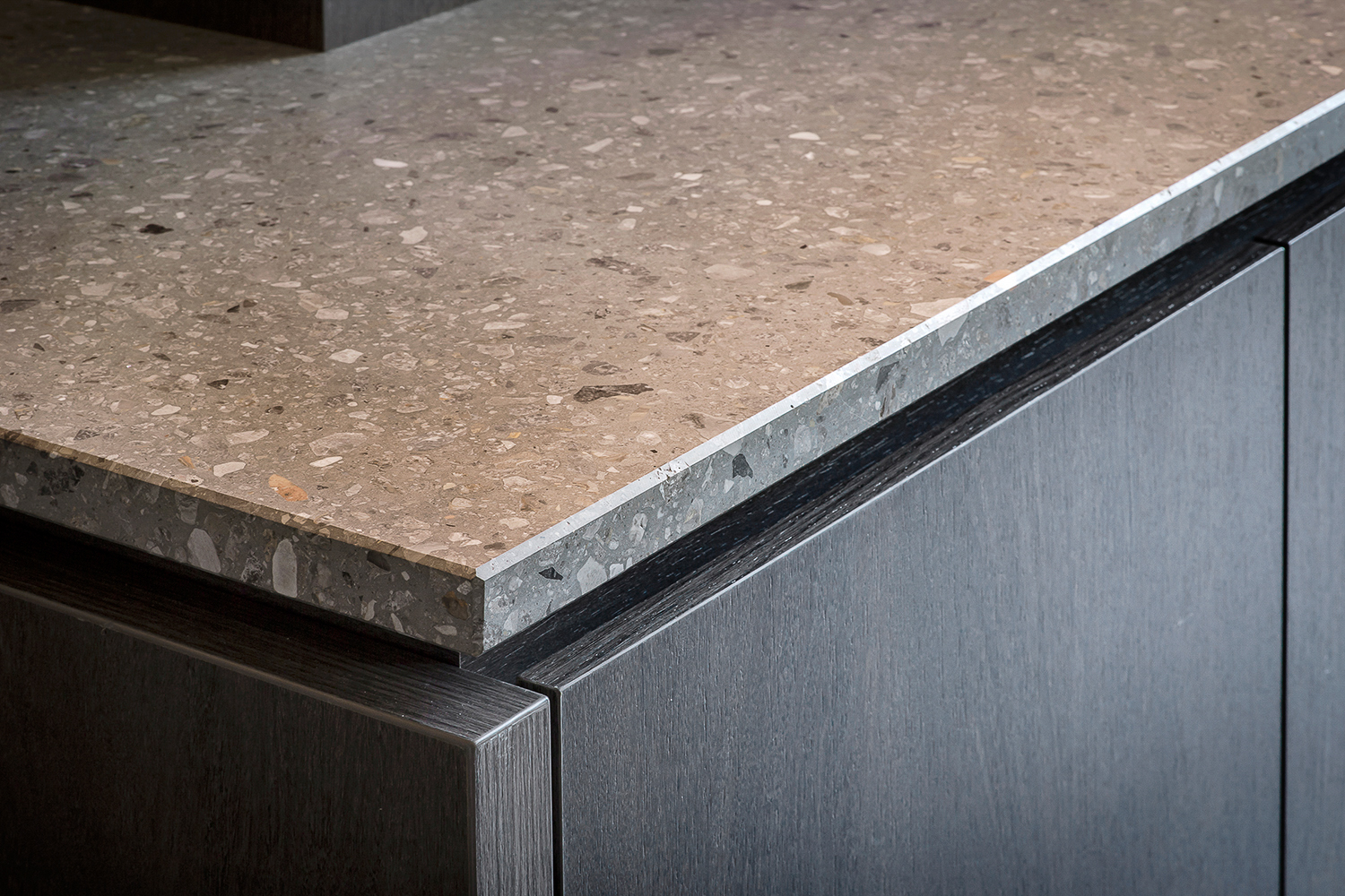 La colorazione SB 130 Aggloceppo, ispirata alle tonalità e alle venature del Ceppo di Gré, presenta graniglie di marmo di diverse dimensioni immerse in una base cementizia grigio scuro, creando un effetto visivo di grande profondità e naturalità.