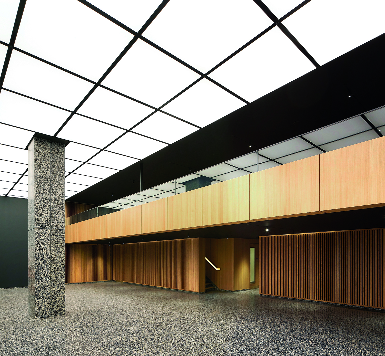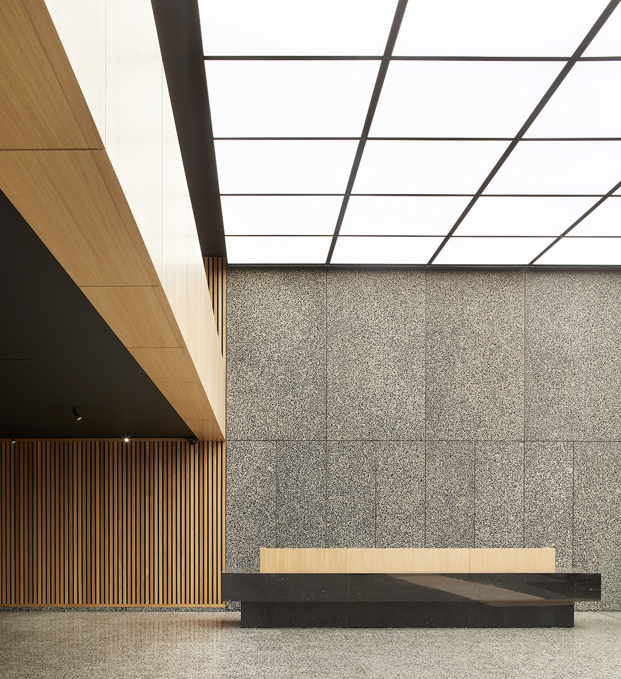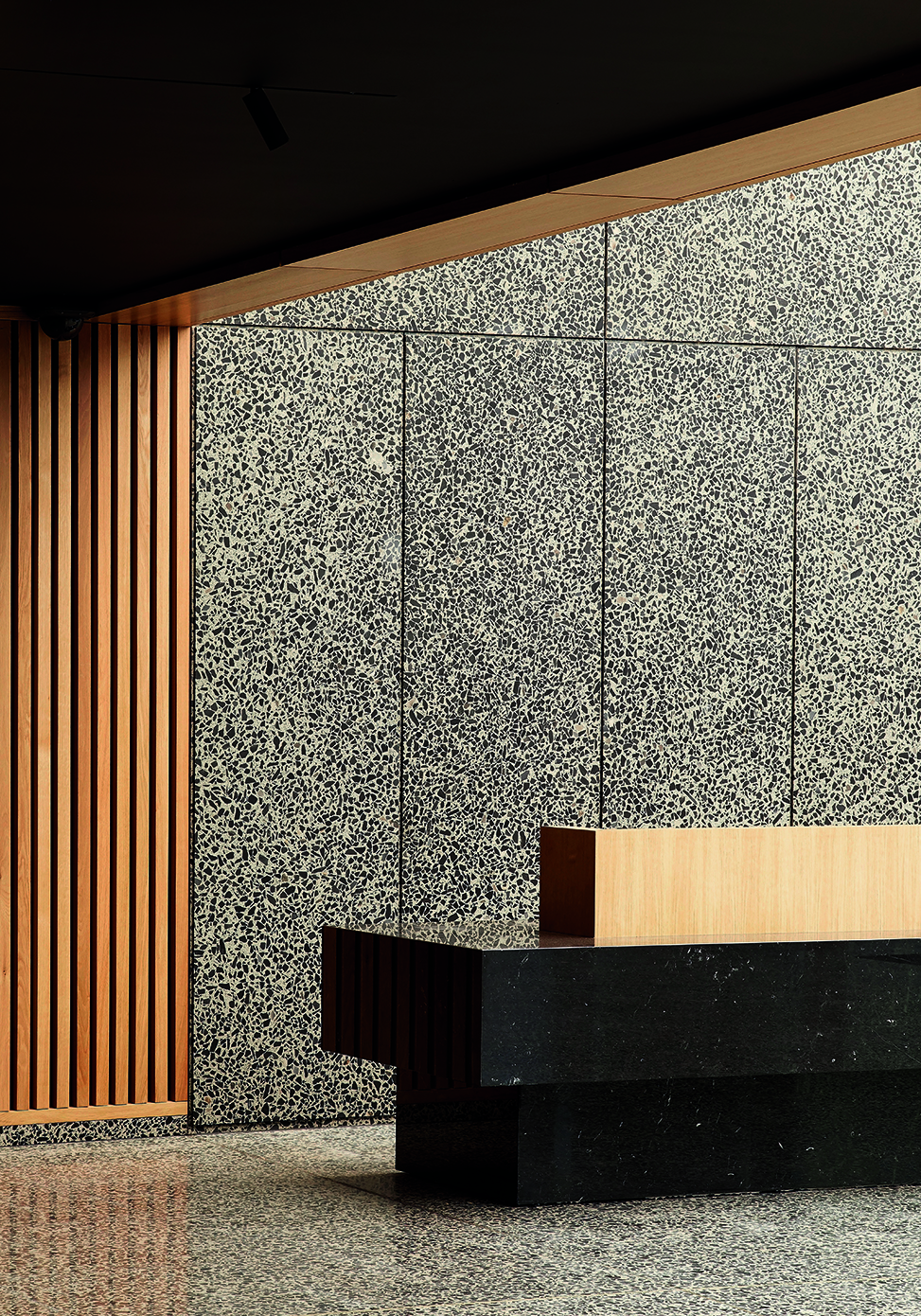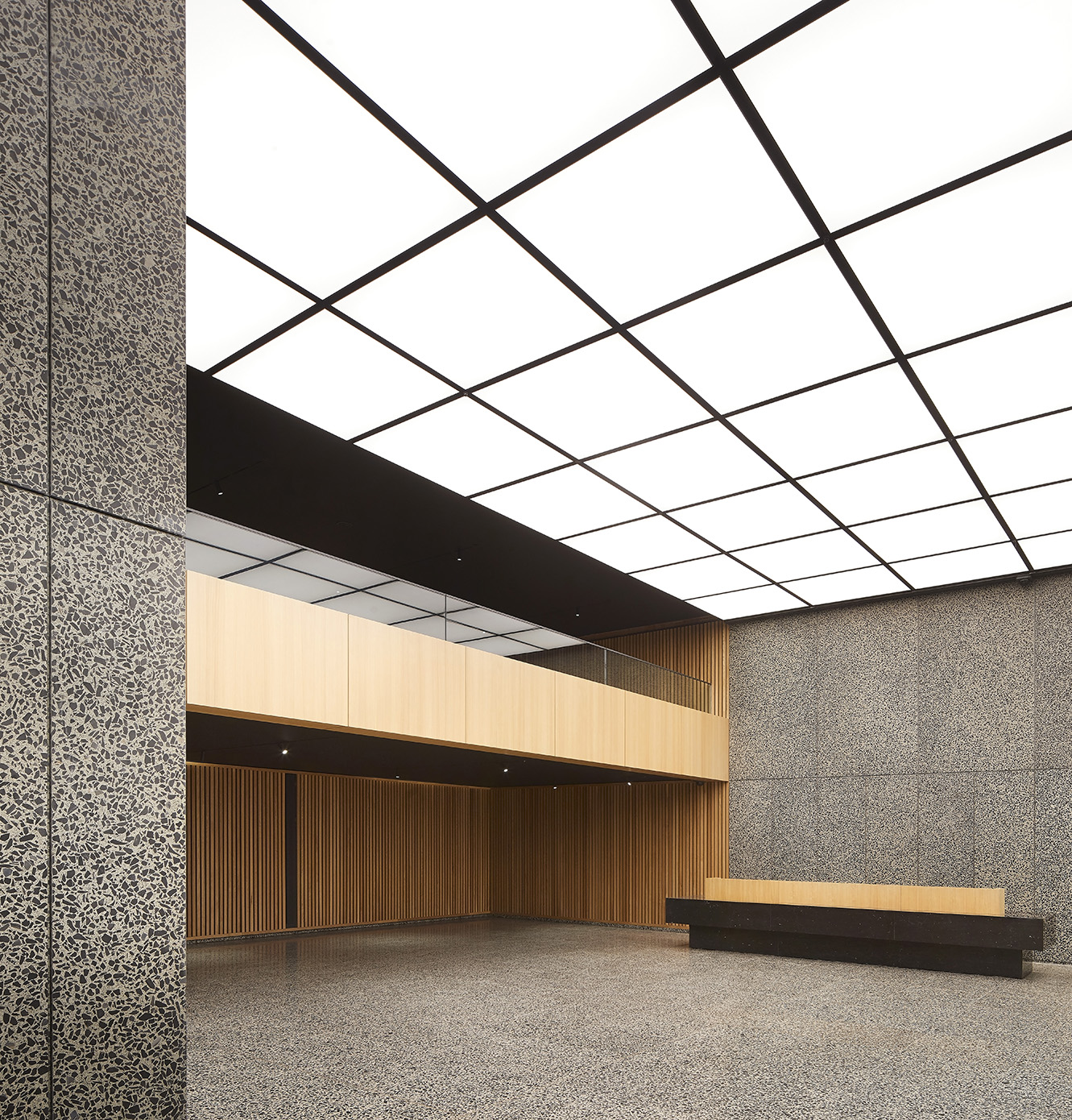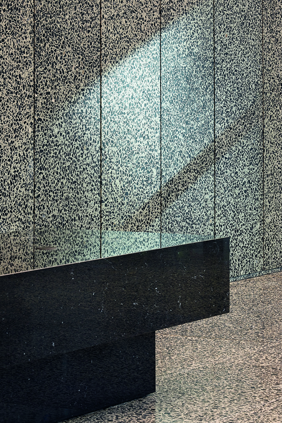 Per il progetto di Cabot Square 25 è stata selezionata la colorazione SB 260 Tronchetto, un terrazzo di forte impatto visivo caratterizzato da una base cementizia grigia arricchita da graniglie di marmo nero intenso di medie e grandi dimensioni. Il contrasto tra le tonalità neutre e le inclusioni scure crea una texture dinamica e sofisticata, ideale per ambienti direzionali di alto livello.