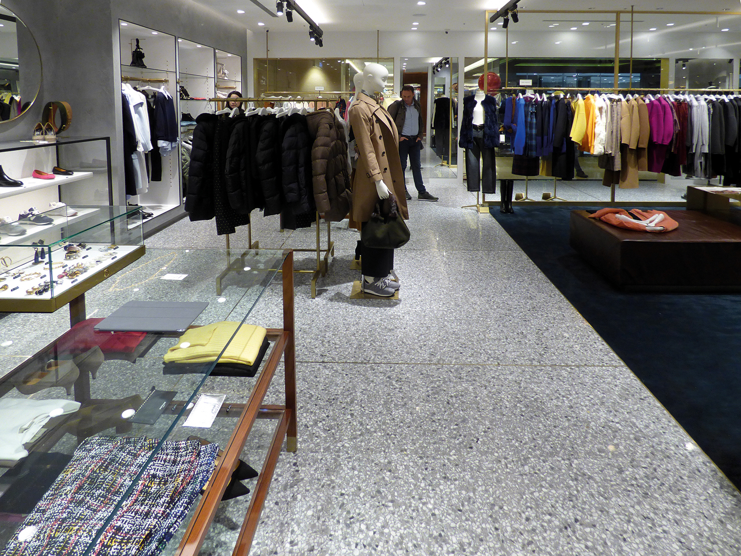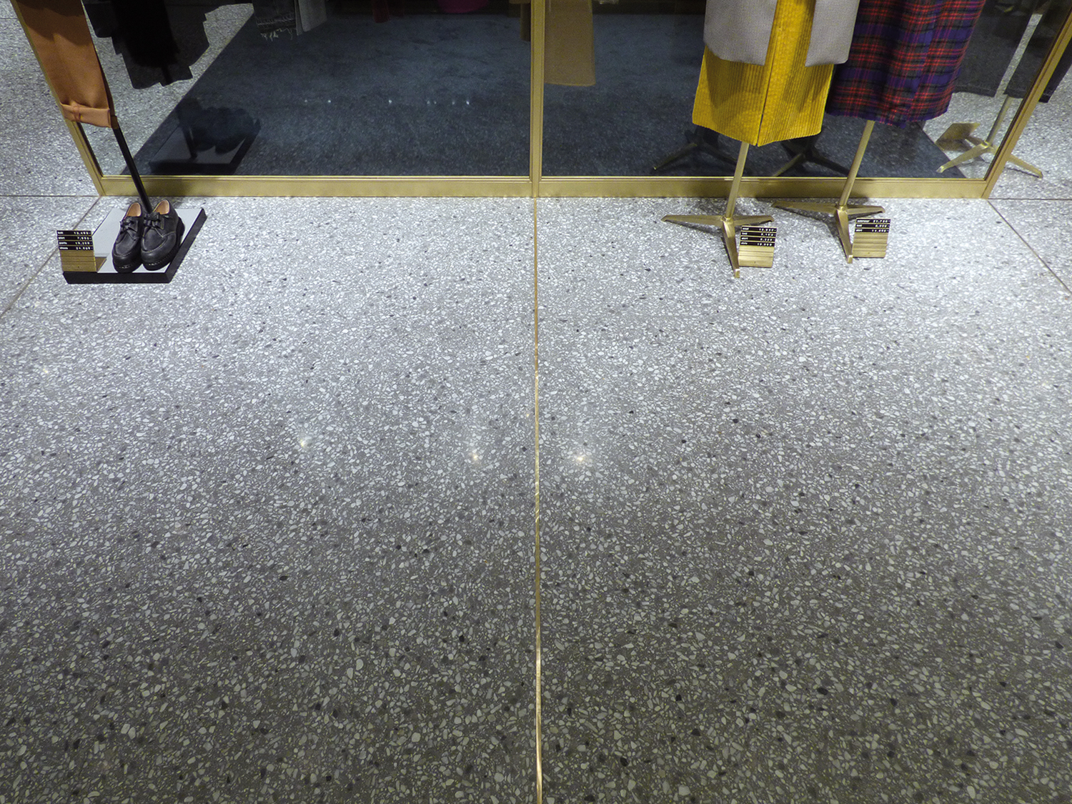 La pavimentazione in terrazzo Agglotech REG 2998 si distingue per un elegante grigio fumo, arricchito da graniglia bianca e grigia di varie dimensioni. Una combinazione che dona al negozio un aspetto moderno e ricercato, perfettamente in linea con l’immagine raffinata del brand.