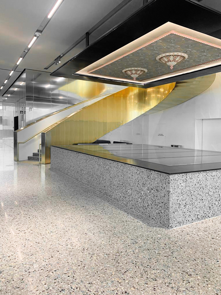 Agglotech ha contribuito al progetto con la fornitura del proprio terrazzo alla veneziana in marmo e cemento Portland, sviluppato in collaborazione con il distributore European Ceramics. Il materiale, scelto per pavimenti e scale, si distingue per la sua capacità di conferire autenticità e valore estetico agli ambienti, in continuità con la vocazione culturale del museo.