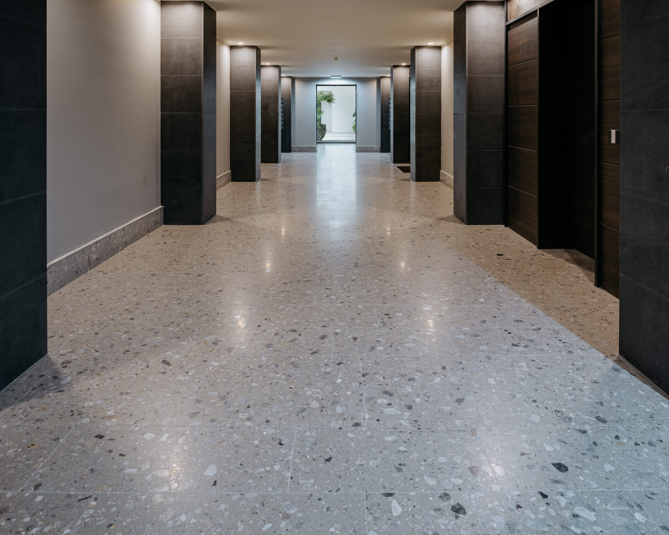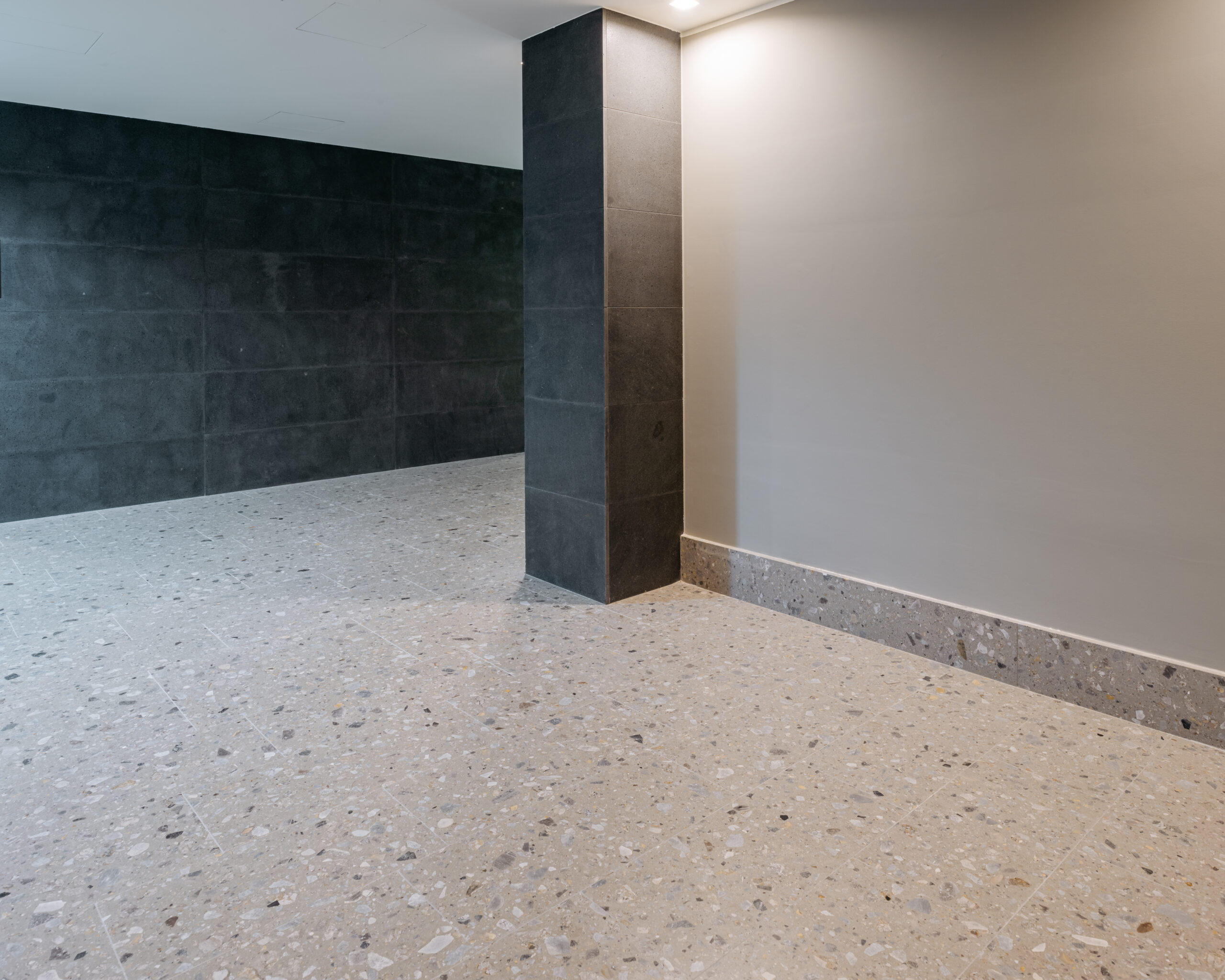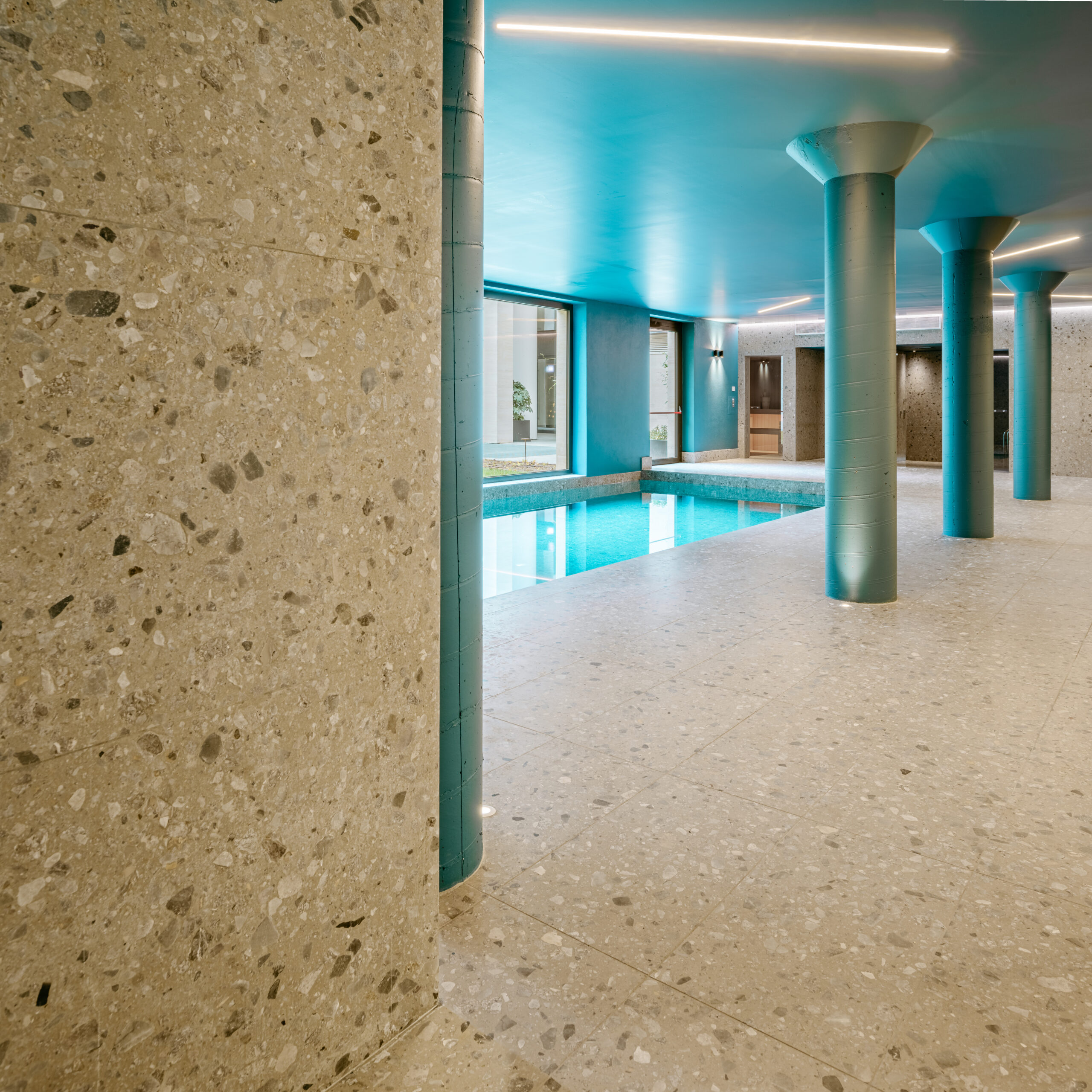 Per il Washington Building Agglotech ha realizzato superfici in terrazzo alla veneziana nella colorazione SB 130 Aggloceppo, utilizzata per pavimenti e rivestimenti di lobby, percorsi, spa e area piscina. Questa tonalità, delicata e naturale, si integra con i materiali architettonici circostanti e sottolinea il carattere contemporaneo del complesso.
