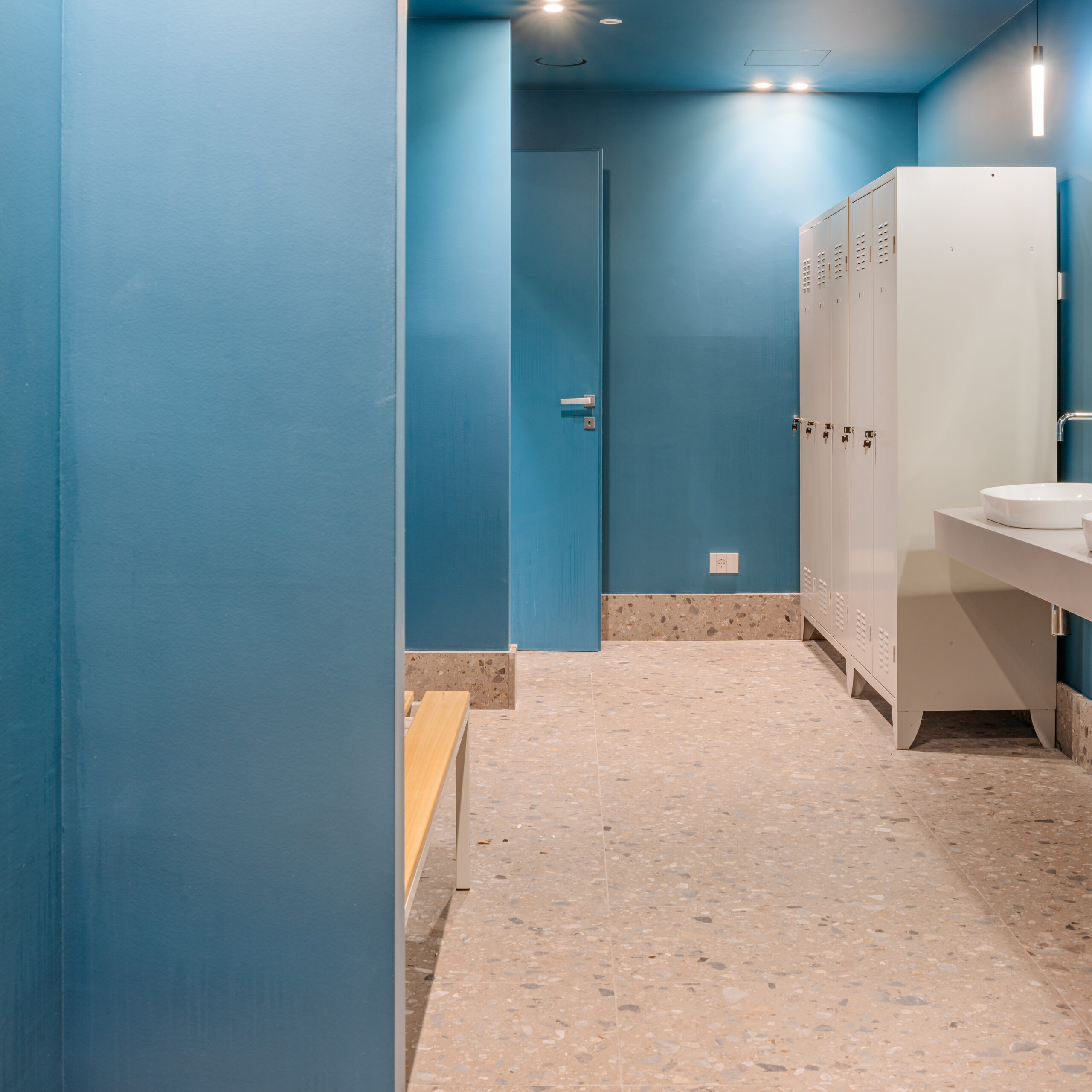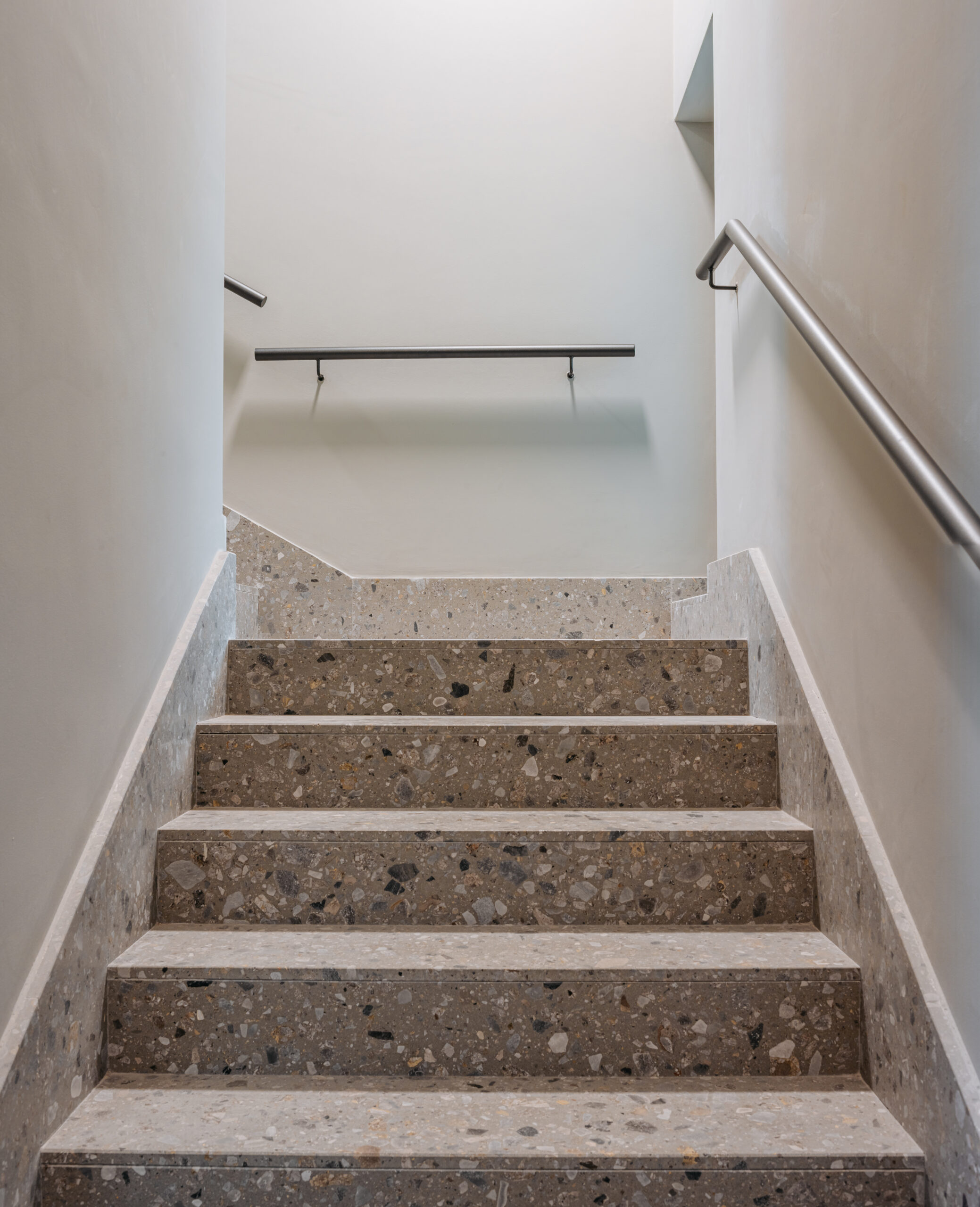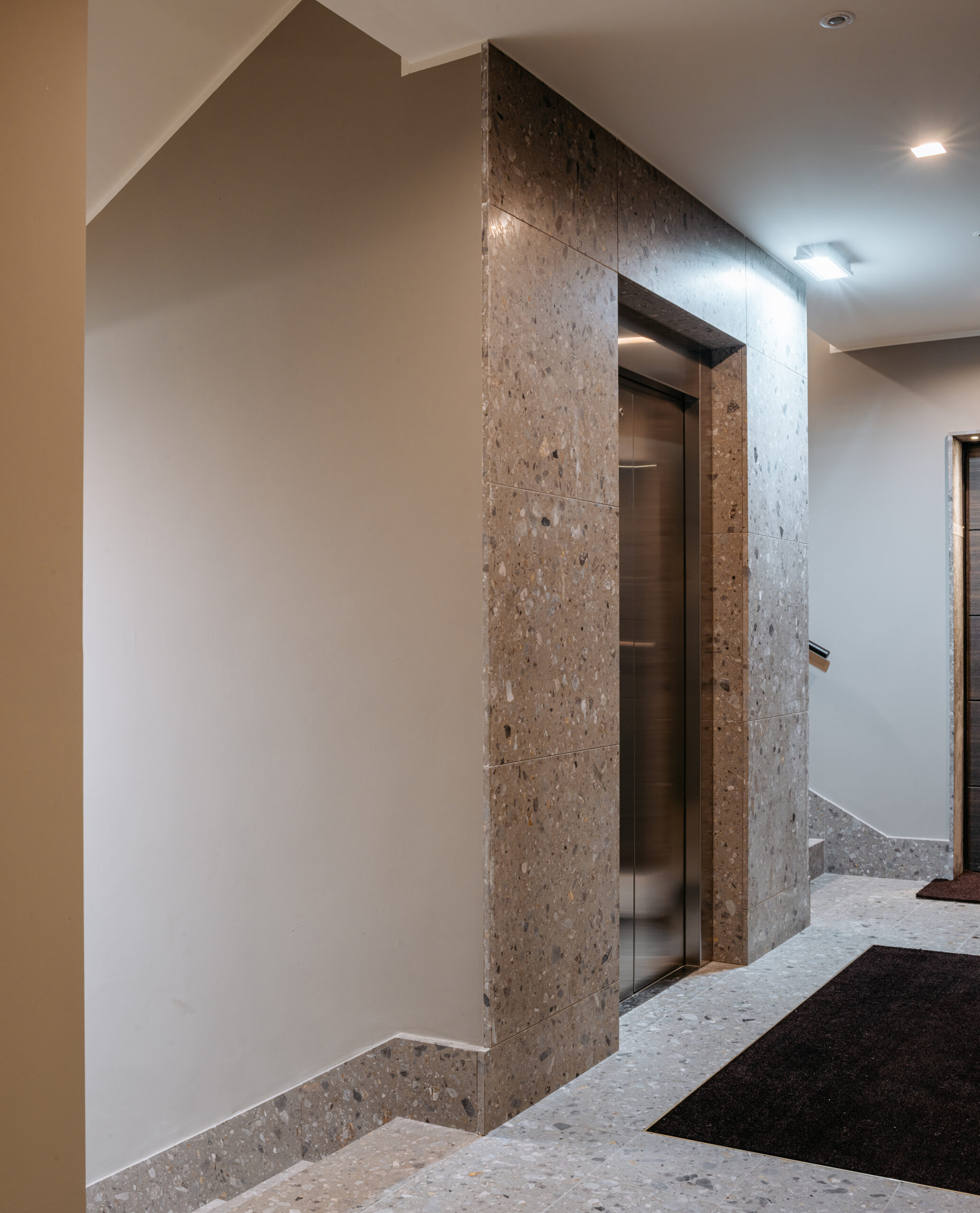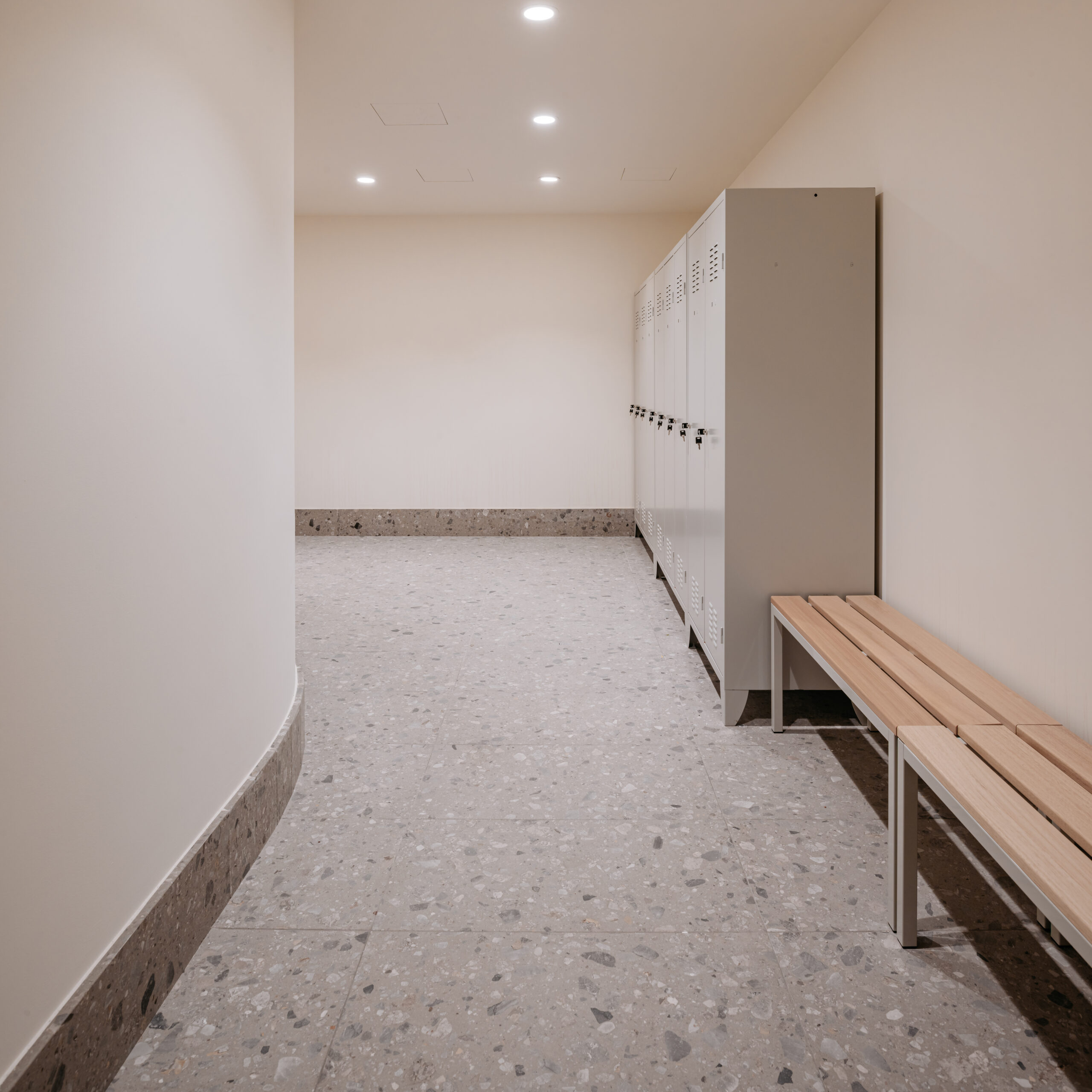 Per il Washington Building Agglotech ha realizzato superfici in terrazzo alla veneziana nella colorazione SB 130 Aggloceppo, utilizzata per pavimenti e rivestimenti di lobby, percorsi, spa e area piscina. Questa tonalità, delicata e naturale, si integra con i materiali architettonici circostanti e sottolinea il carattere contemporaneo del complesso.